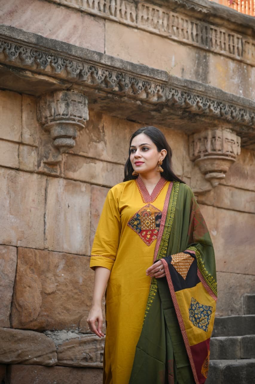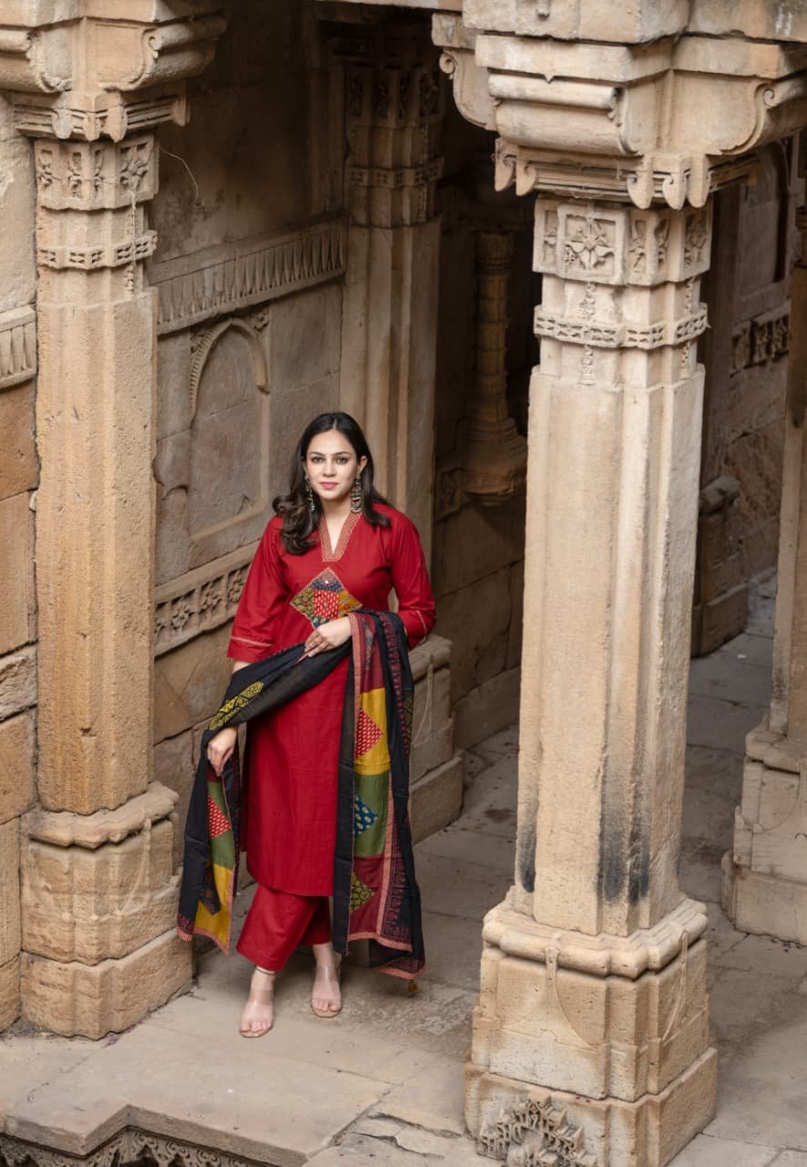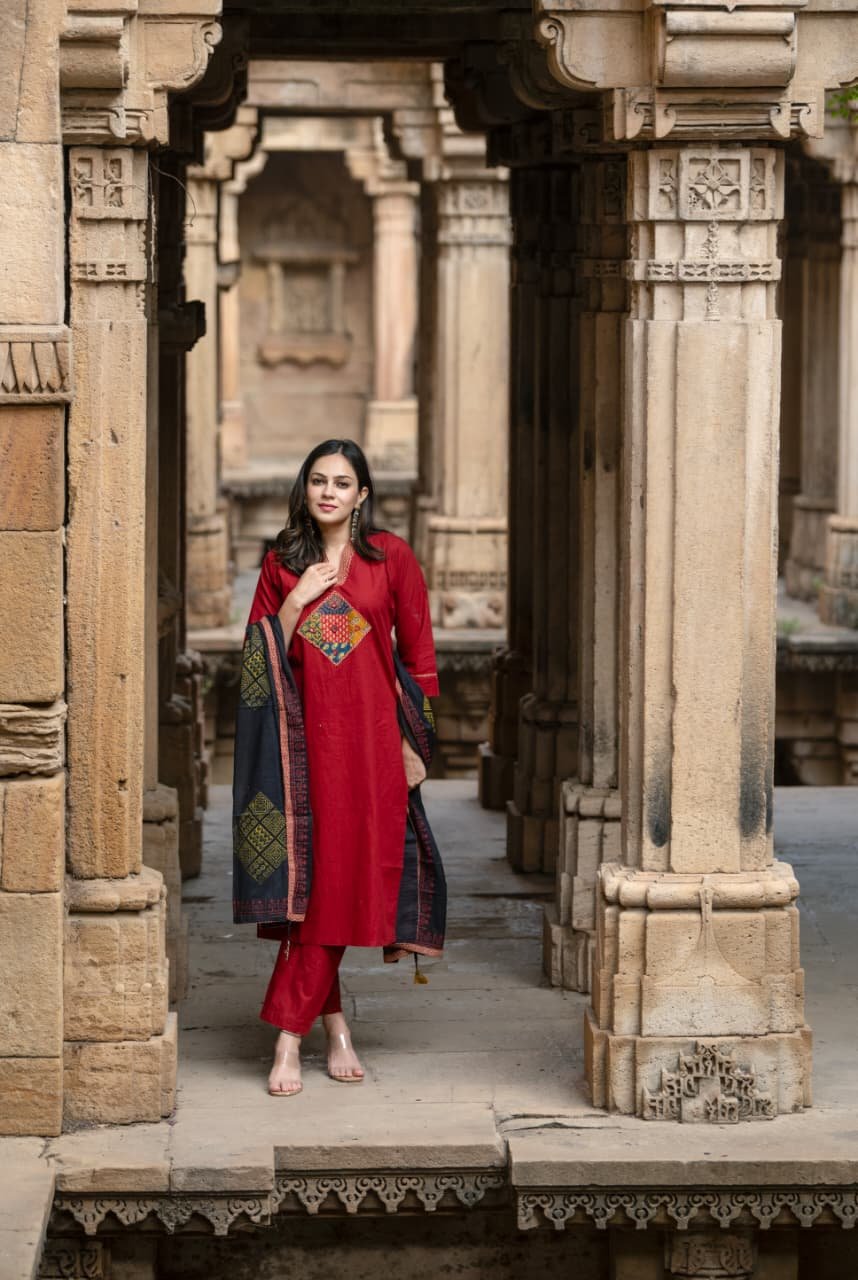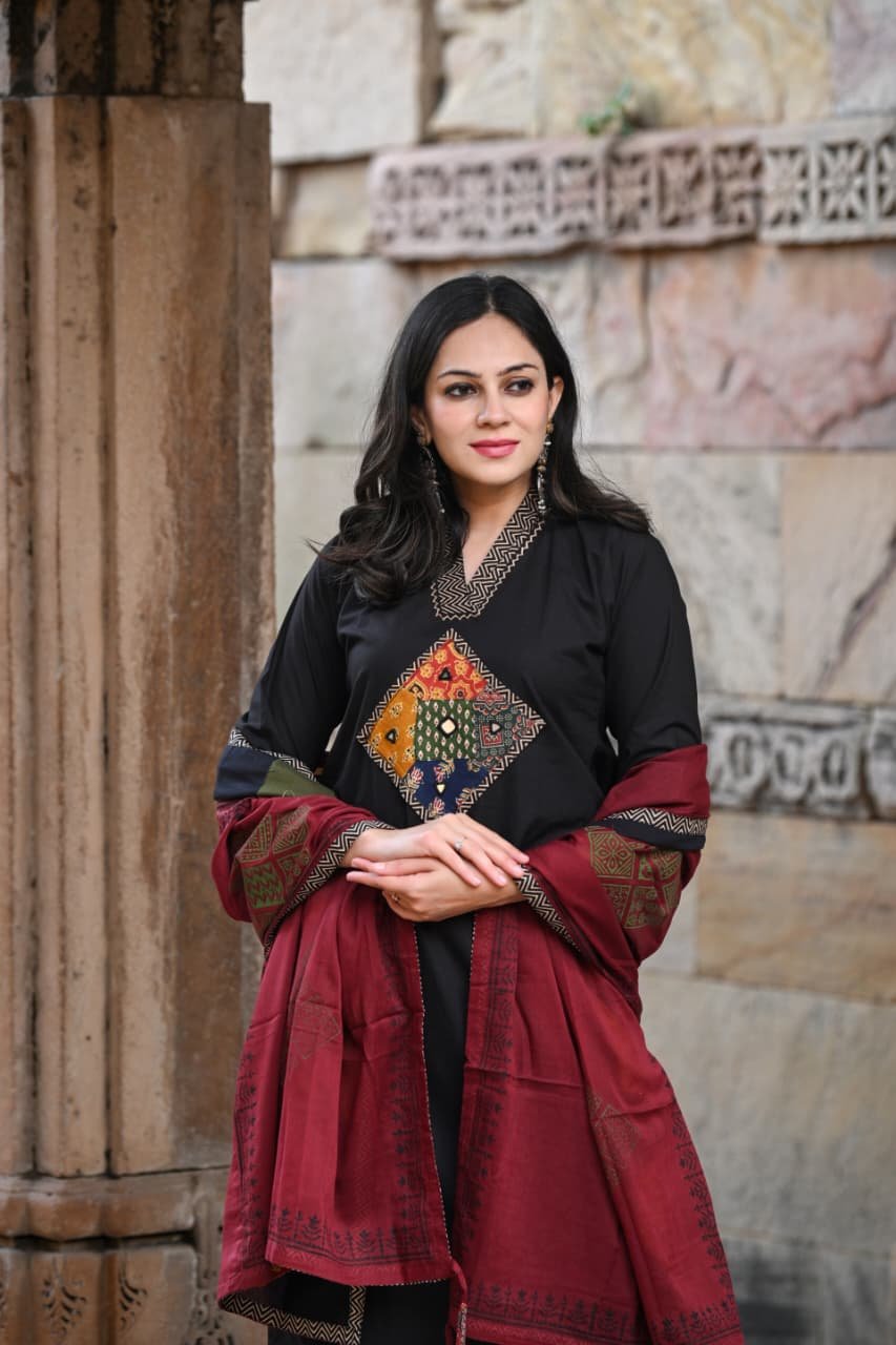 The kurta features original Ajrakh applique work, paired with authentic mirror detailing, giving the outfit a handcrafted artisan touch. The dupatta comes with Ajrakh appliqué patchwork, enhancing the ensemble with richness and cultural elegance.