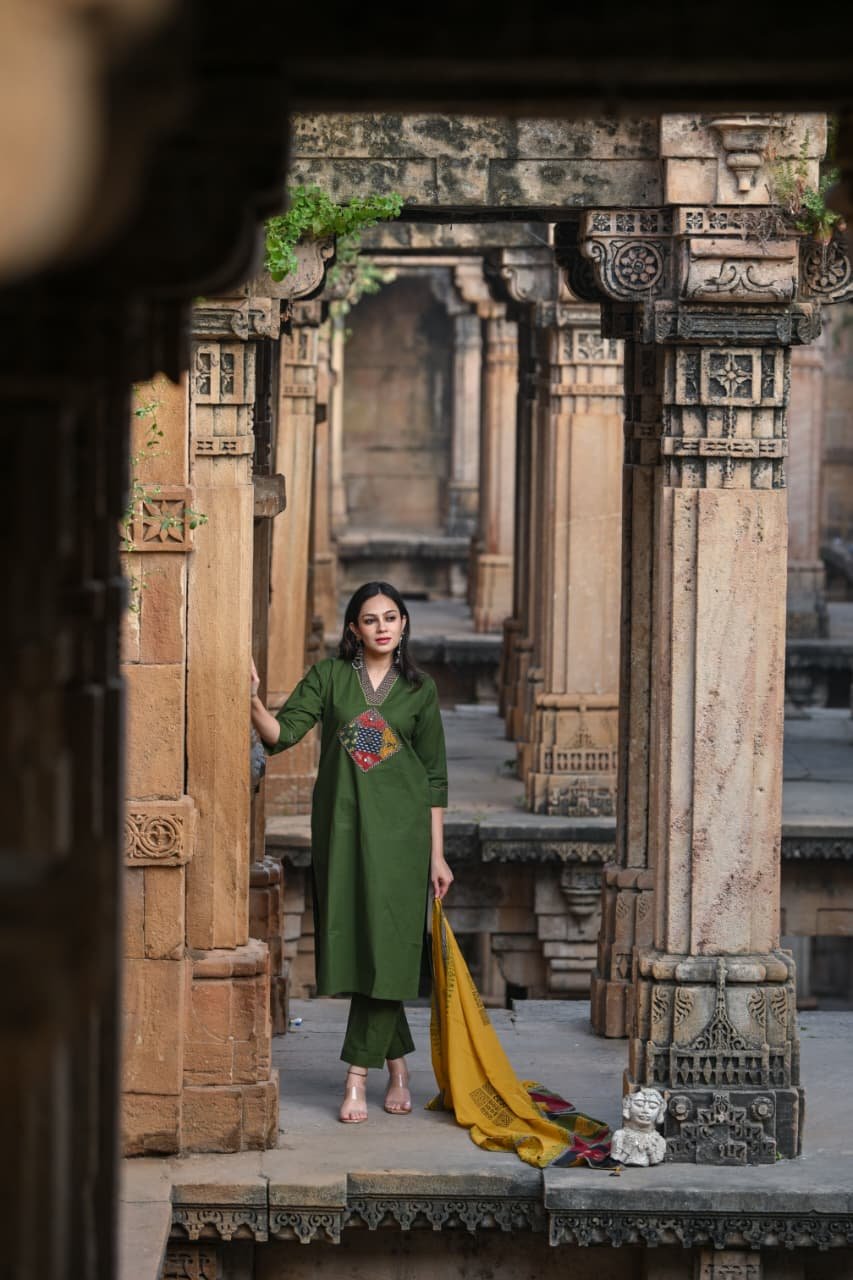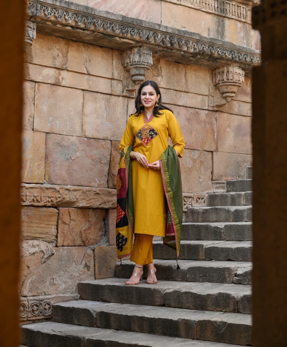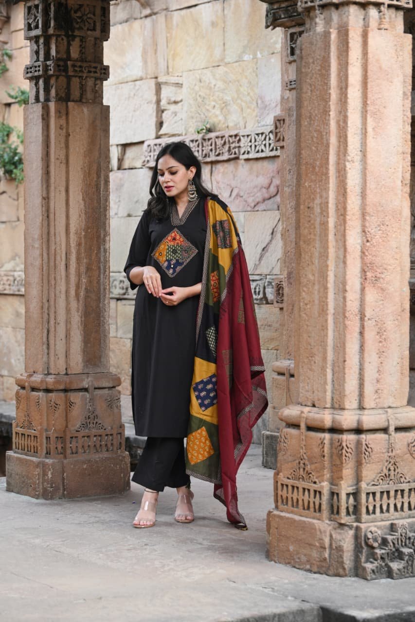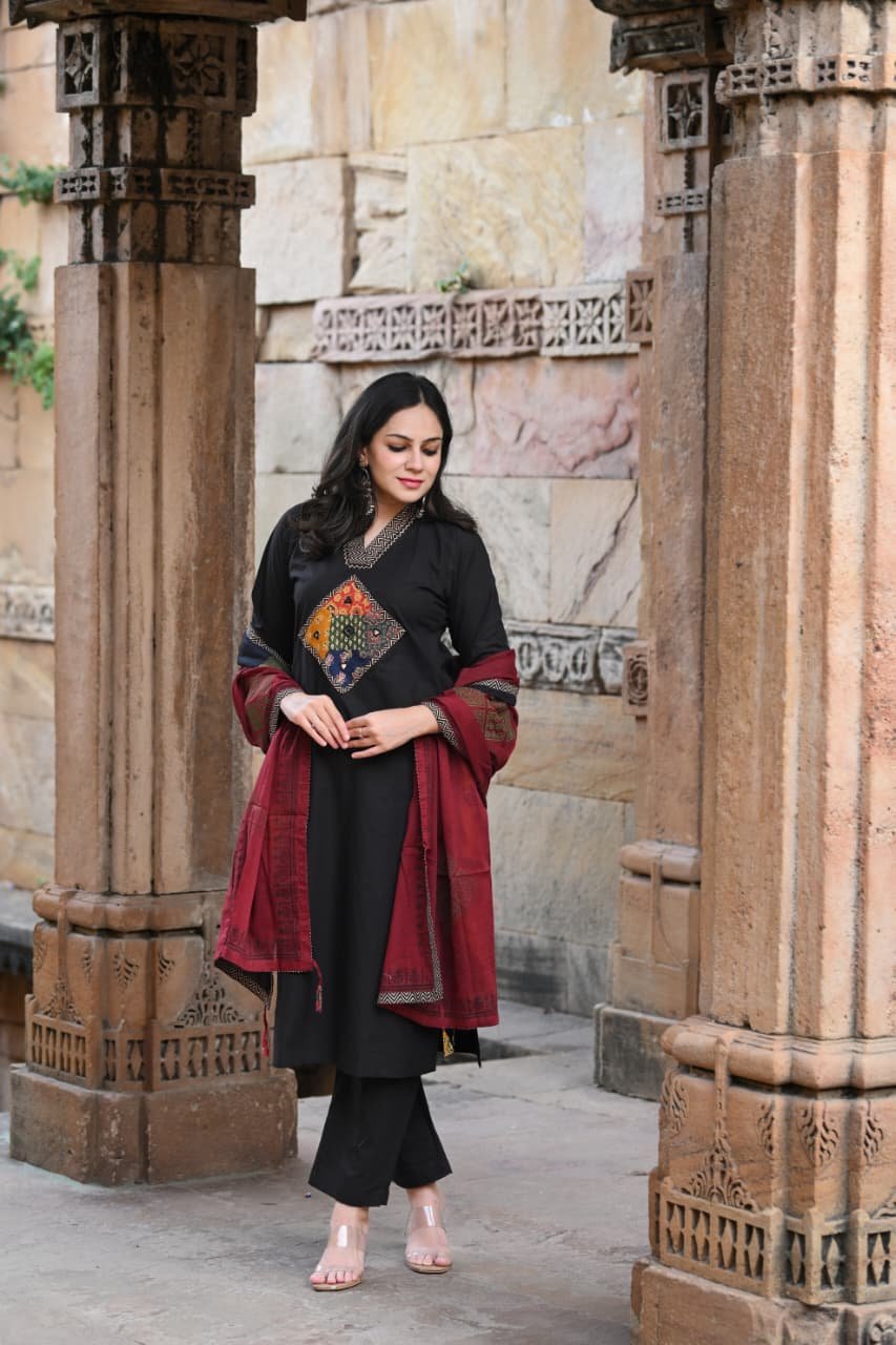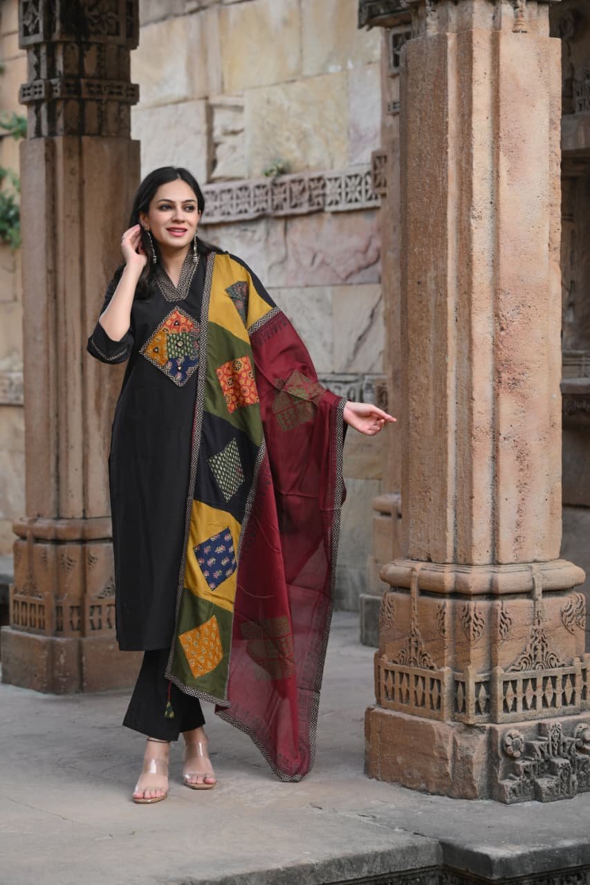 The kurta features original Ajrakh applique work, paired with authentic mirror detailing, giving the outfit a handcrafted artisan touch. The dupatta comes with Ajrakh appliqué patchwork, enhancing the ensemble with richness and cultural elegance.