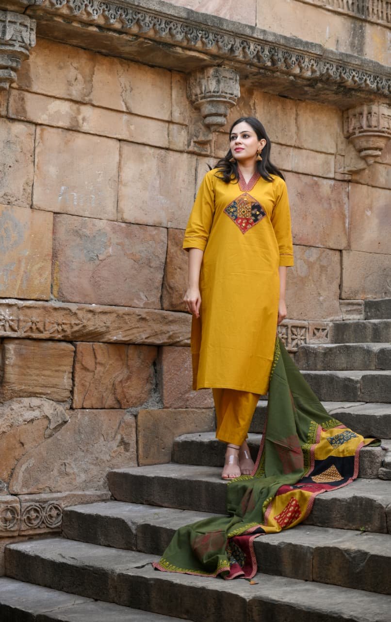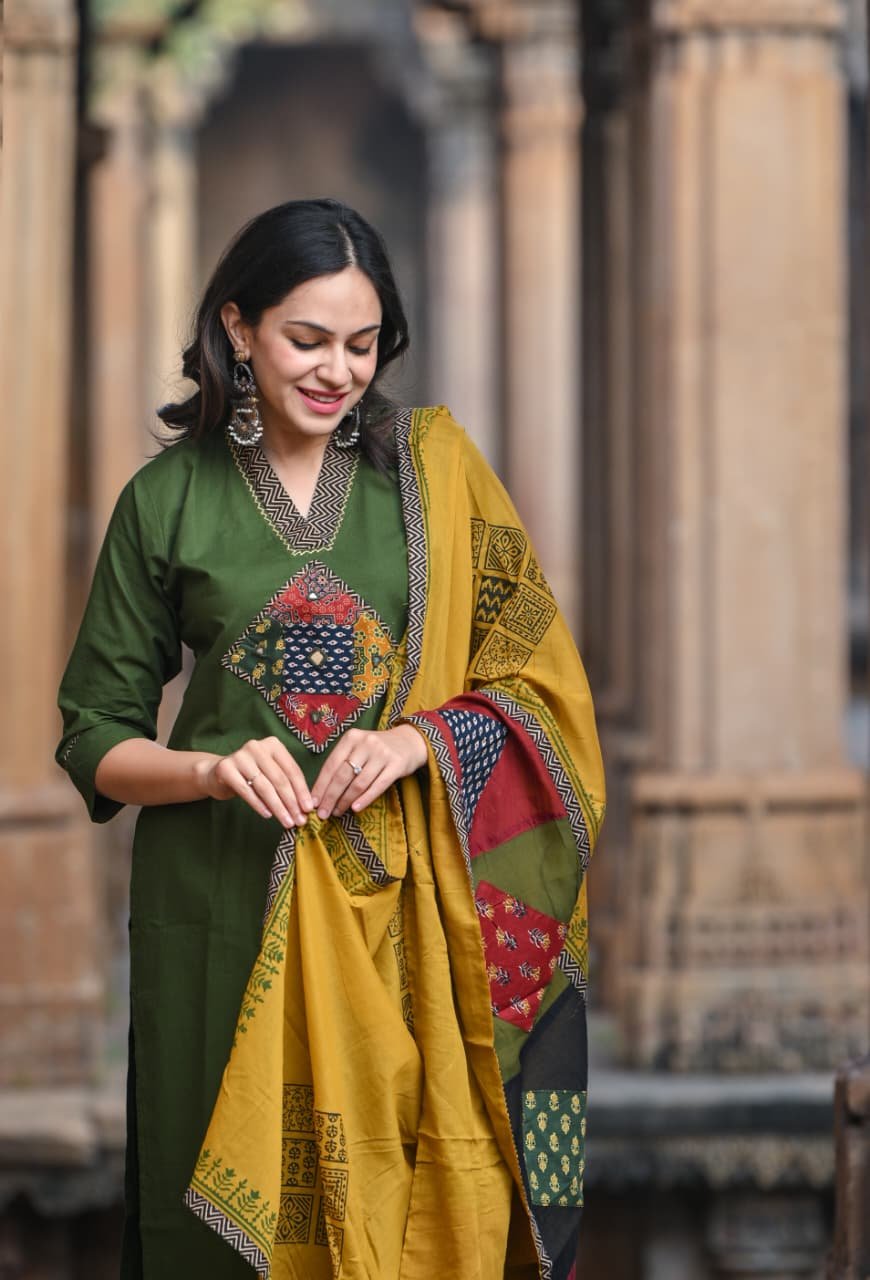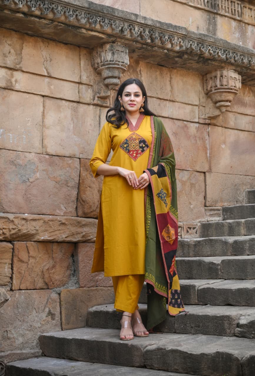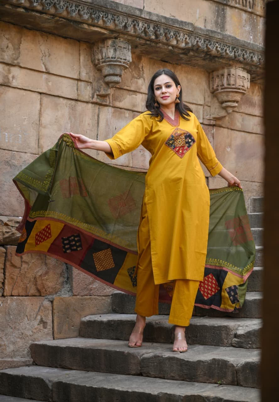 The DU-392 Ajrakh Applique 3PC Suit Set is a beautifully crafted ethnic outfit blending heritage design with modern comfort. Made from pure, breathable cotton, this set ensures all-day comfort while maintaining a refined traditional look.
