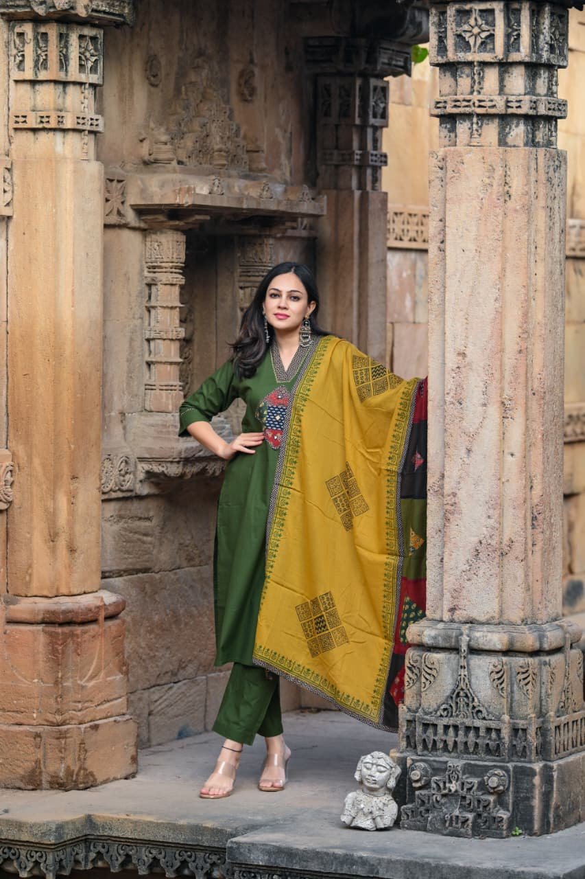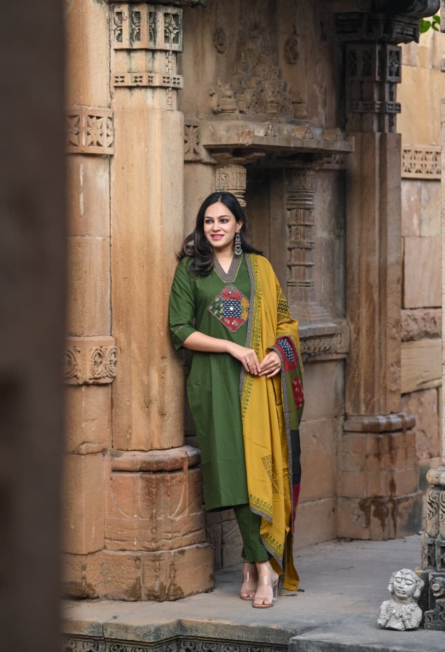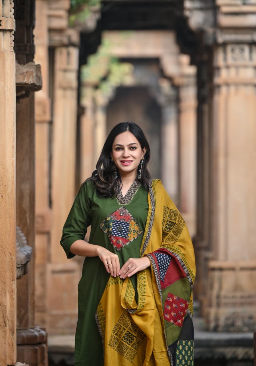 The DU-392 Ajrakh Applique 3PC Suit Set is a beautifully crafted ethnic outfit blending heritage design with modern comfort. Made from pure, breathable cotton, this set ensures all-day comfort while maintaining a refined traditional look.