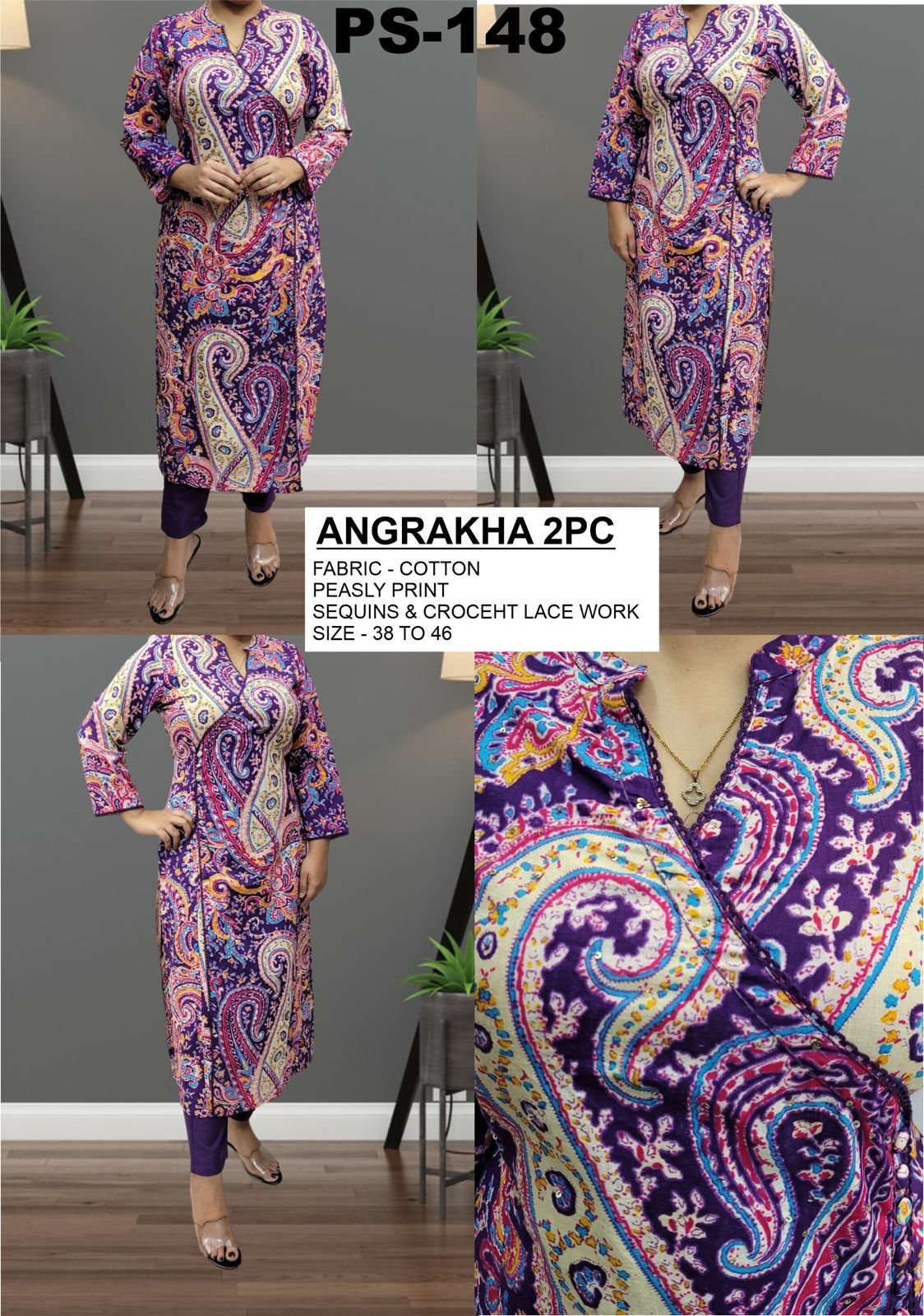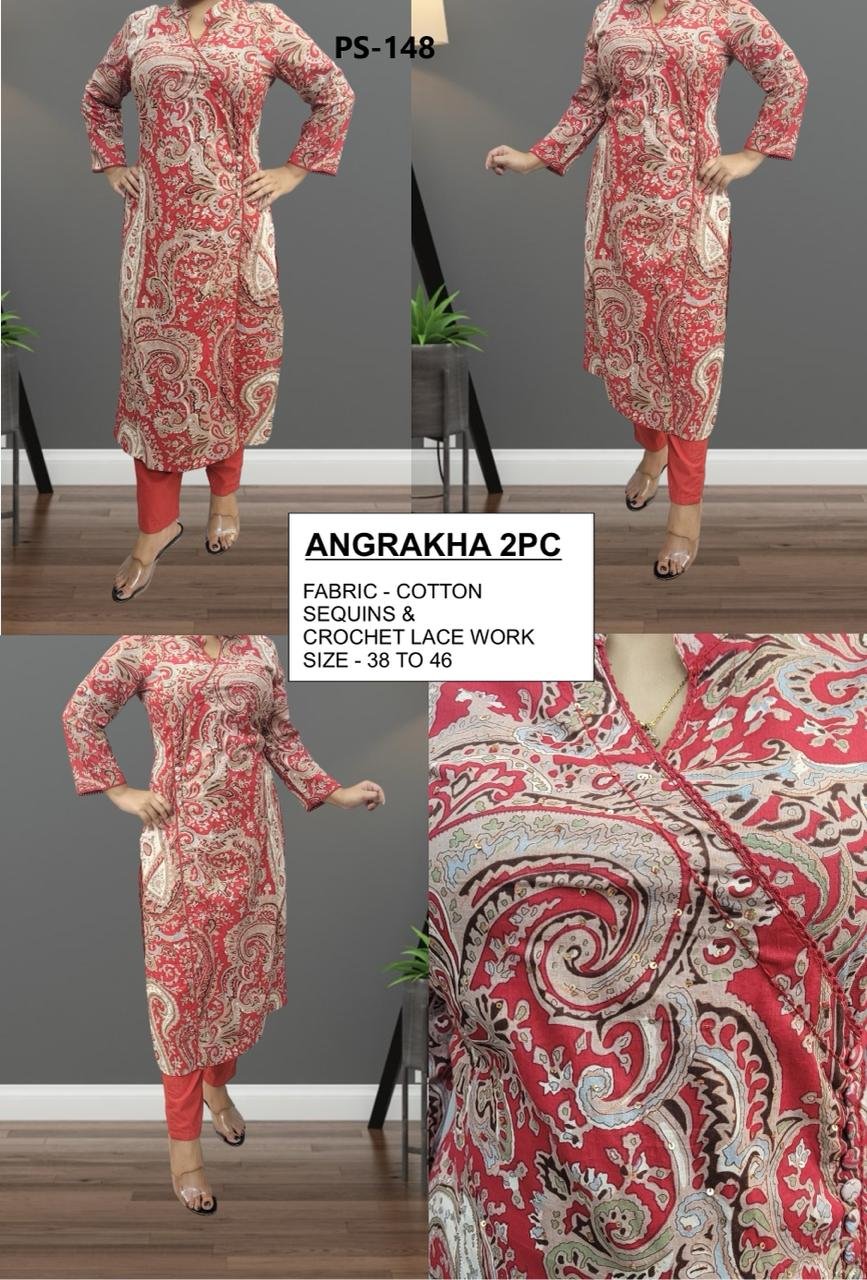 The PS-148 Cotton Angrakha 2PC Set is a graceful ethnic ensemble designed for women who love classic silhouettes with fine detailing. Crafted from soft, breathable cotton, it ensures comfort throughout the day.