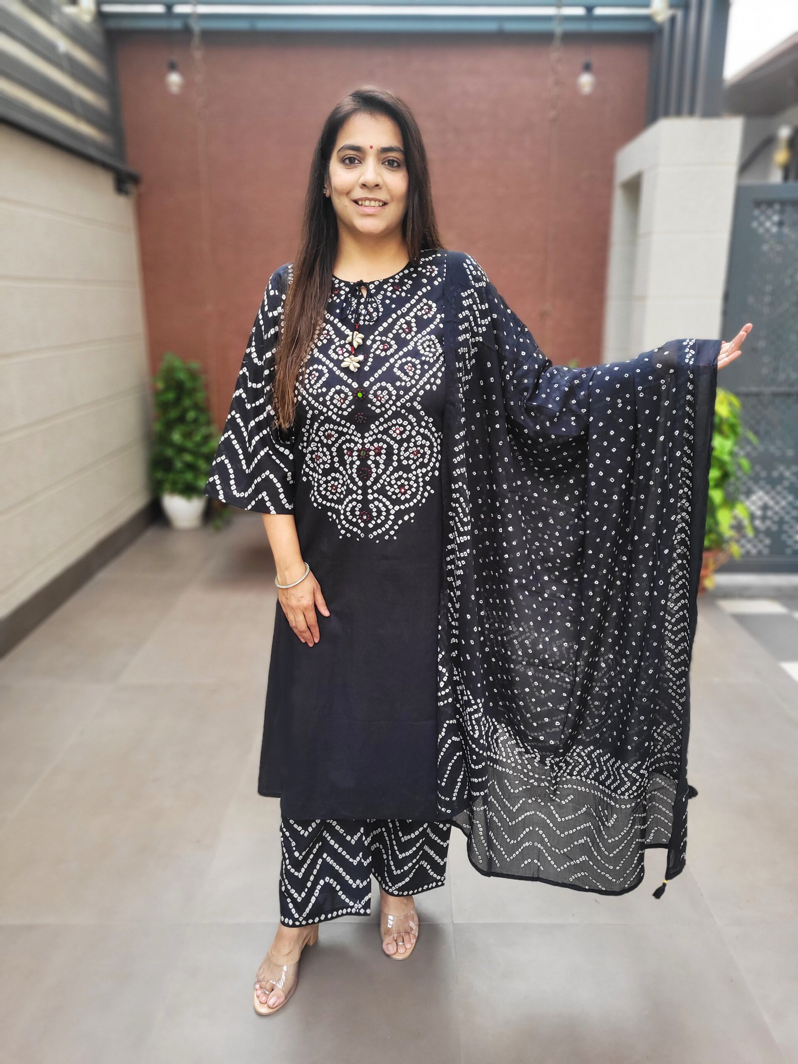 The DU-288 Bandhej 3PC Set beautifully blends tradition, comfort, and style. Crafted from premium cotton, this outfit ensures all-day ease while showcasing timeless Bandhej artistry. The kurta is adorned with delicate mirror work that adds just the right touch of festive shine—subtle yet captivating.
