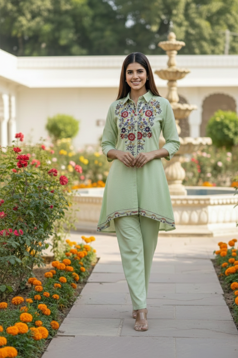 The CS-125 Co-Ord Set is crafted from textured cotton dobby fabric, offering comfort with understated elegance. The embroidery adds refined detailing, making it perfect for everyday ethnic wear and office styling.