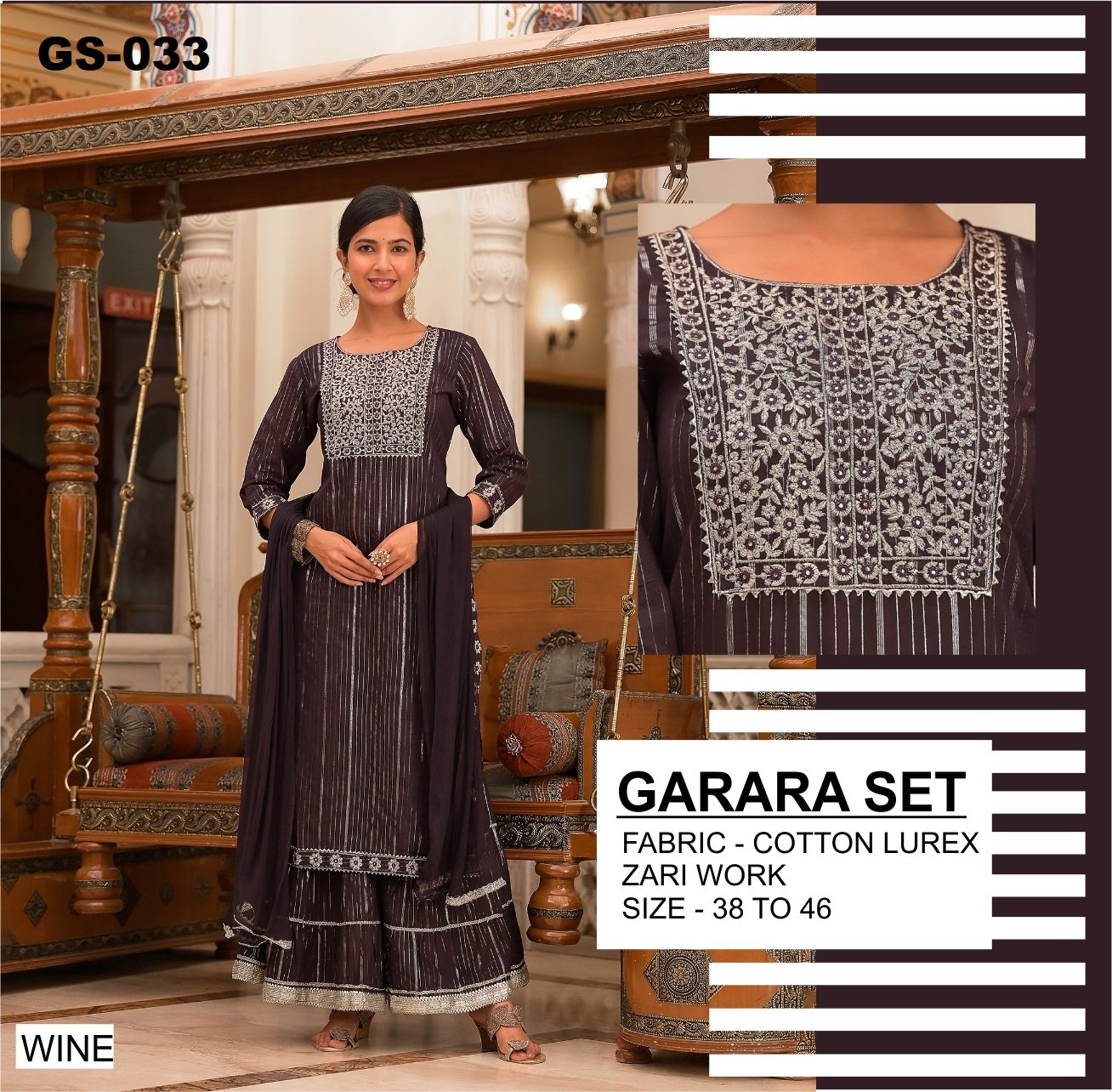 The GS-033 Garara Set brings traditional elegance to life with premium cotton lurex fabric that offers both comfort and a soft festive shimmer. The classic garara silhouette adds volume and drama, making it perfect for celebrations.