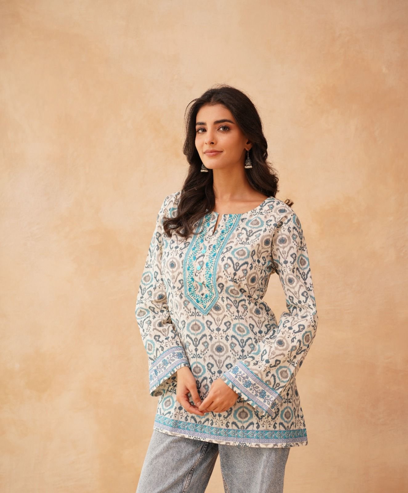 Its simple yet stylish design makes it easy to pair with jeans, trousers, or leggings, creating a versatile look perfect for casual outings, work, or daily wear. The lightweight fabric ensures all-day comfort while maintaining a chic appearance.