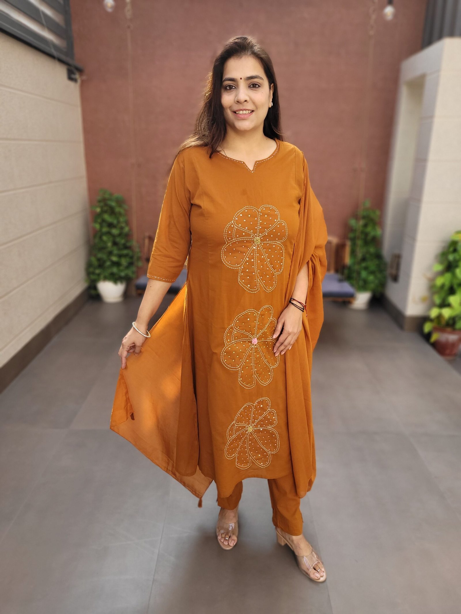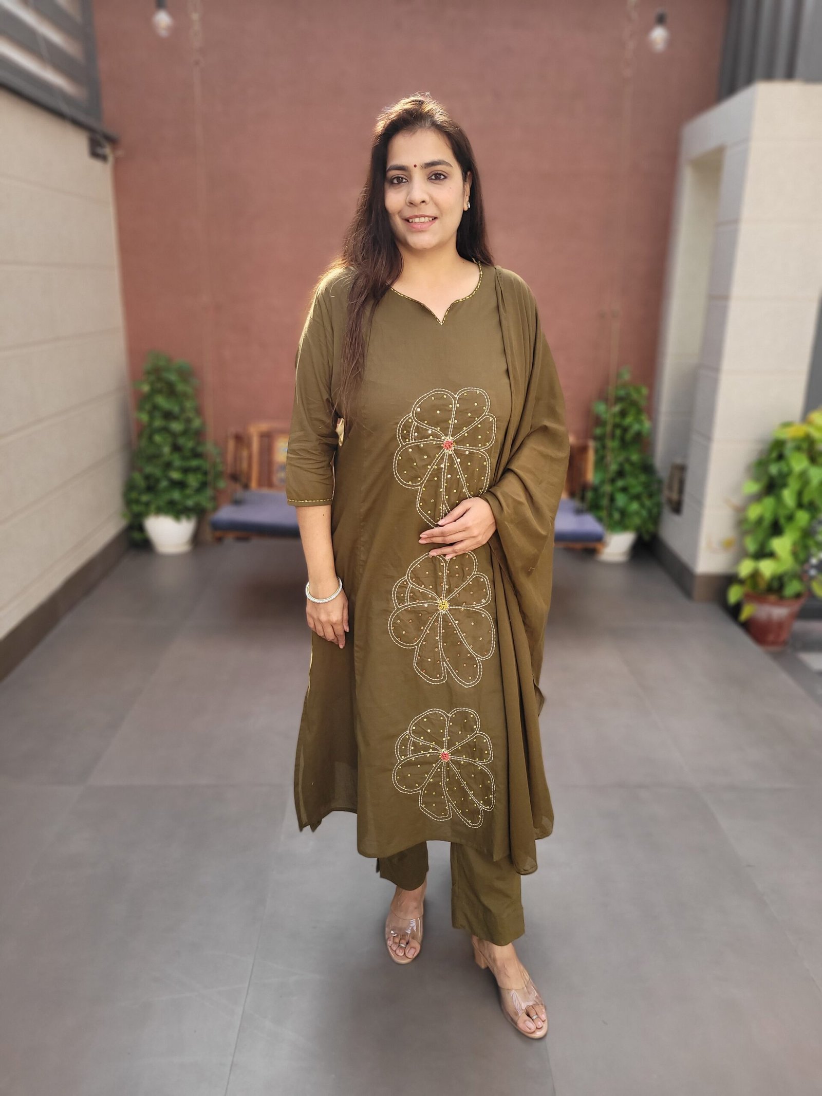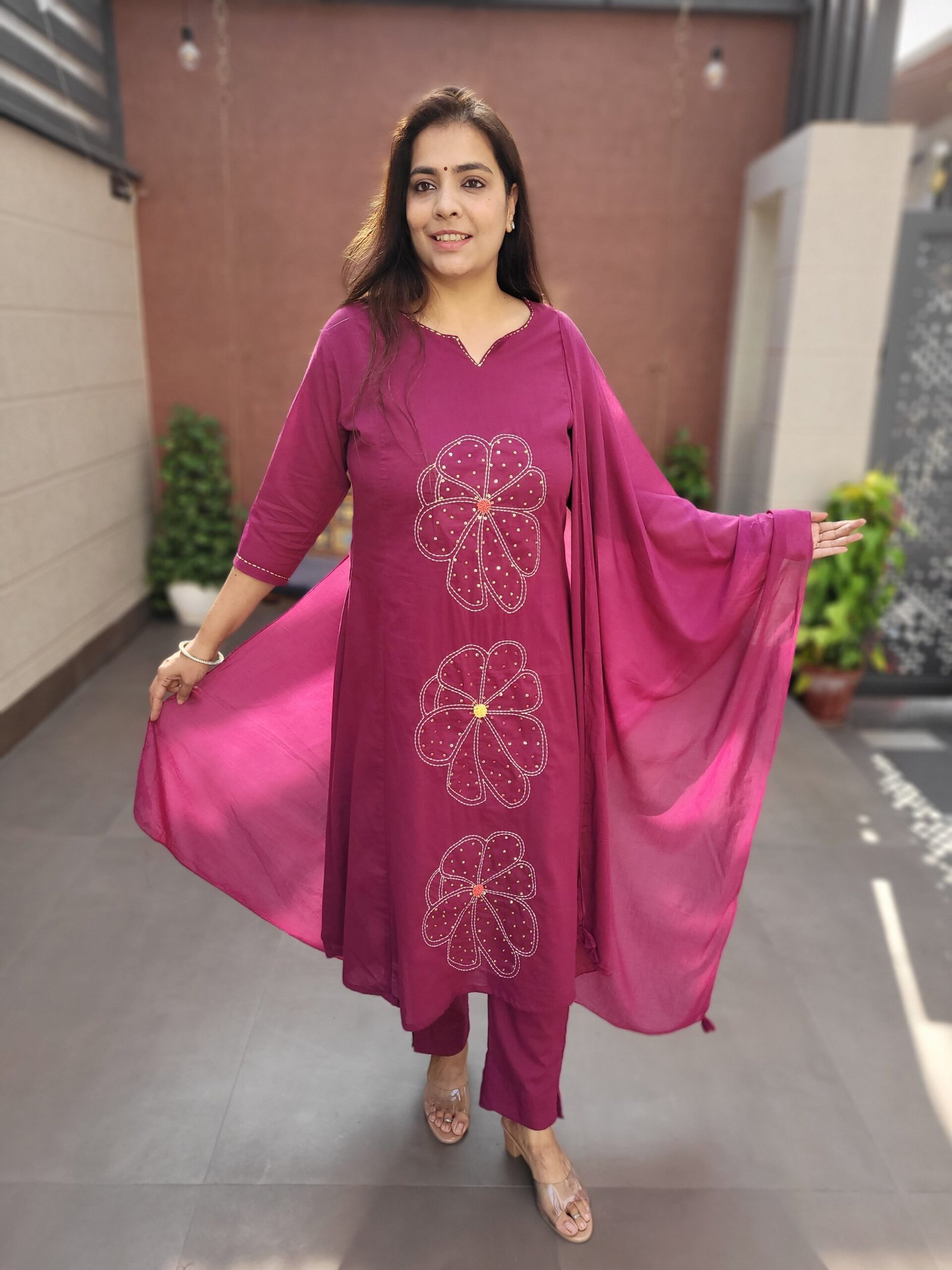 The DU-363 Cotton Silli 3PC Set features delicate thread and sequin work with a flattering A-line silhouette, making it ideal for festive daytime wear and casual celebrations.