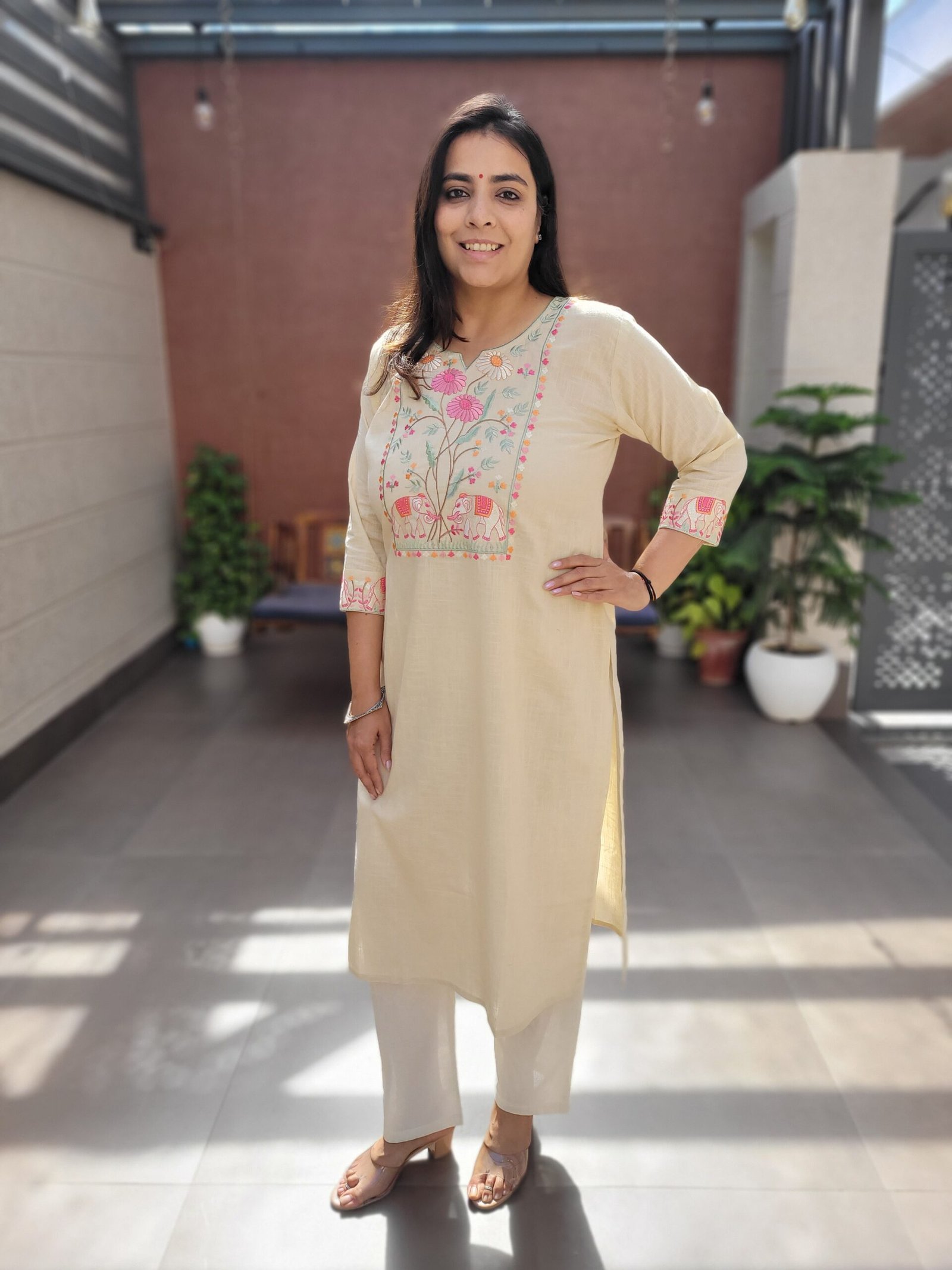 Featuring a beautifully embroidered yoke and matching embroidered sleeves, this kurti adds subtle sophistication while keeping the style minimal and versatile. Ideal for daily wear, office looks, and casual outings, it pairs easily with pants, palazzos, or denim.