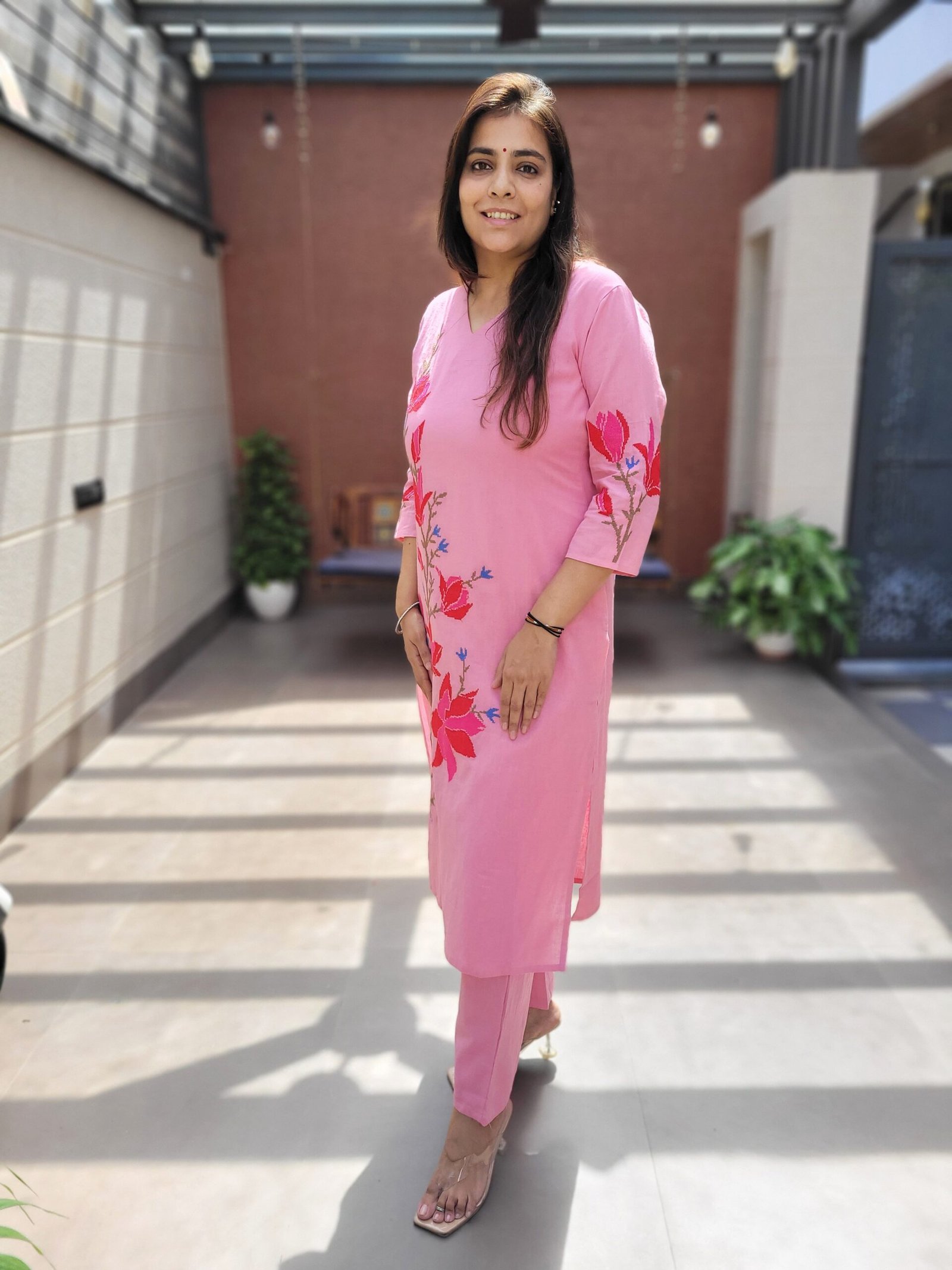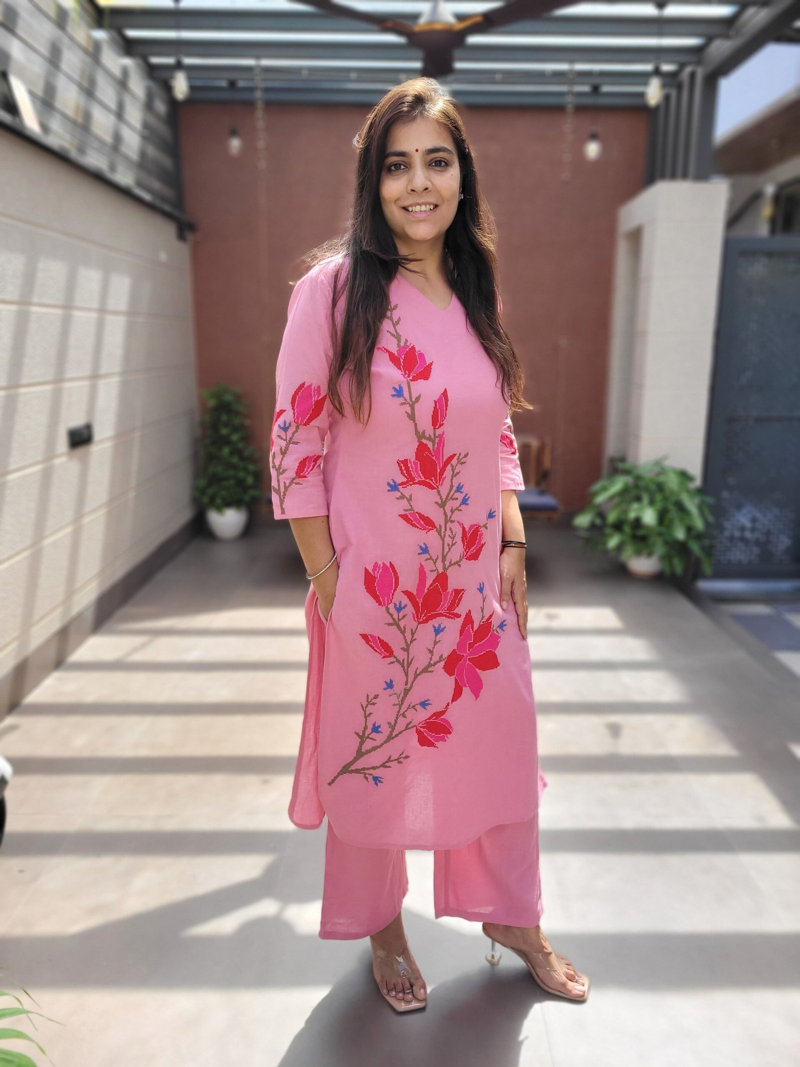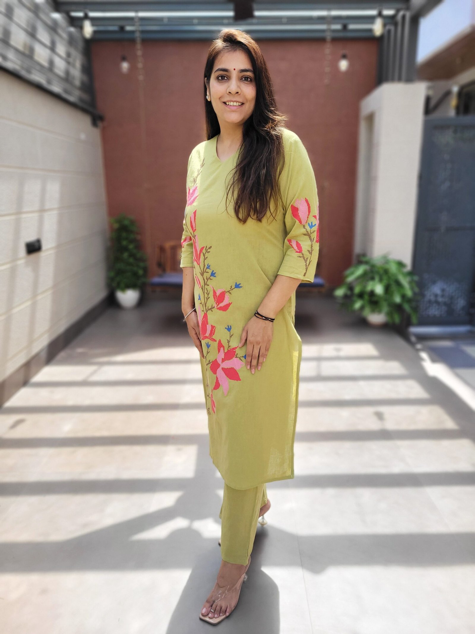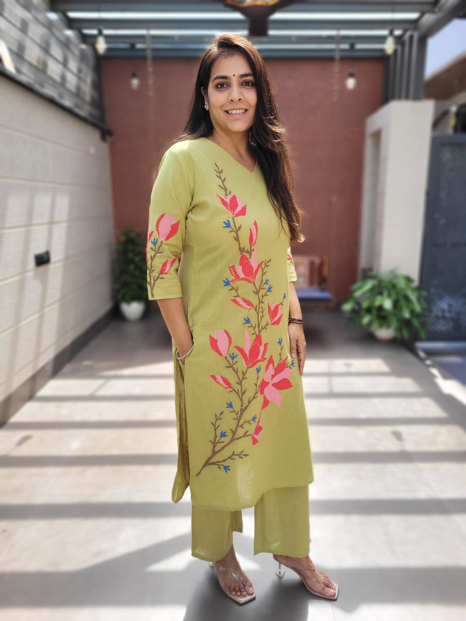 Adorned with beautiful cross stitch embroidery, the outfit brings timeless craftsmanship into a modern silhouette. Ideal for casual outings, festive gatherings, or semi-formal occasions, this 2-piece set offers versatility and effortless charm.