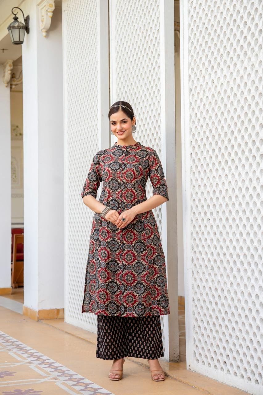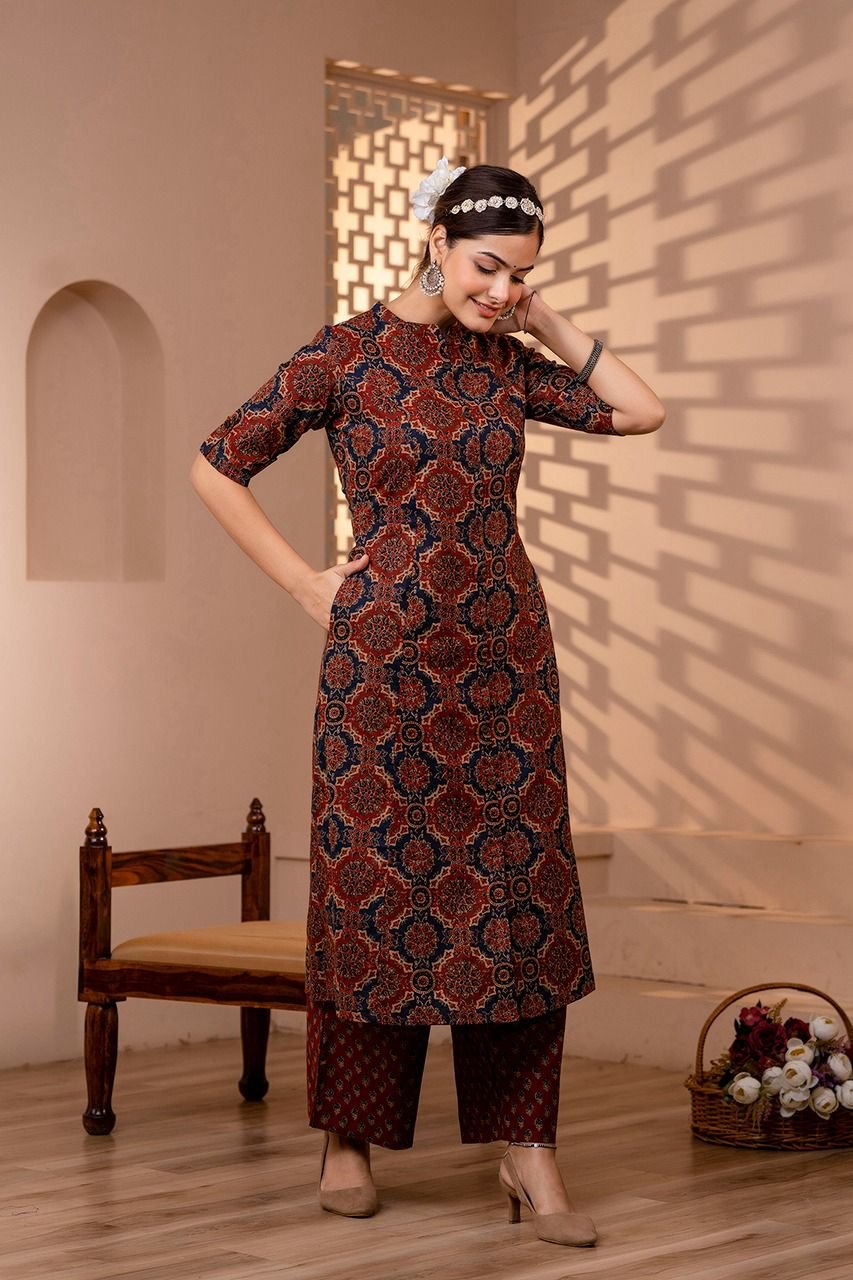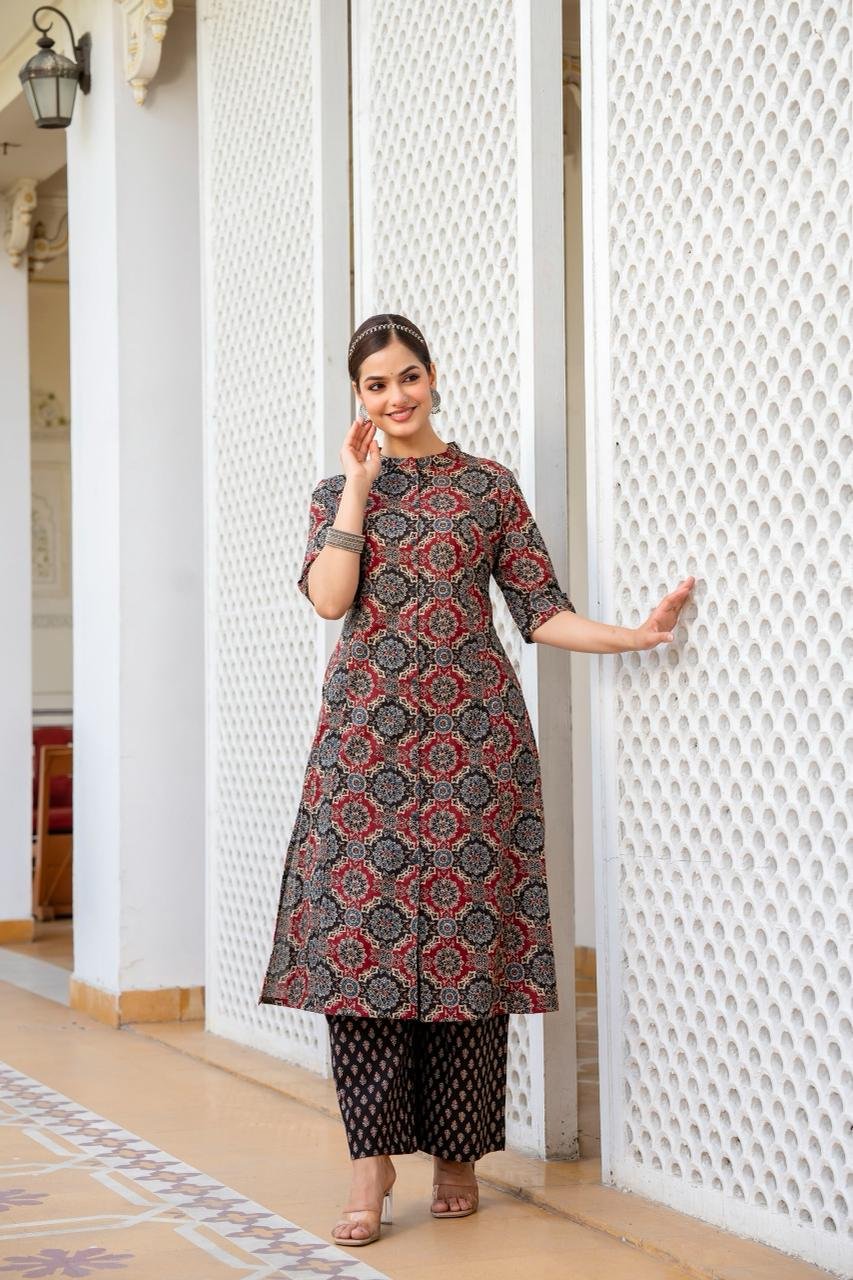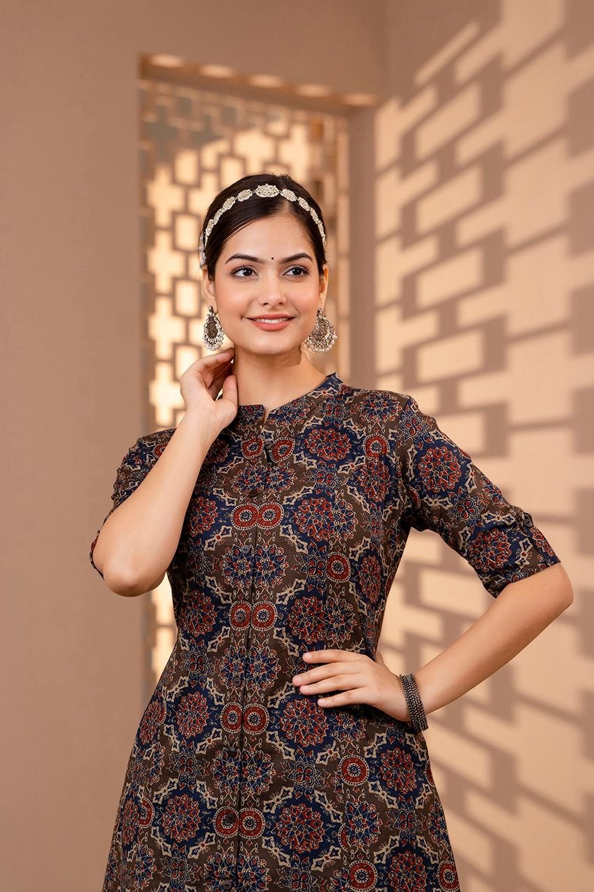 The kurta features a flattering princess cut silhouette, enhanced with timeless Ajrakh print and elegant wooden button detailing. Paired with trendy culottes palazzo bottoms, this outfit gives a modern yet graceful look. The double pockets add both style and practicality.