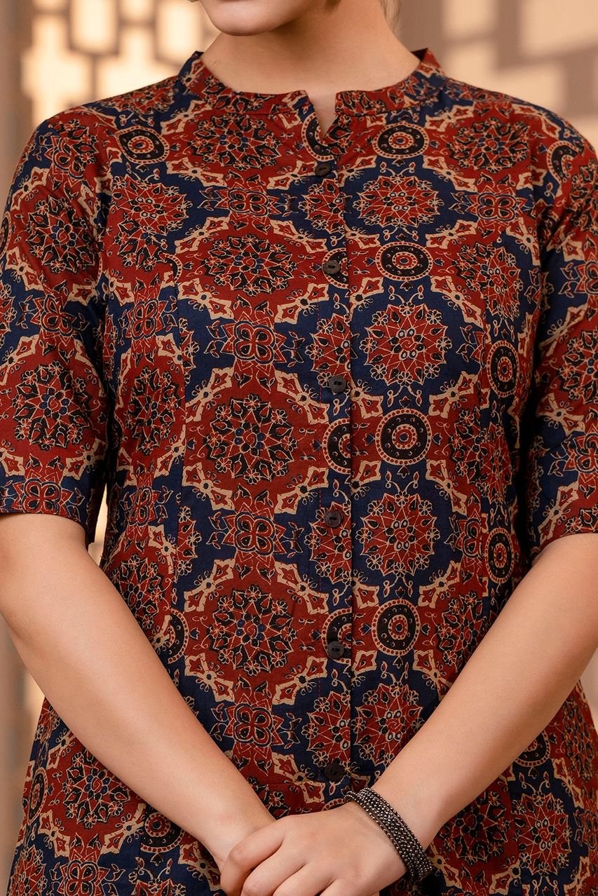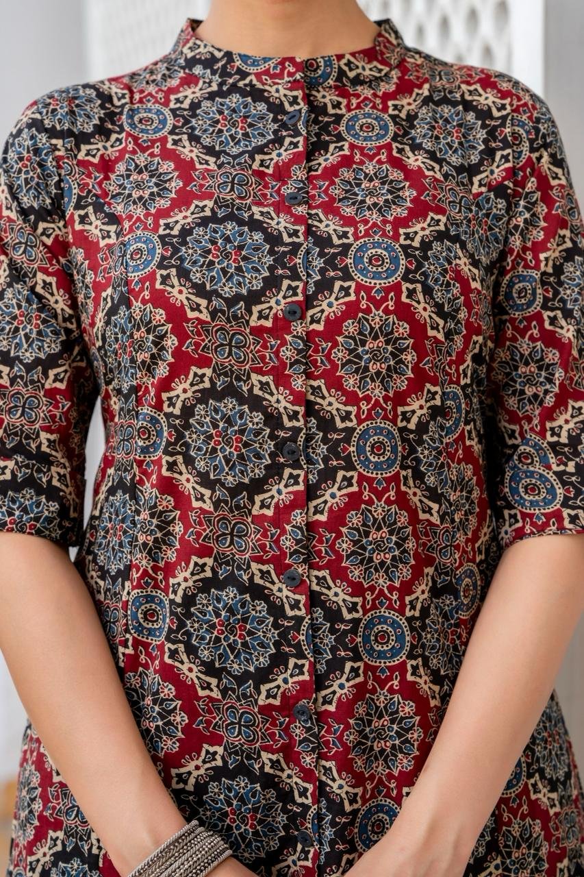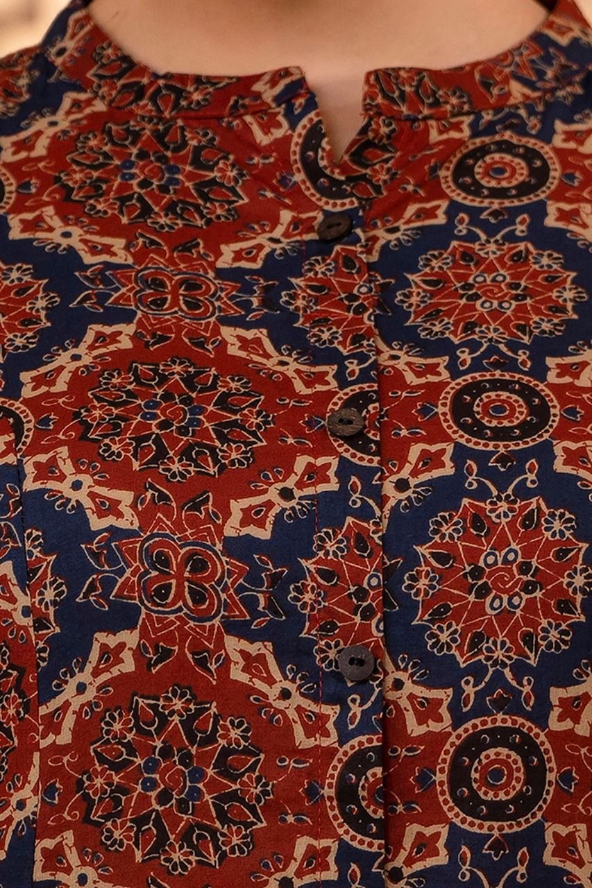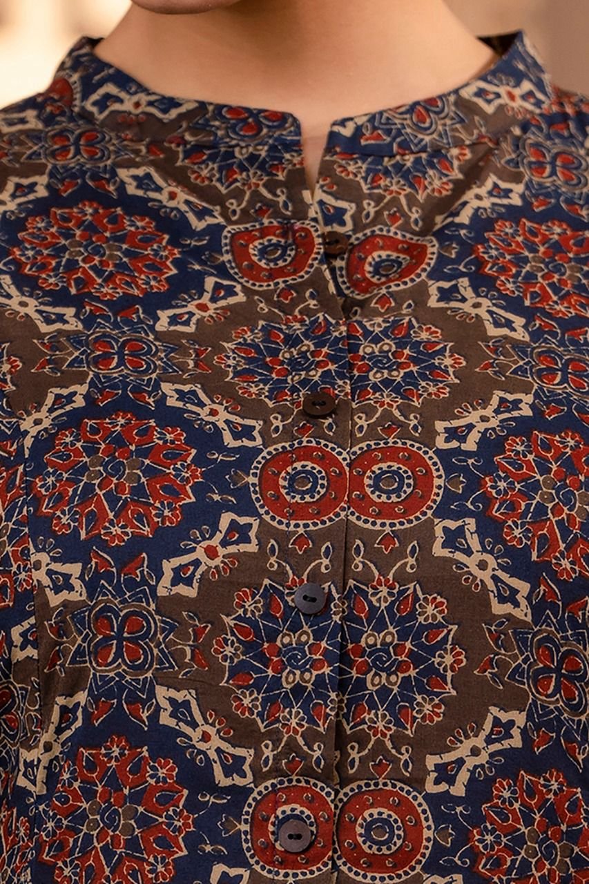 The kurta features a flattering princess cut silhouette, enhanced with timeless Ajrakh print and elegant wooden button detailing. Paired with trendy culottes palazzo bottoms, this outfit gives a modern yet graceful look. The double pockets add both style and practicality.