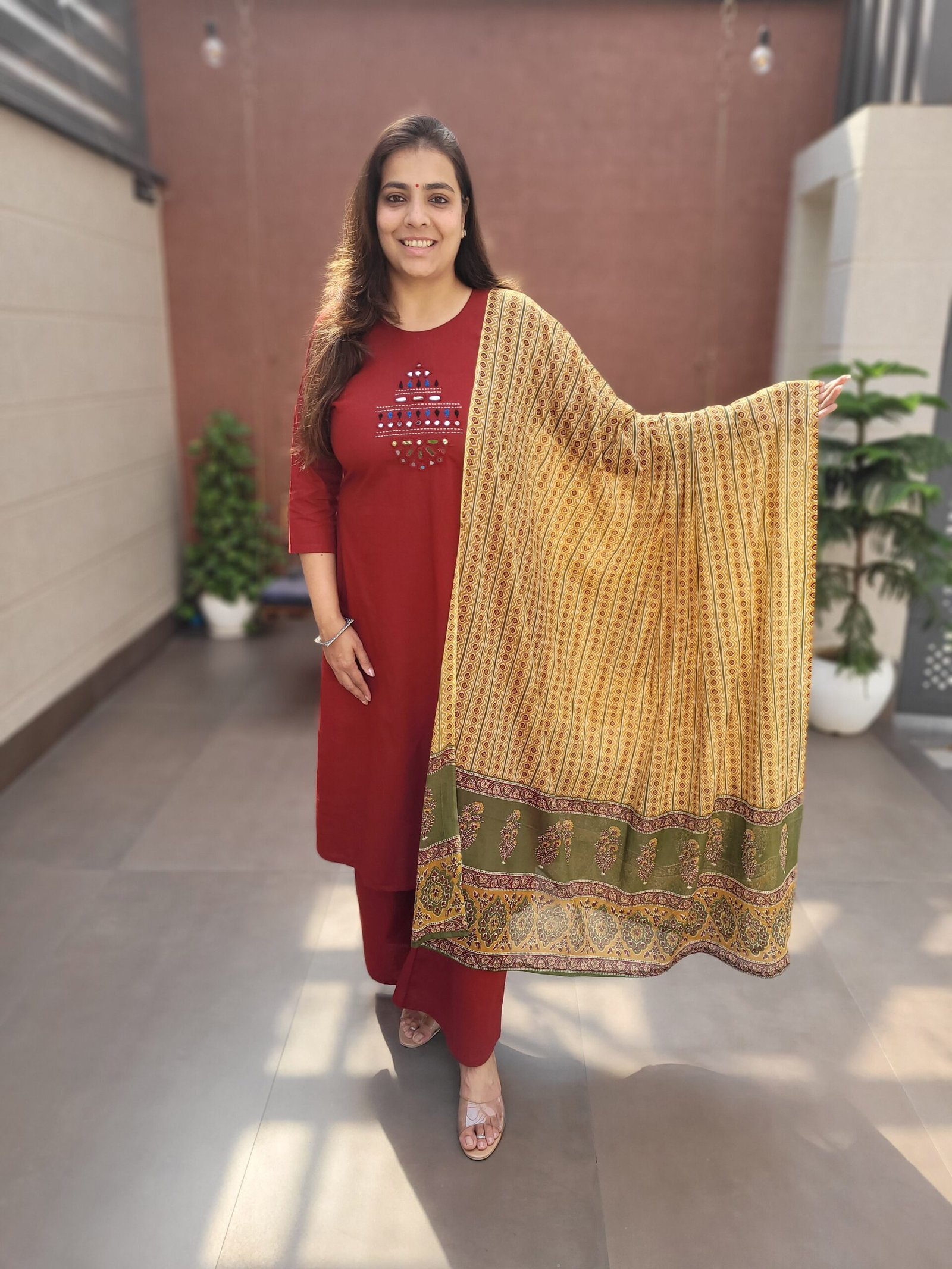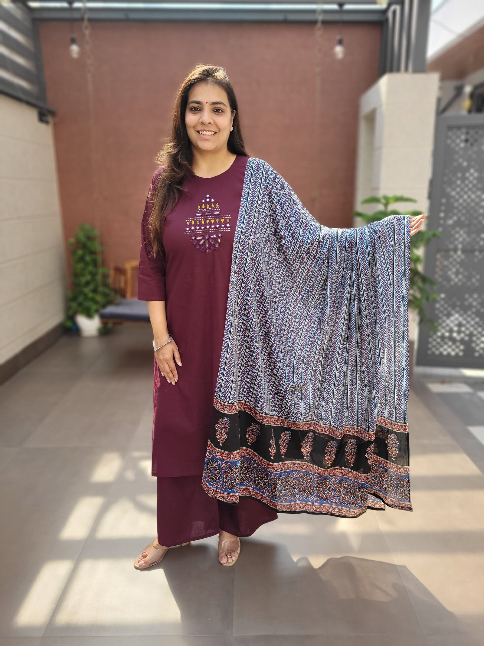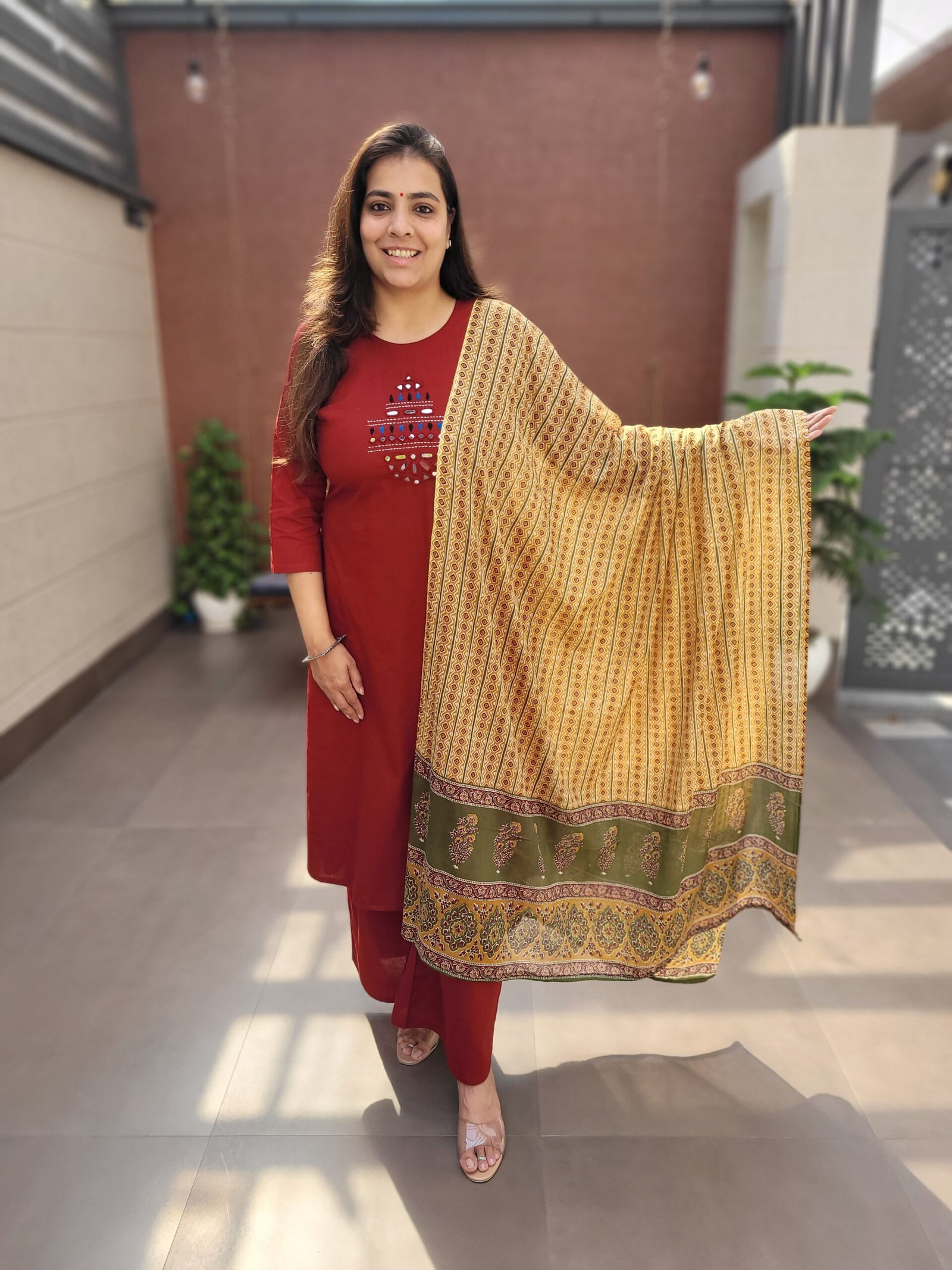Double side pockets add practicality, while the Ajrakh print dupatta enhances the traditional appeal. Ideal for festive wear, cultural outings, and statement everyday fashion.