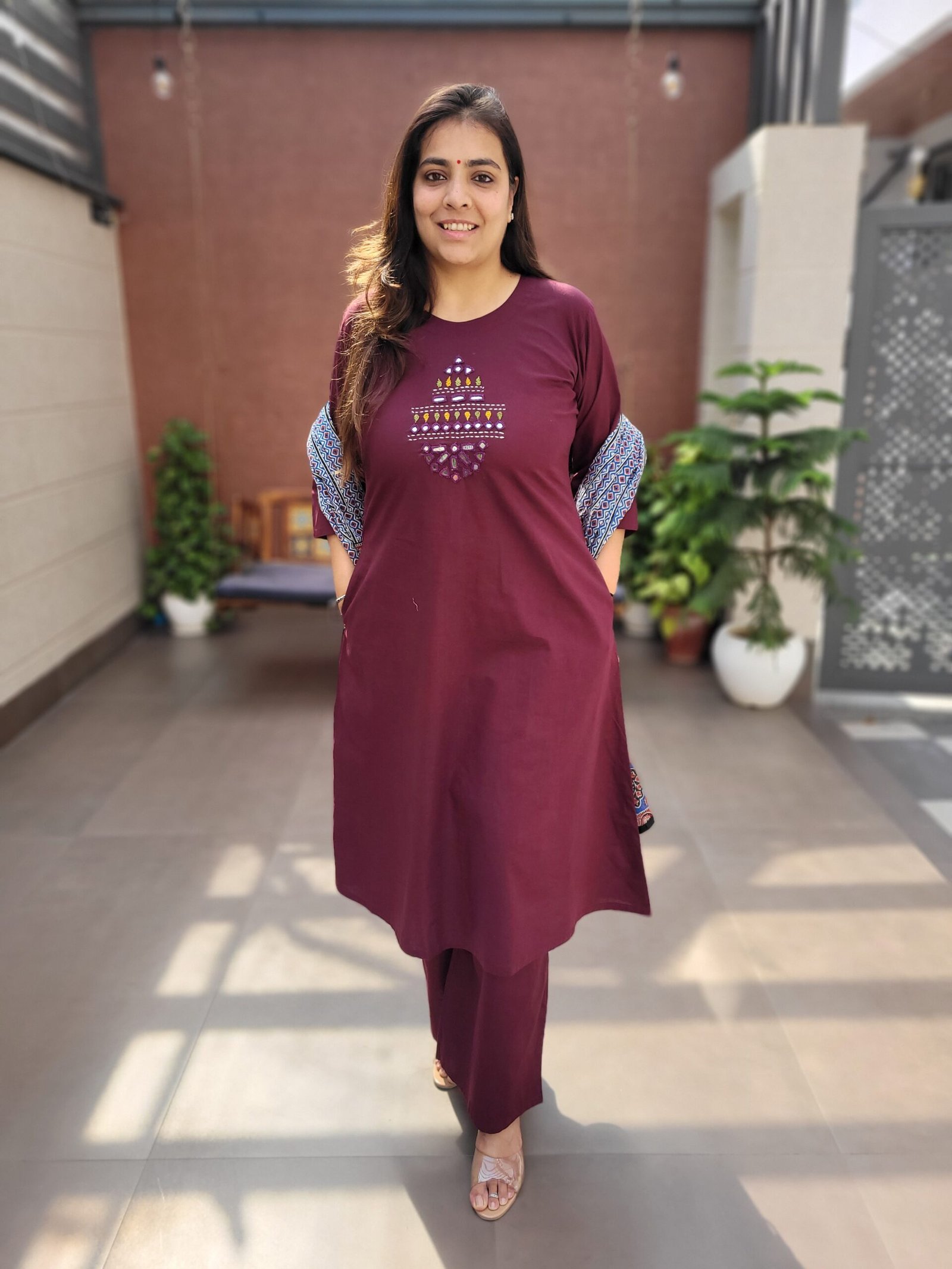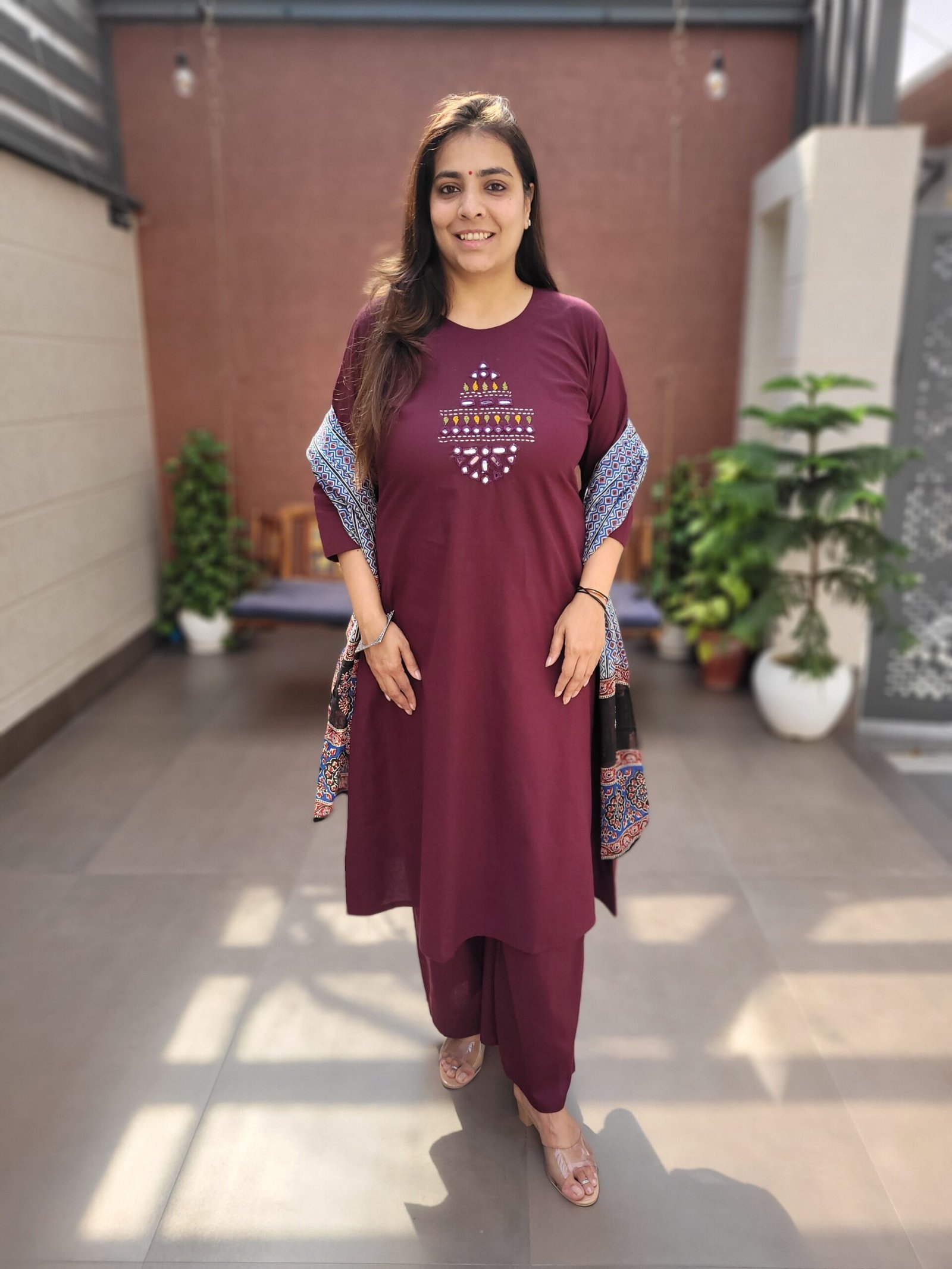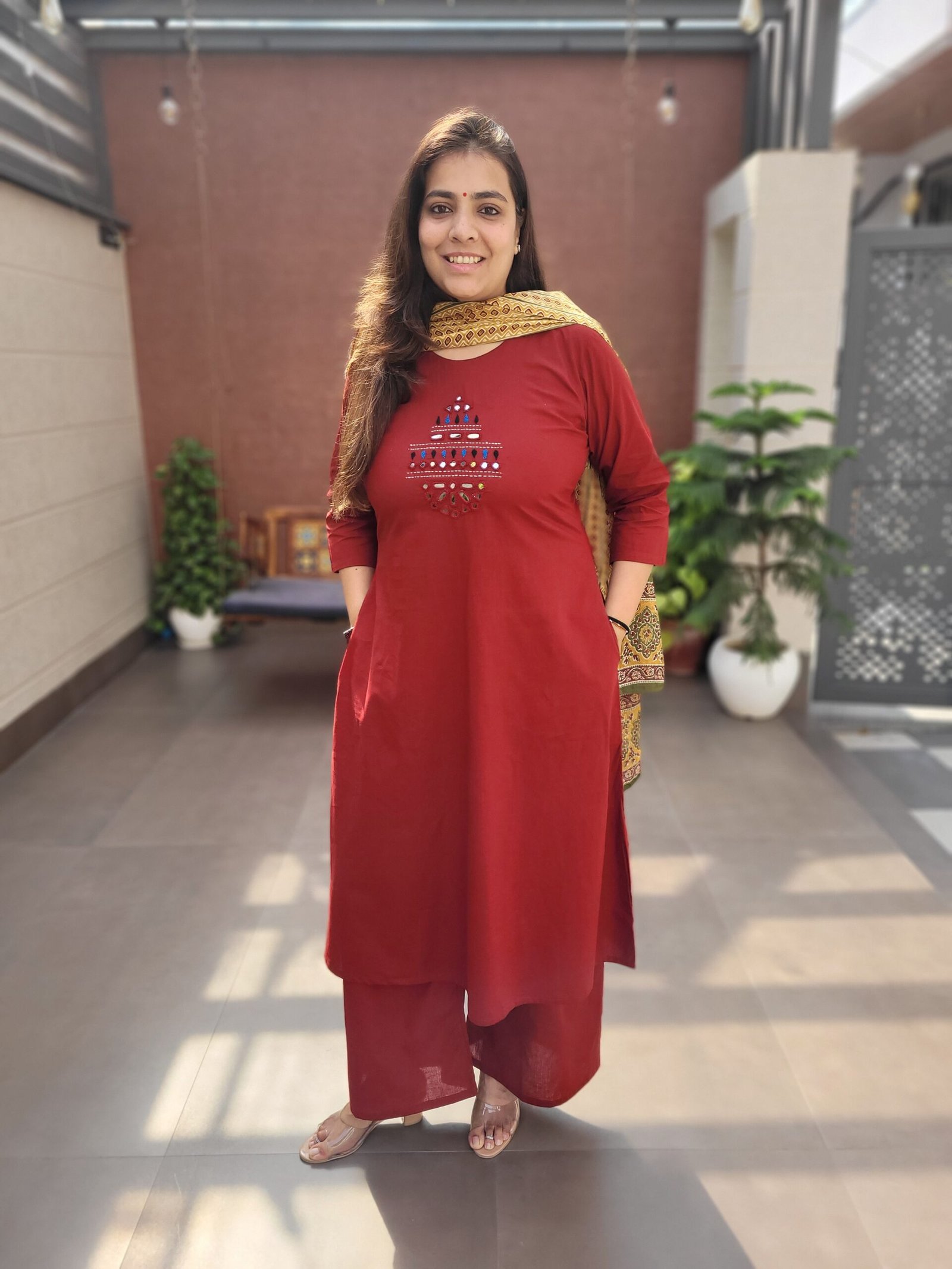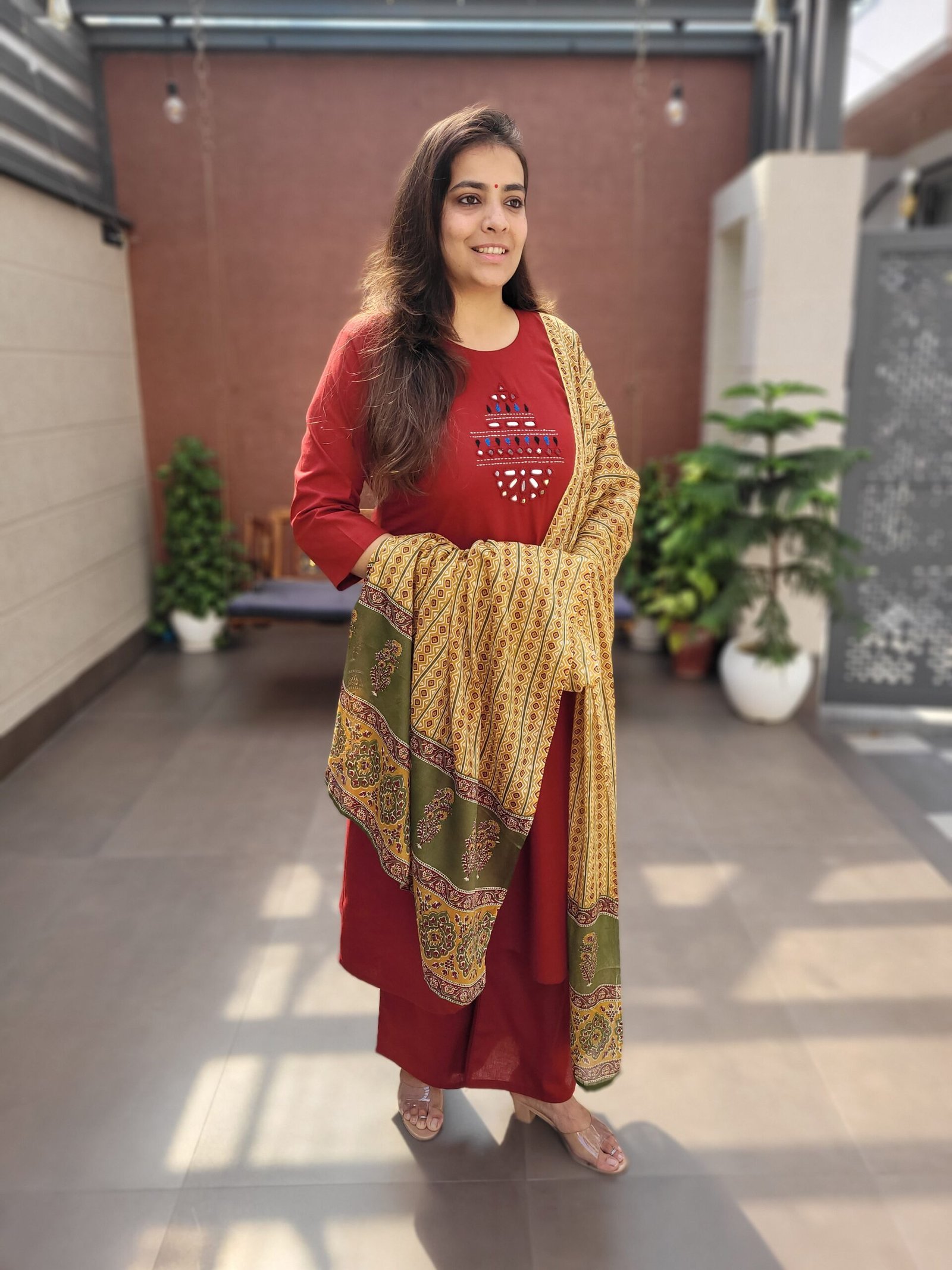 Double side pockets add practicality, while the Ajrakh print dupatta enhances the traditional appeal. Ideal for festive wear, cultural outings, and statement everyday fashion.