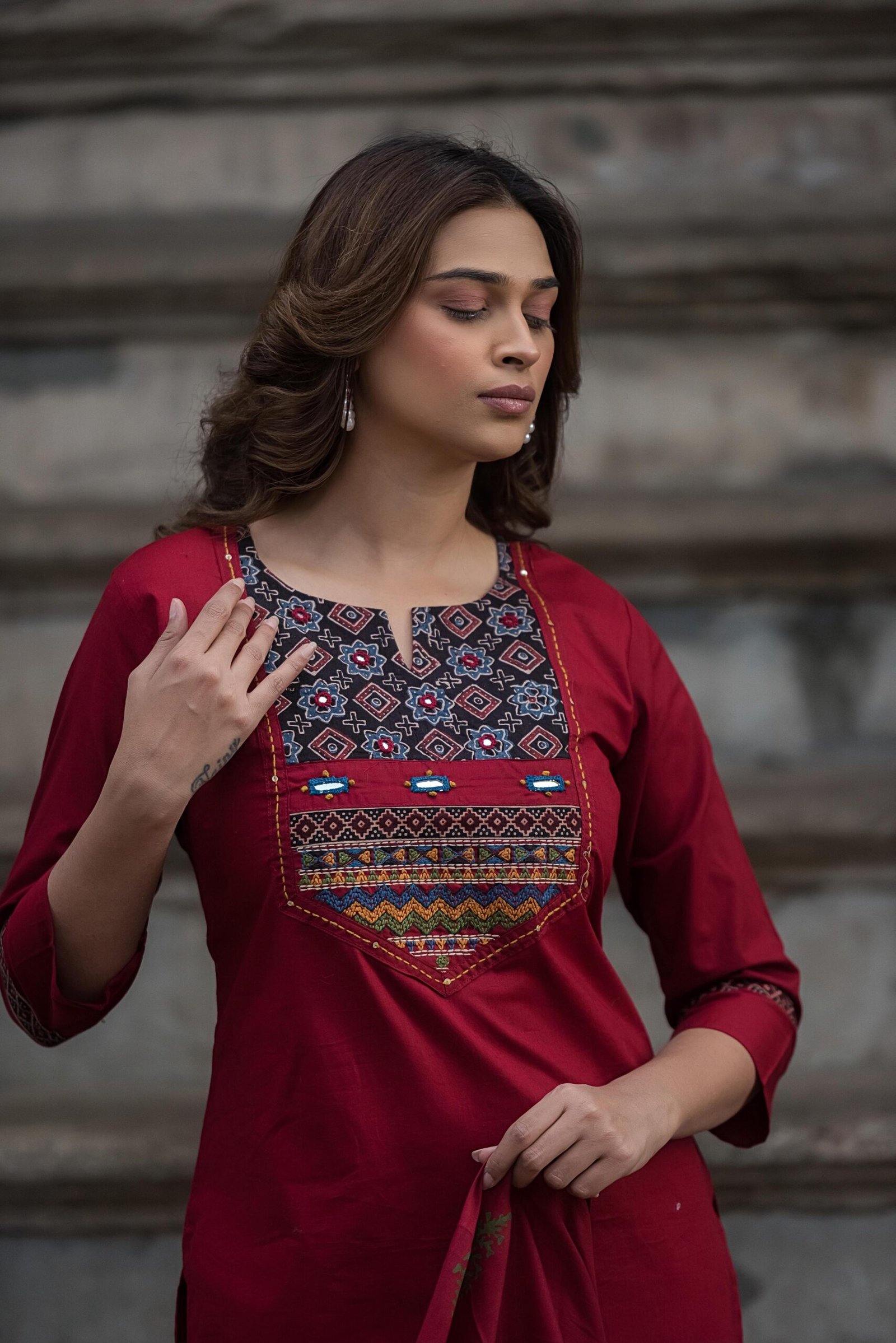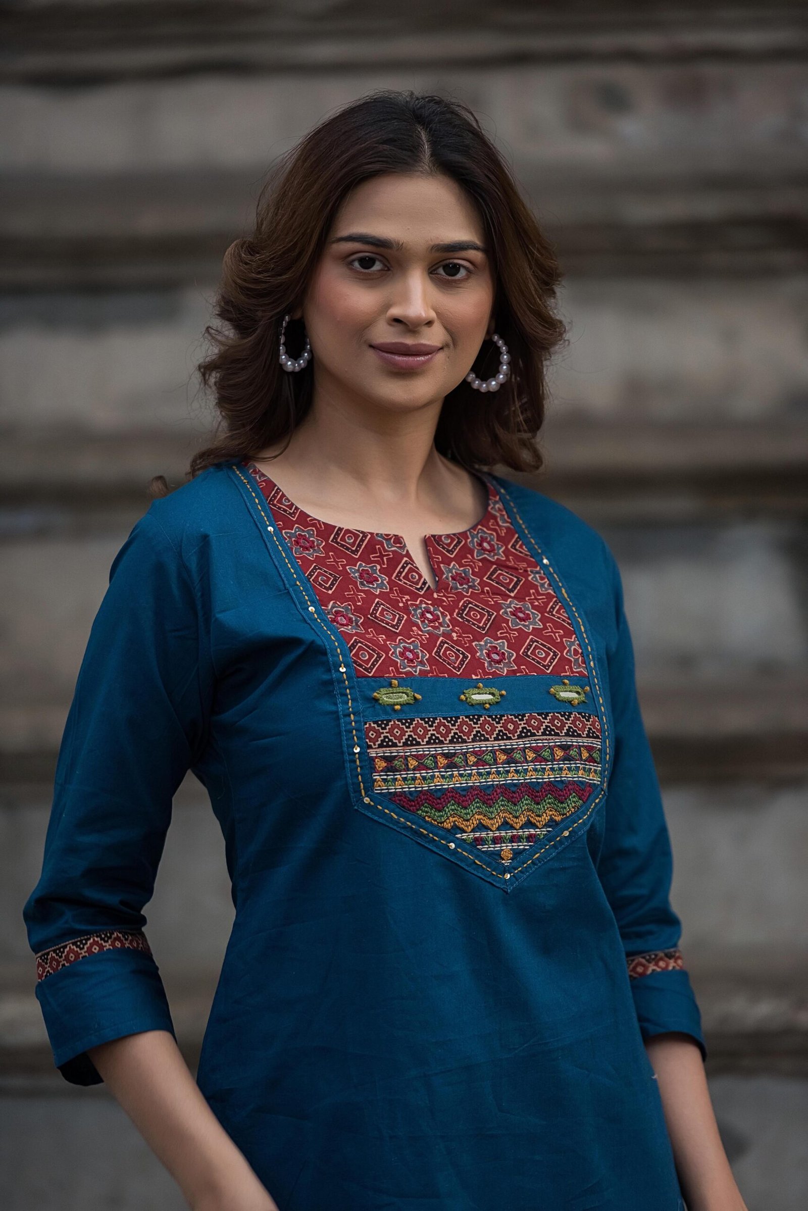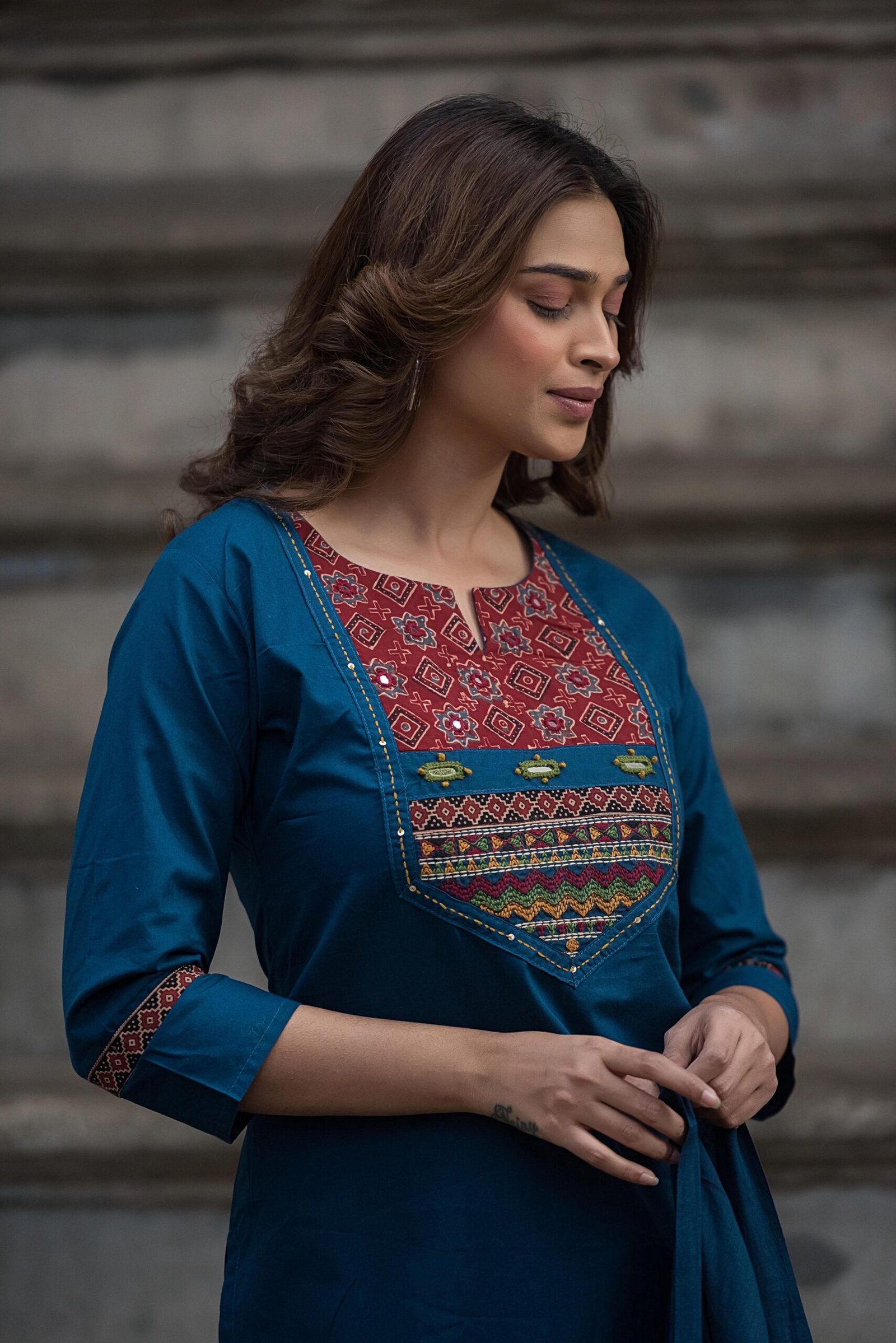 Care Tips: Hand wash separately to maintain mirror work and Ajrakh patching quality.