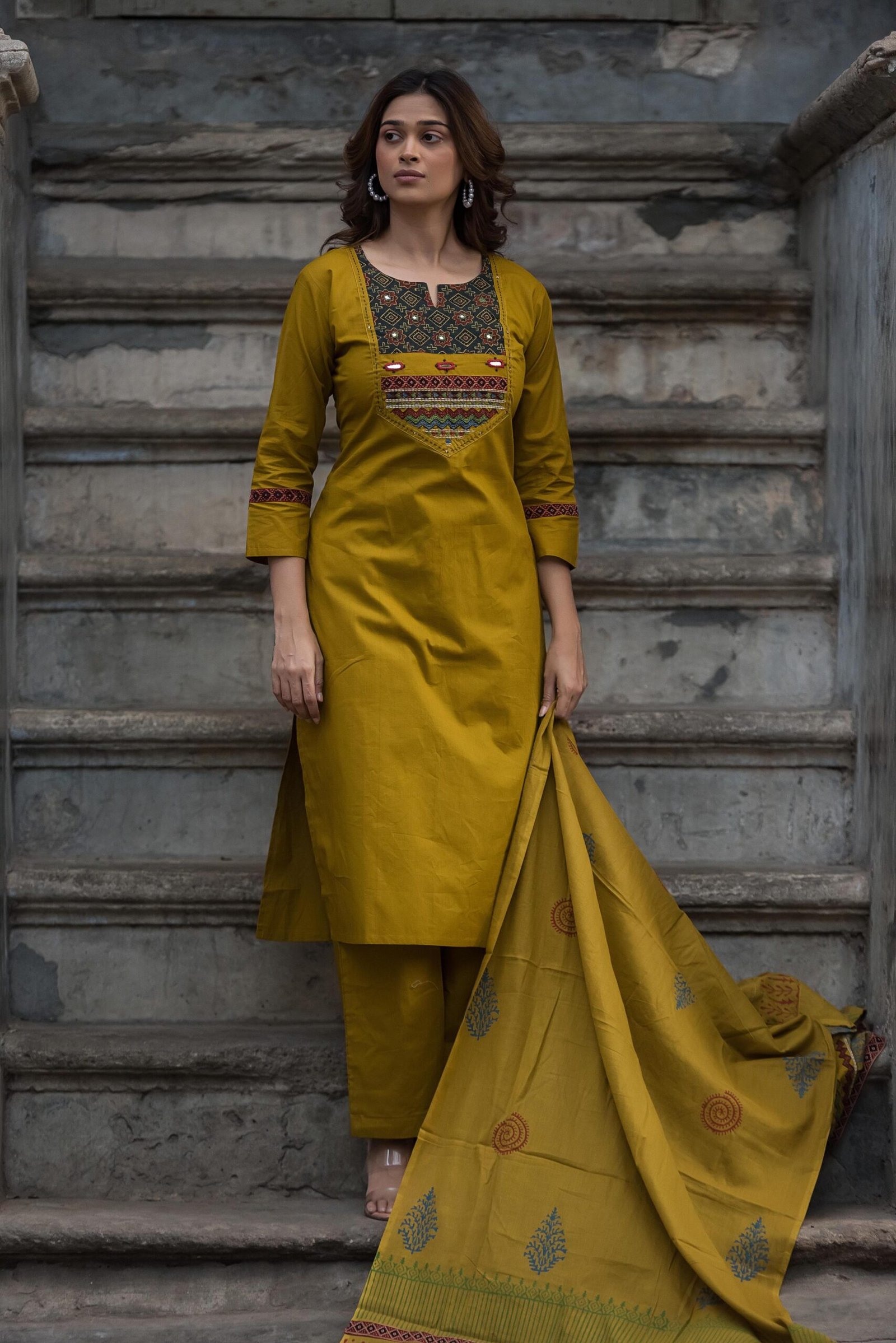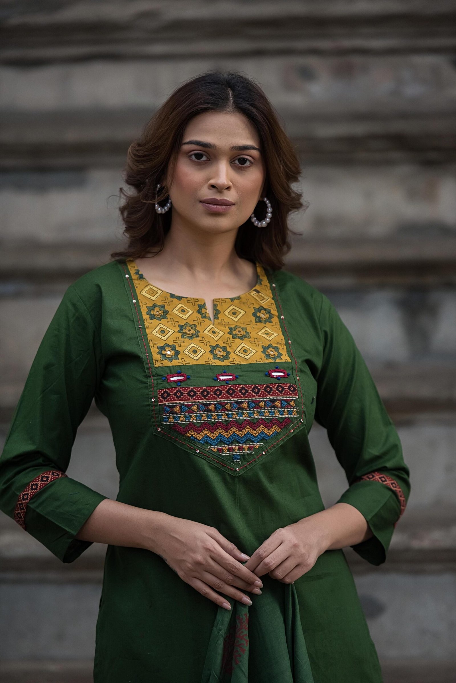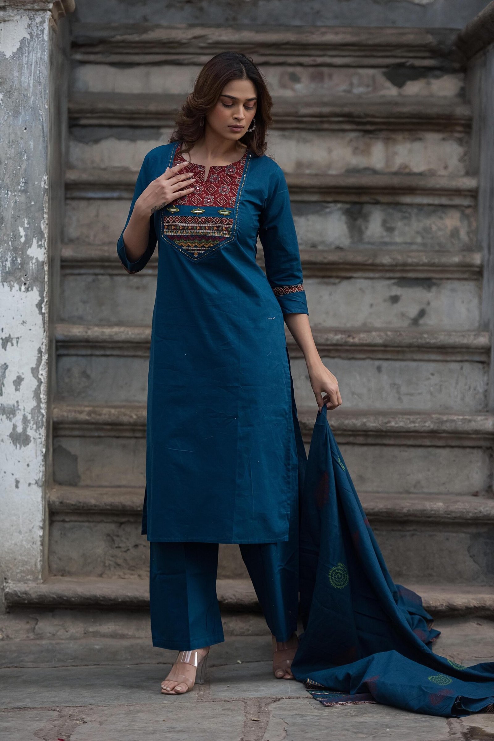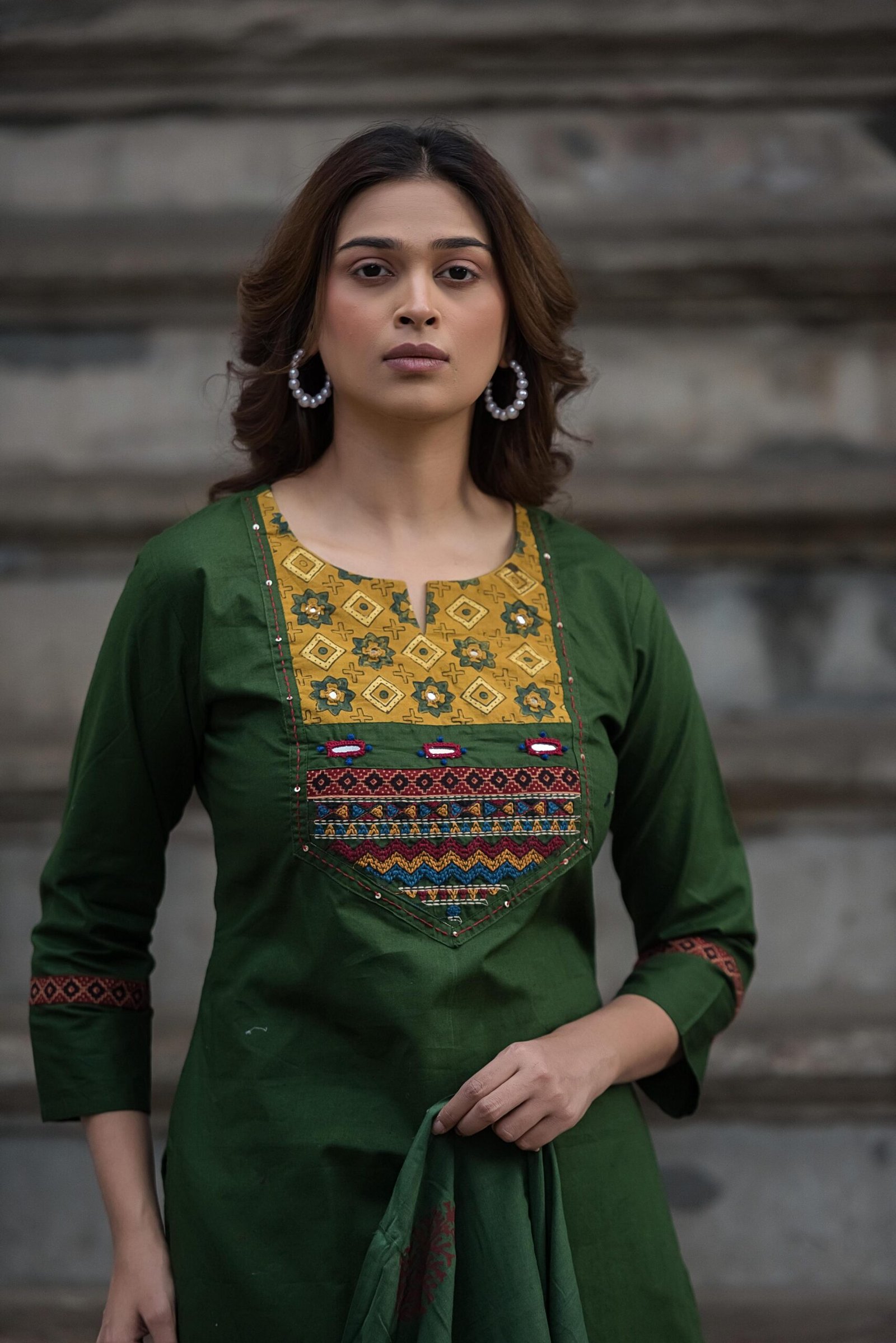 Care Tips: Hand wash separately to maintain mirror work and Ajrakh patching quality.
