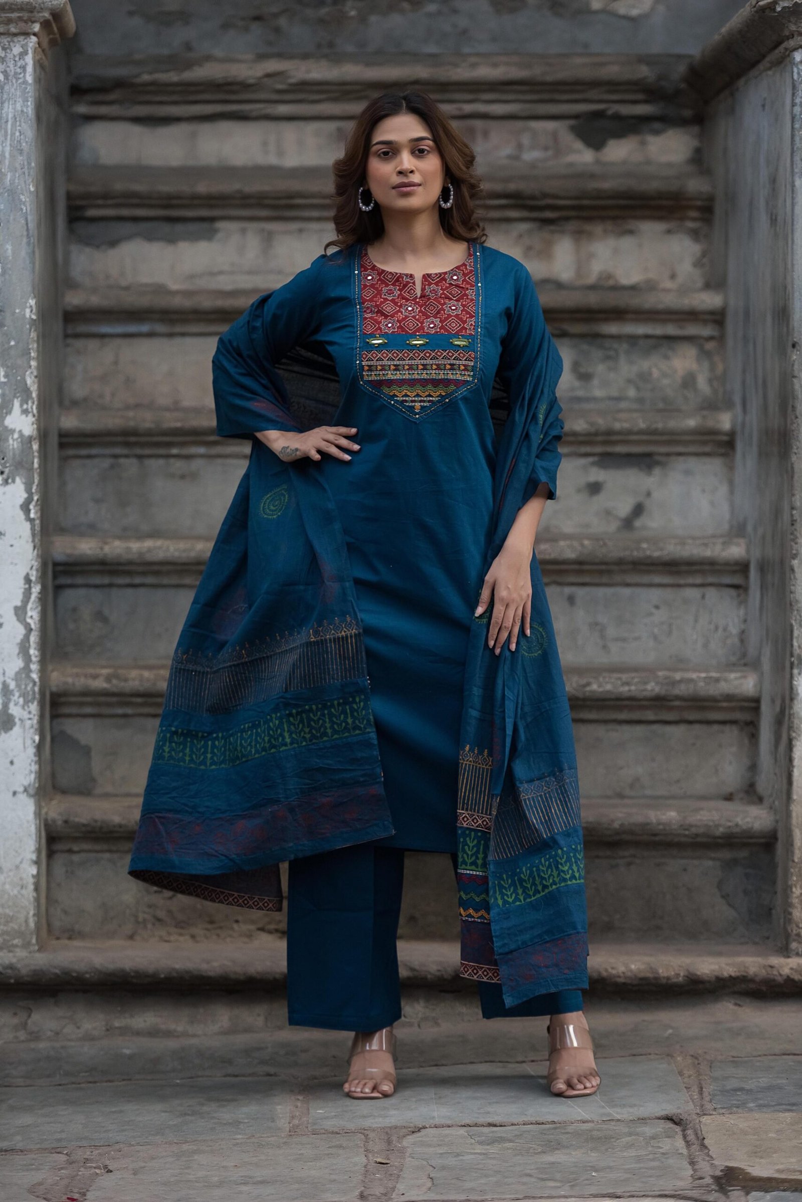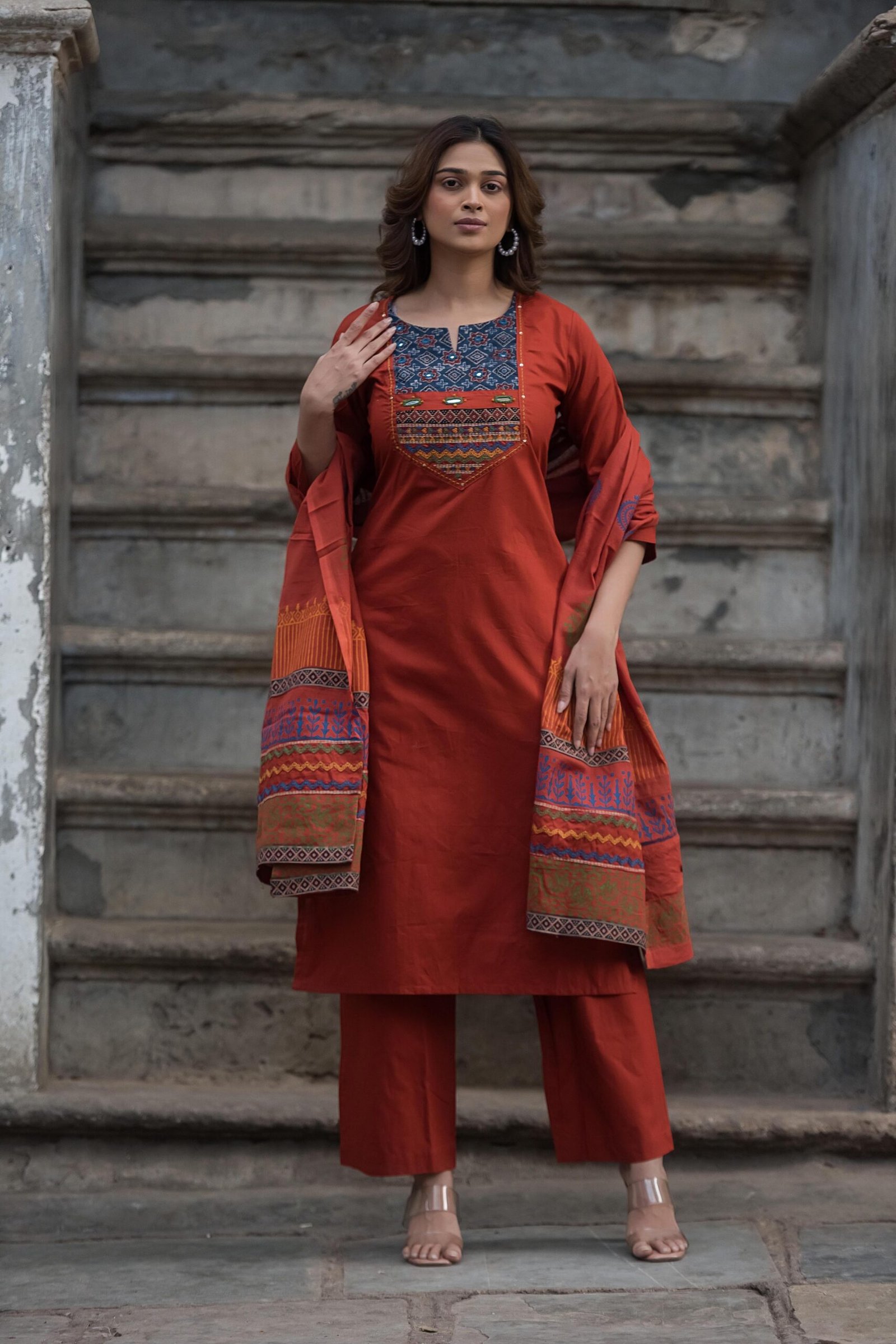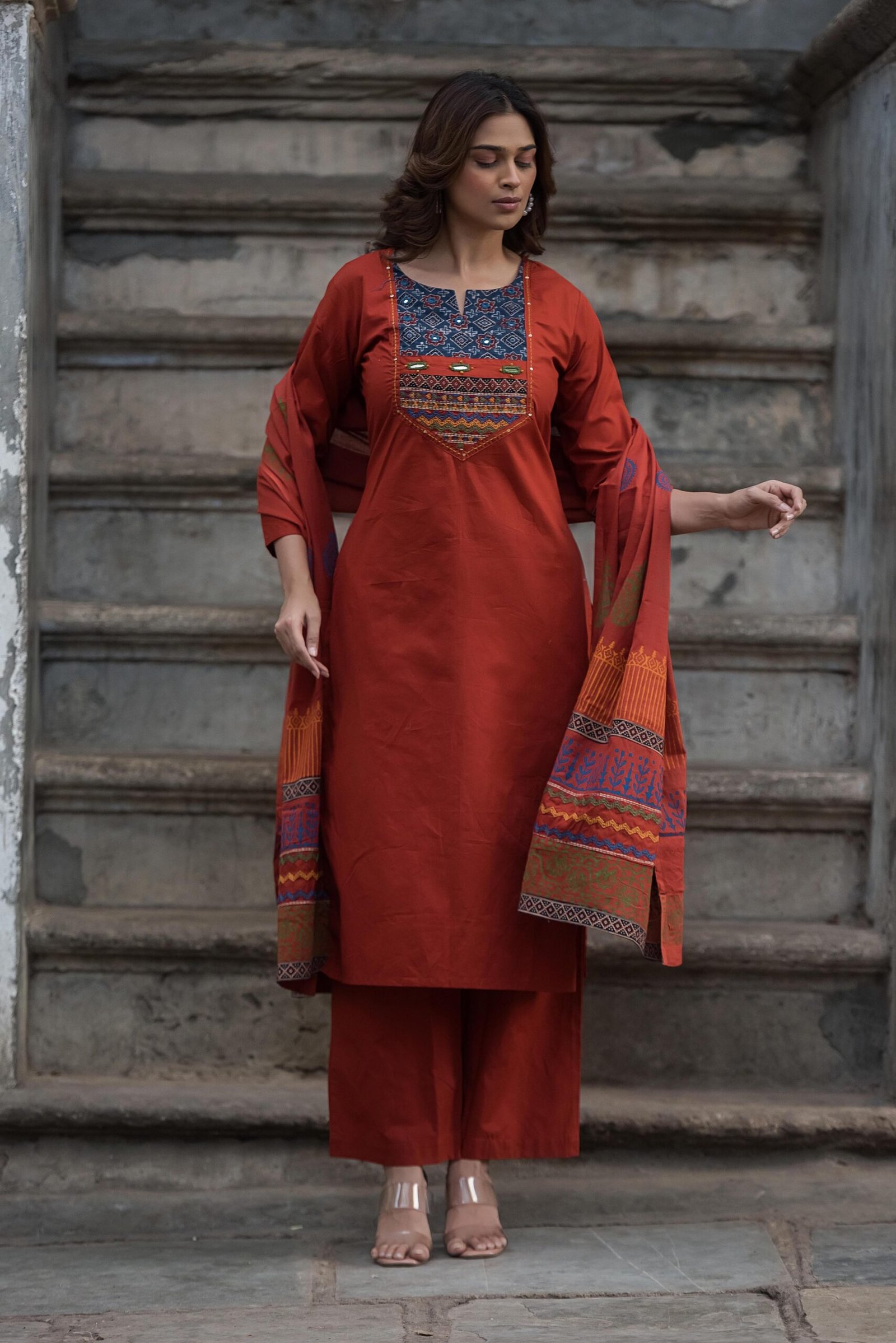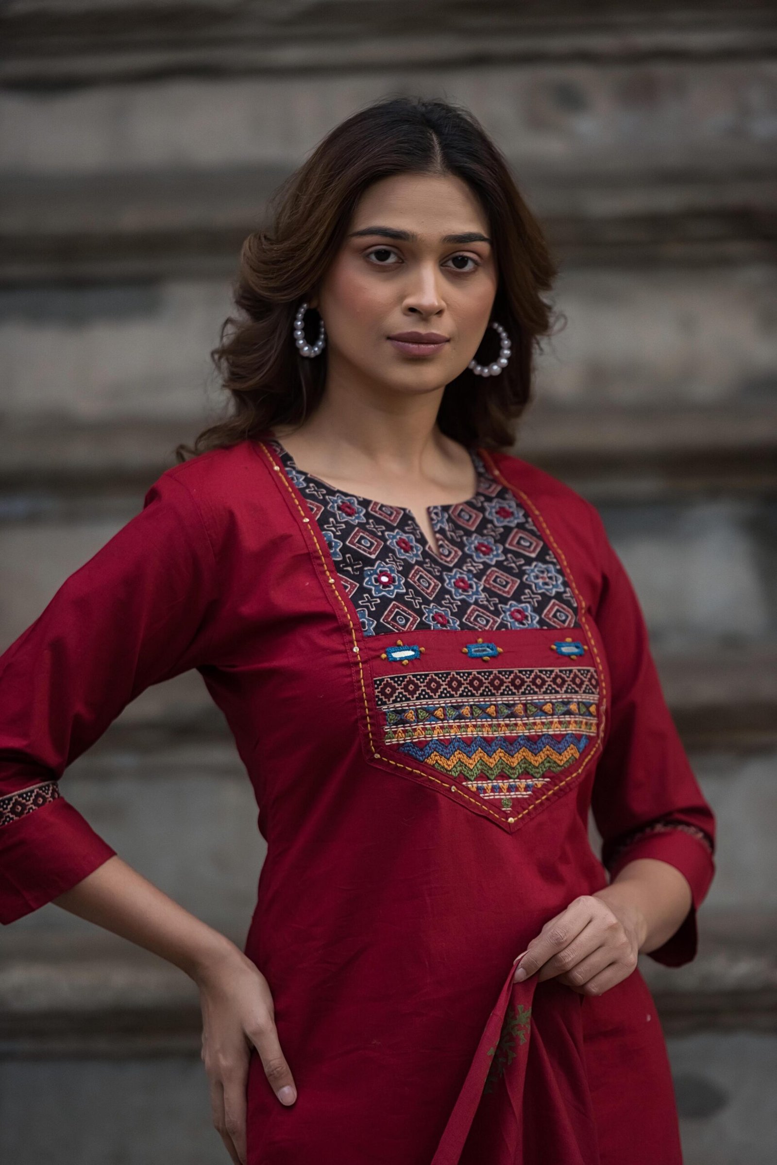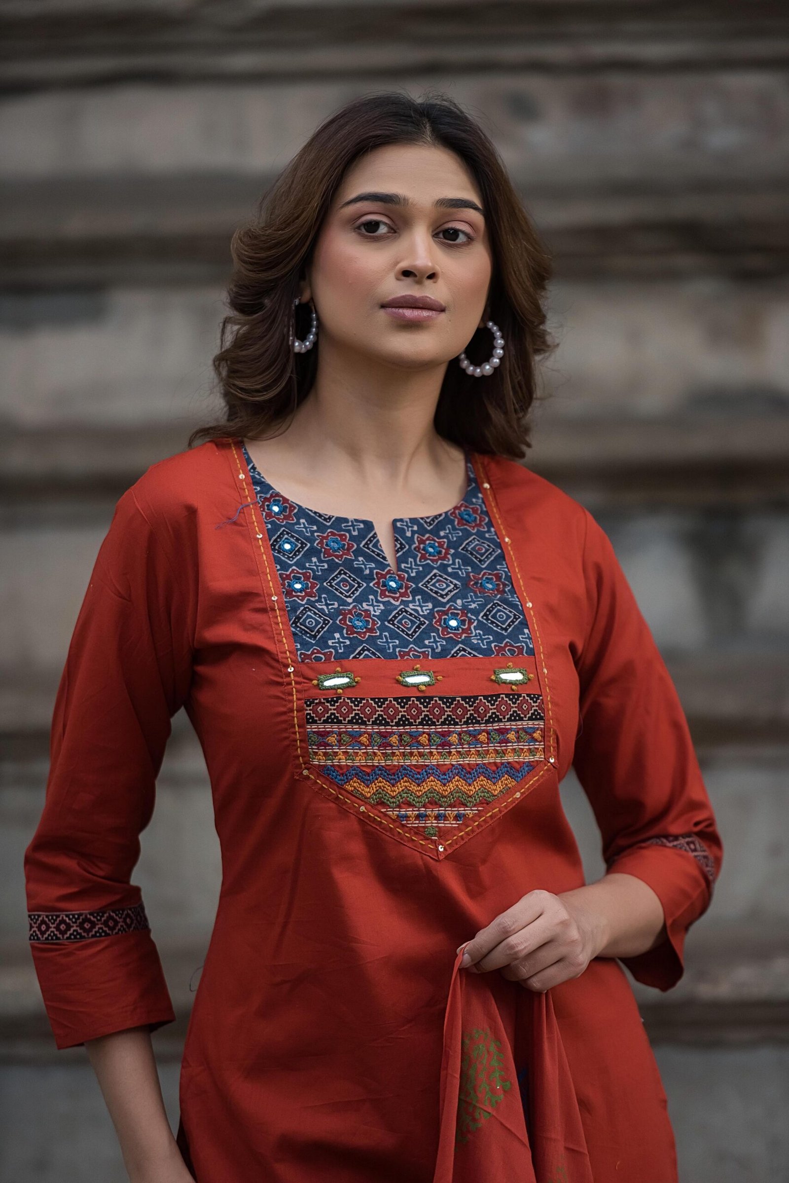 Featuring original Ajrakh patching and a beautifully enhanced dupatta with mirror and handwork embroidery, this outfit stands out for its artisanal charm. Ideal for festive celebrations, cultural functions, and elegant day wear.