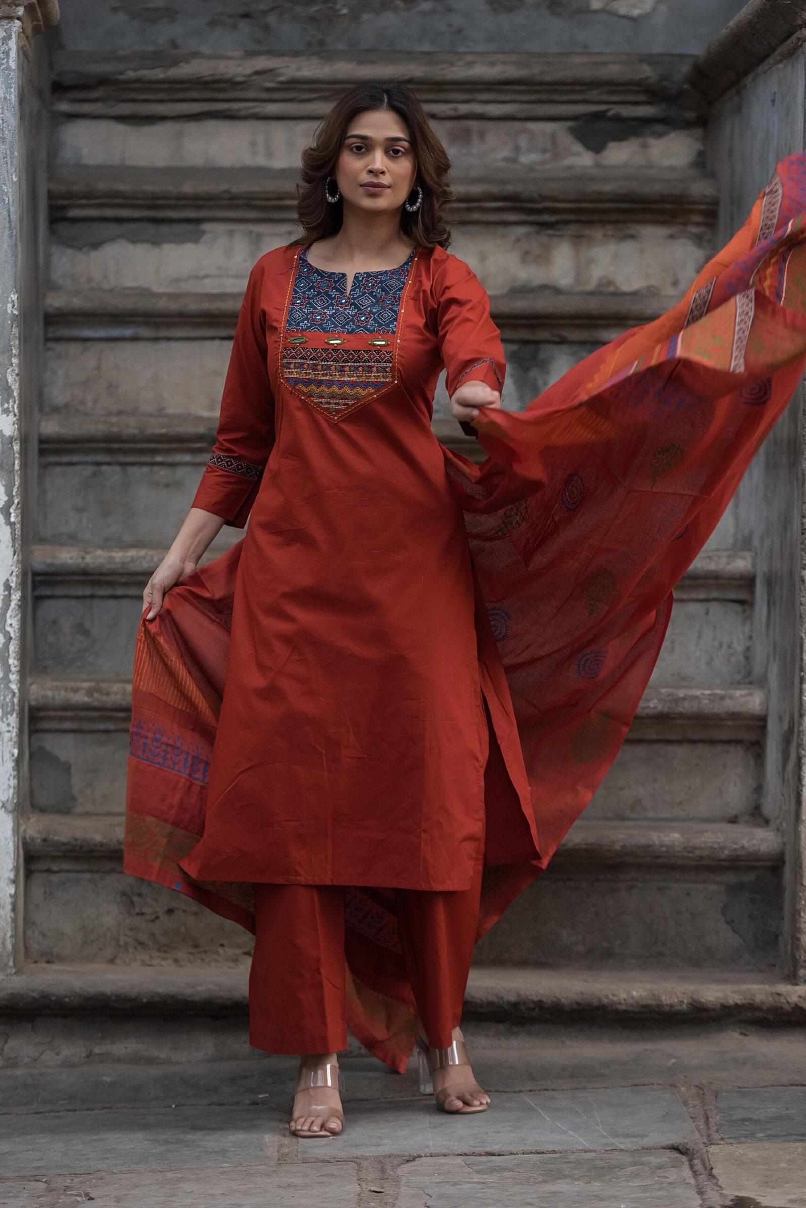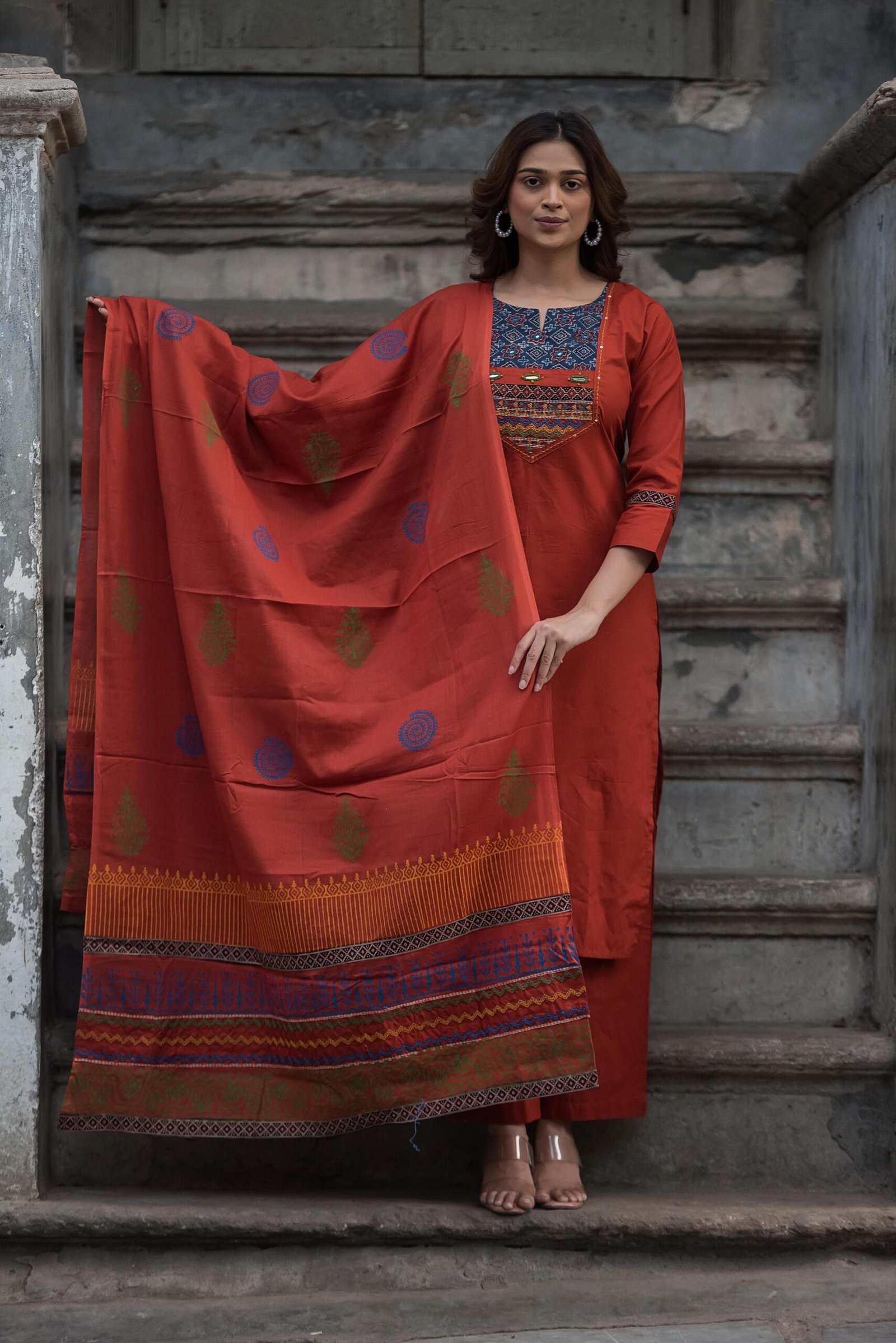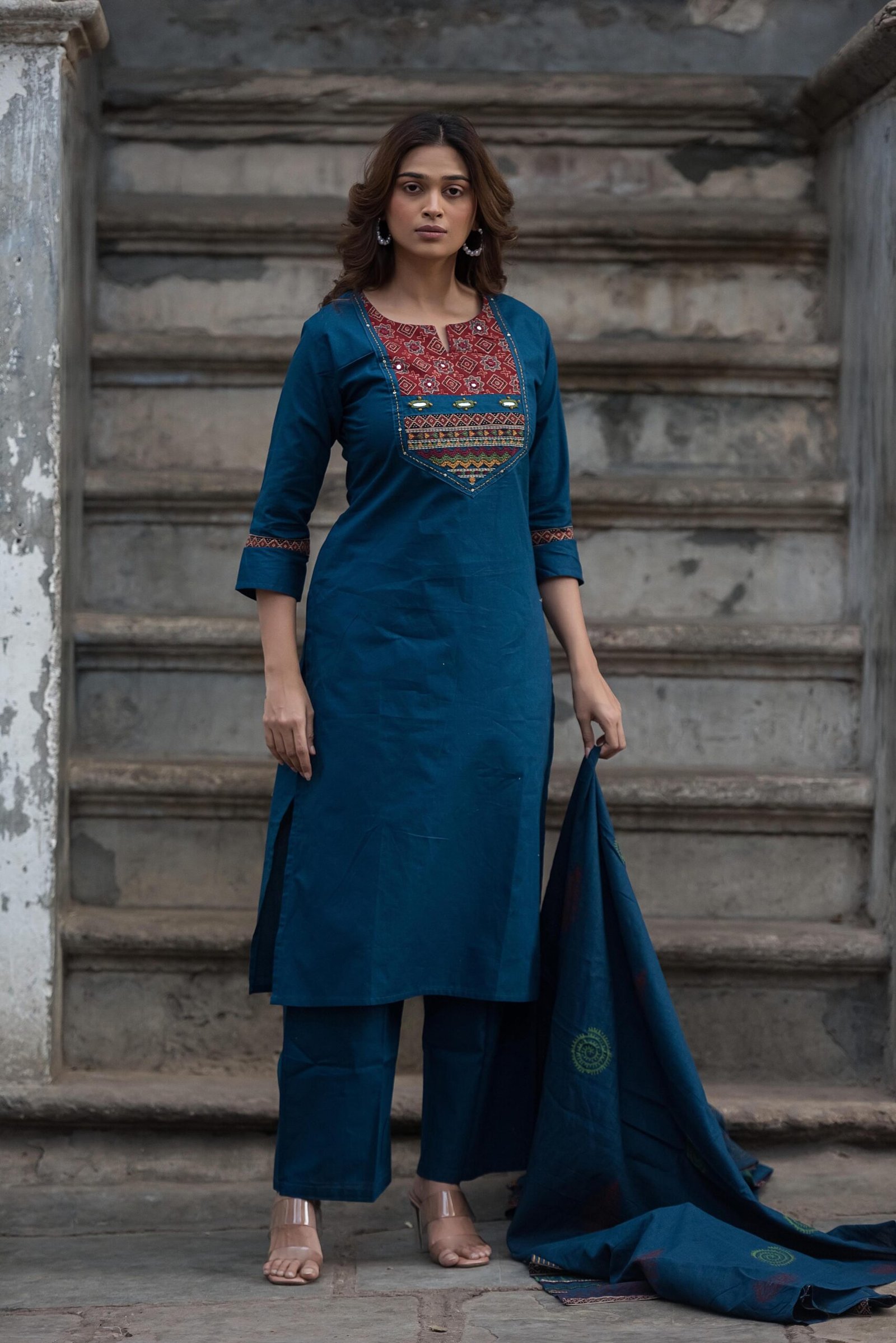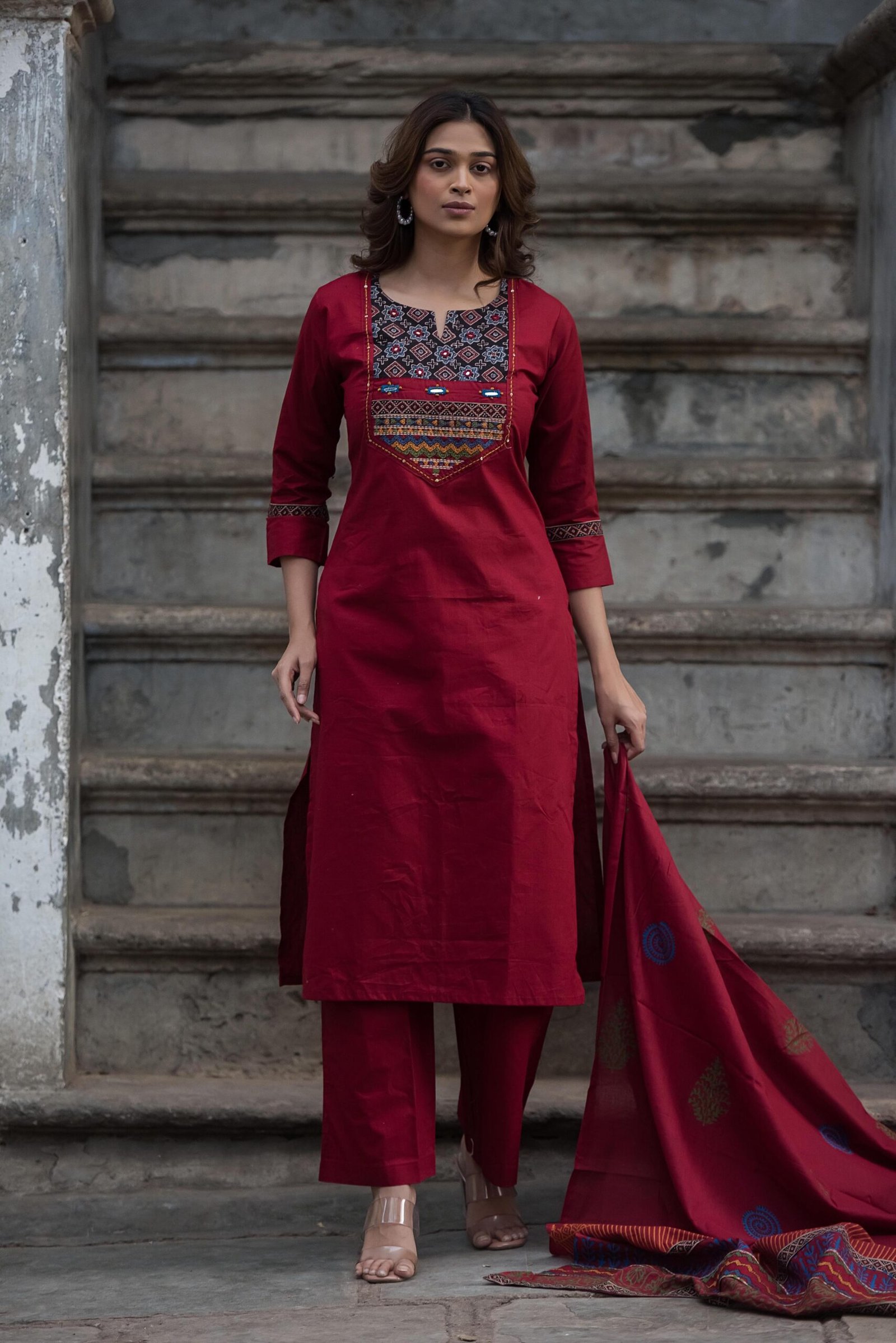 Featuring original Ajrakh patching and a beautifully enhanced dupatta with mirror and handwork embroidery, this outfit stands out for its artisanal charm. Ideal for festive celebrations, cultural functions, and elegant day wear.