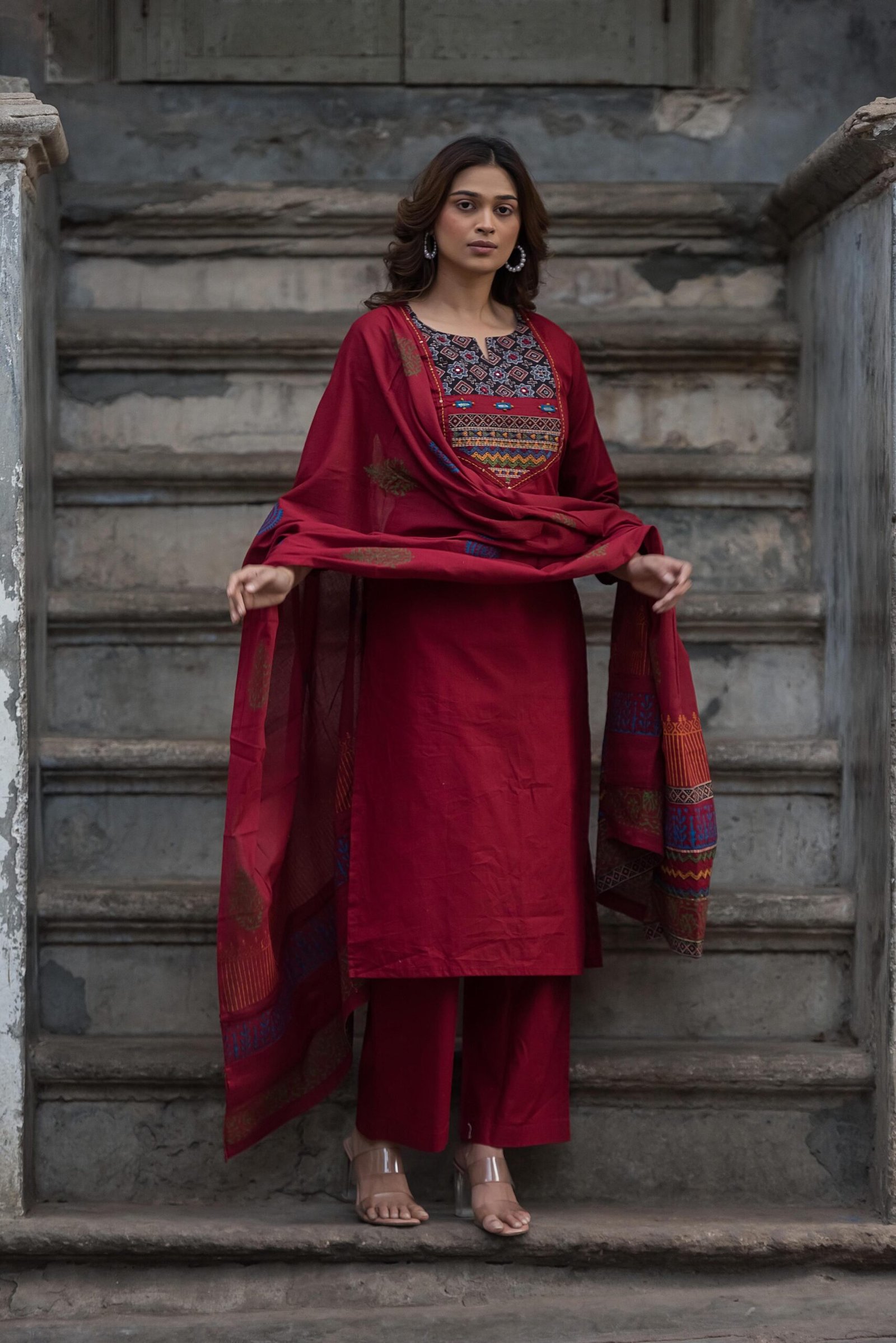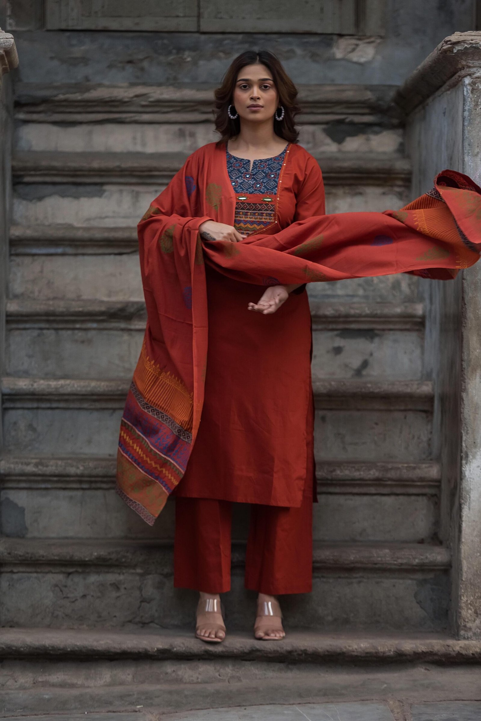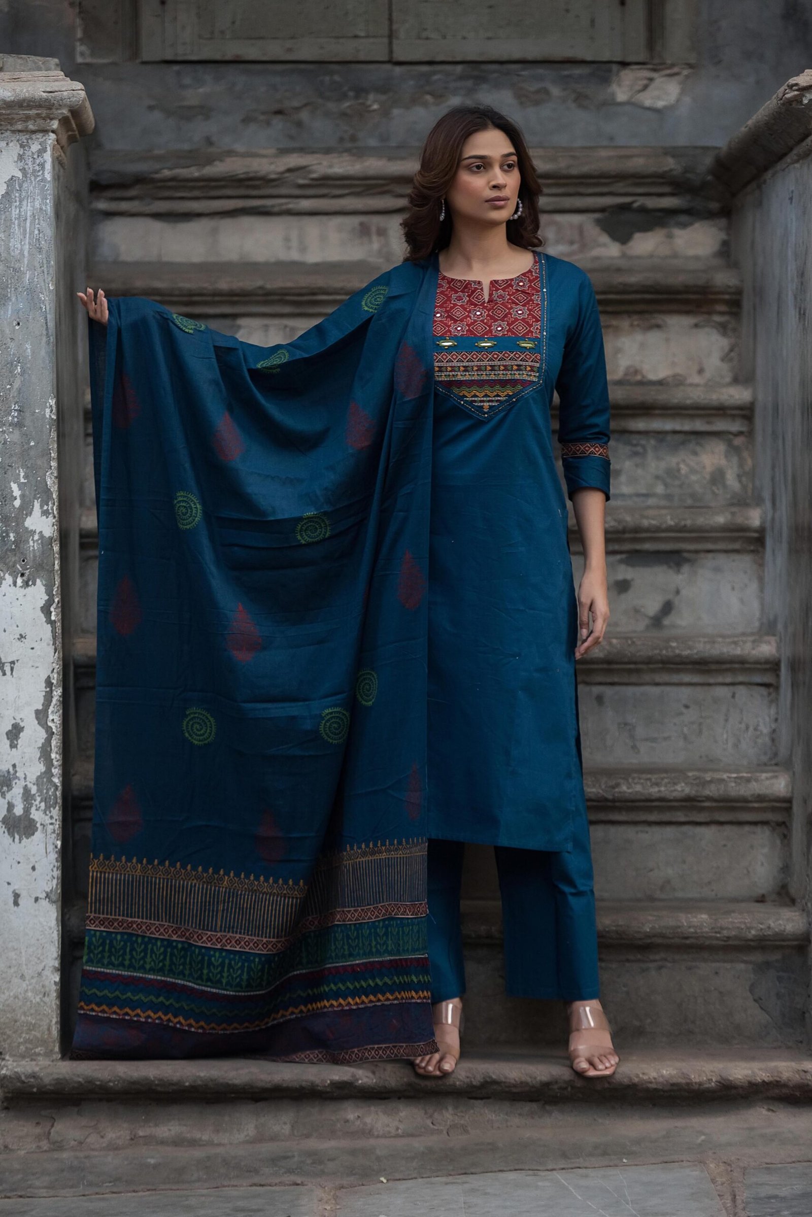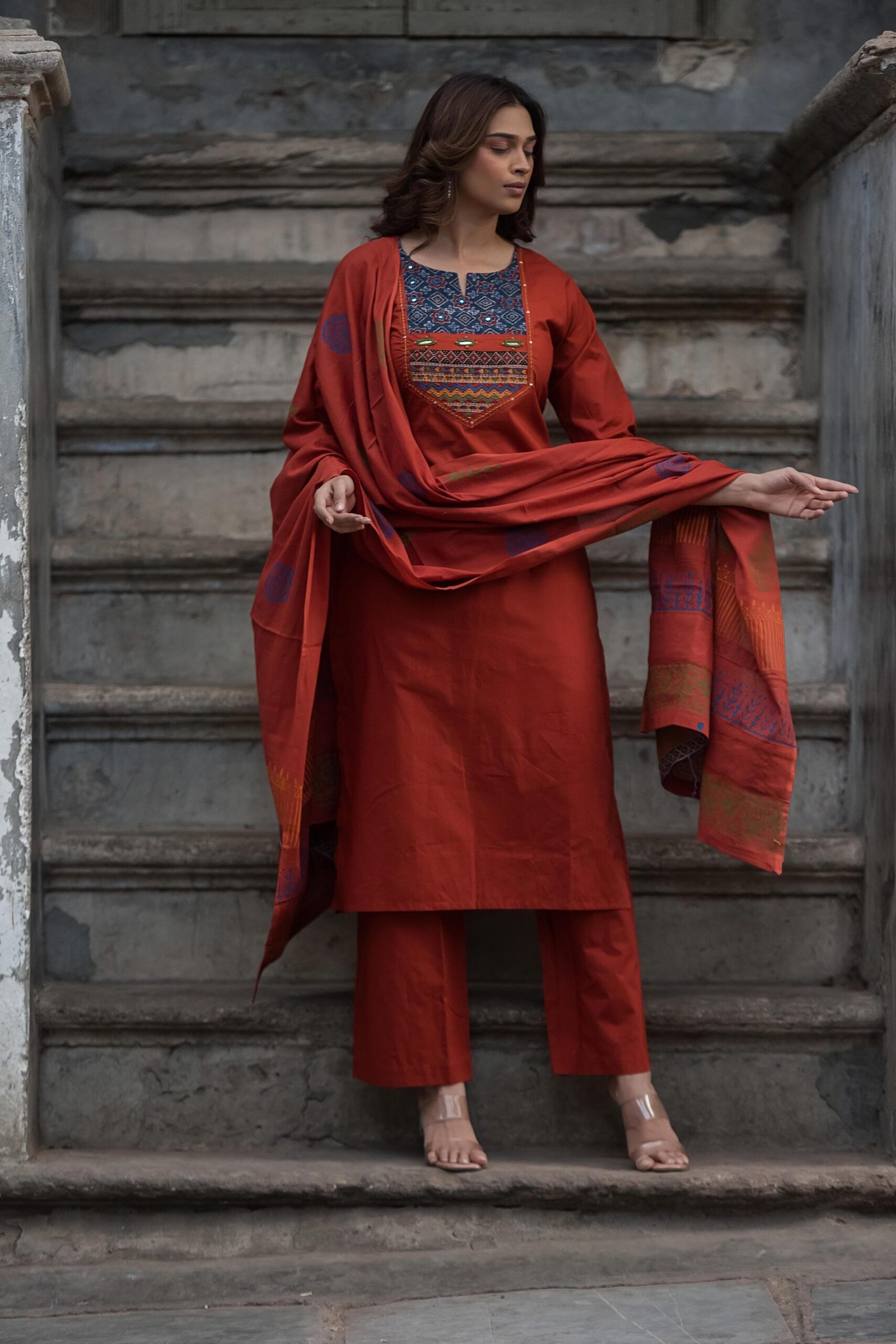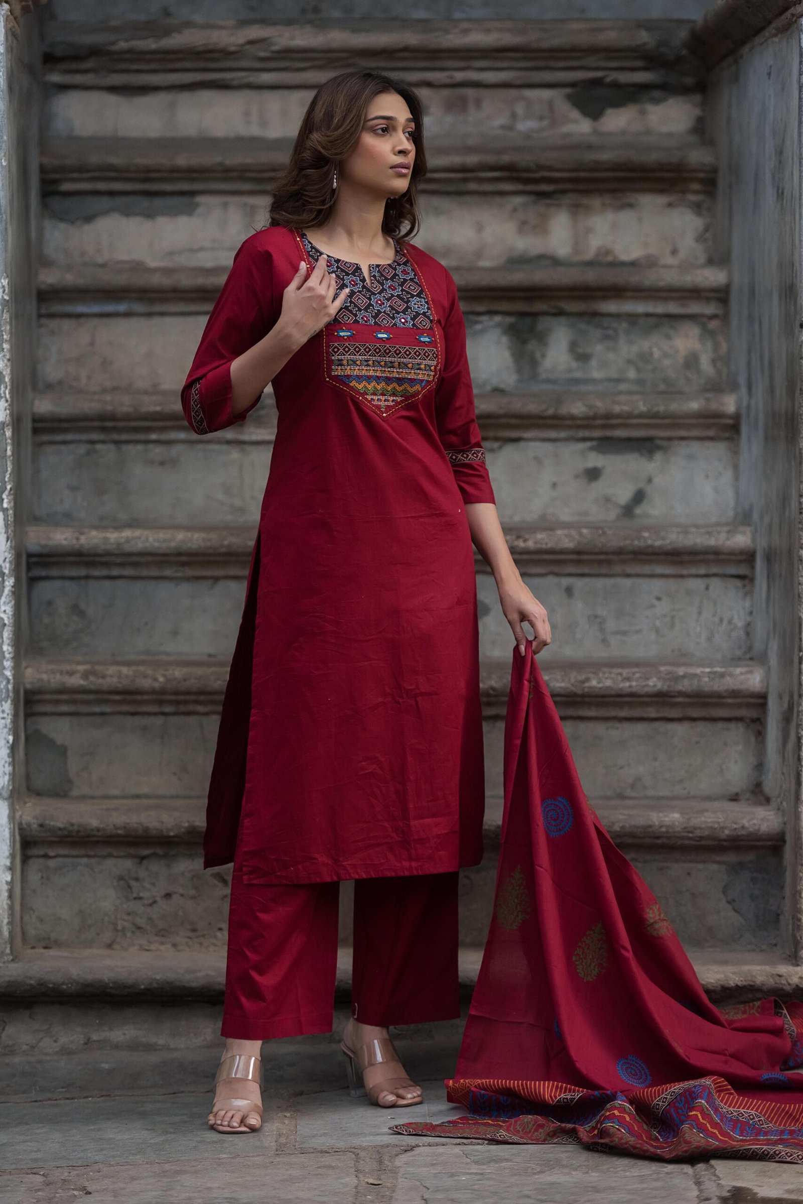 Featuring original Ajrakh patching and a beautifully enhanced dupatta with mirror and handwork embroidery, this outfit stands out for its artisanal charm. Ideal for festive celebrations, cultural functions, and elegant day wear.