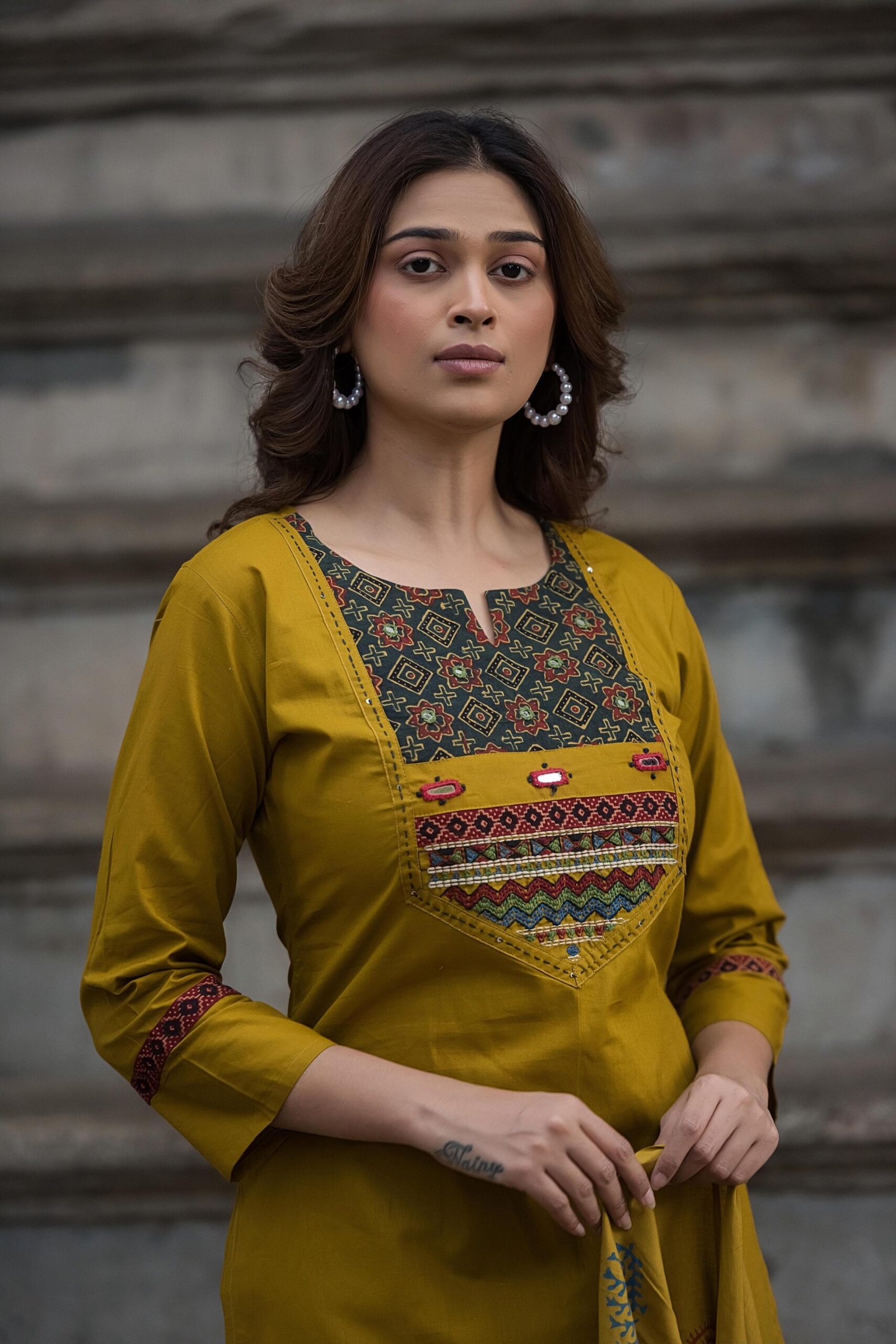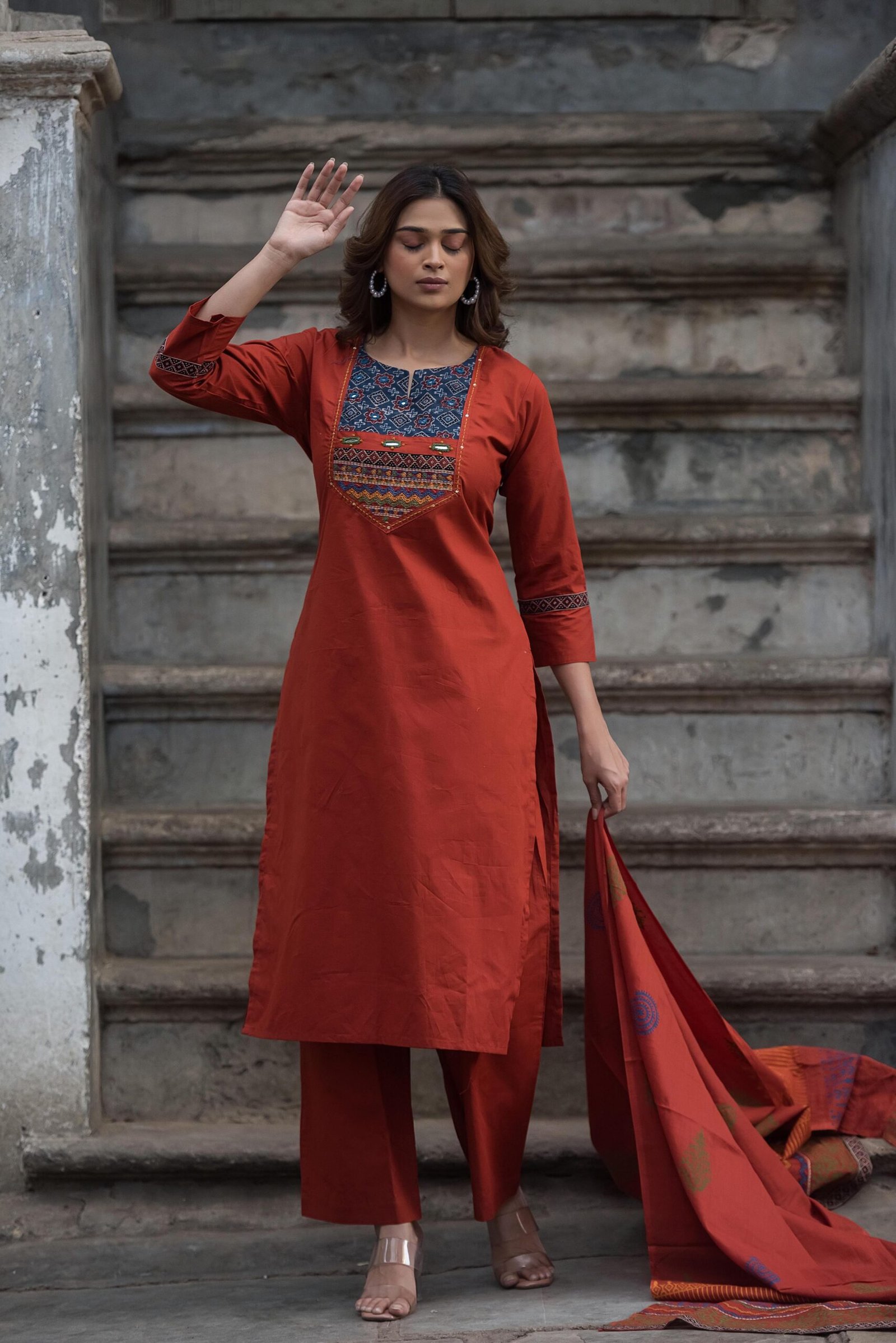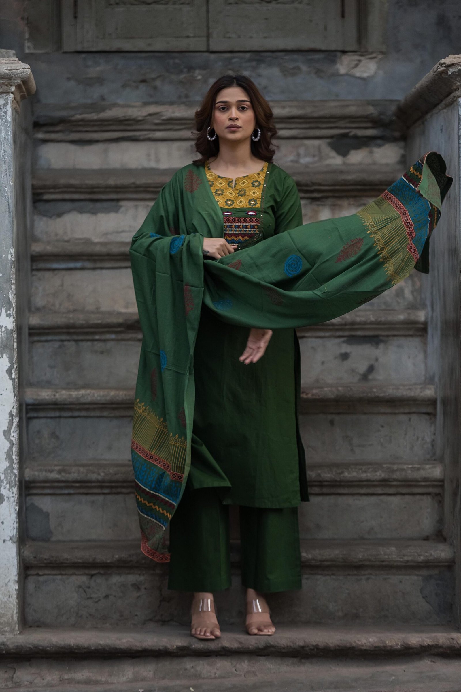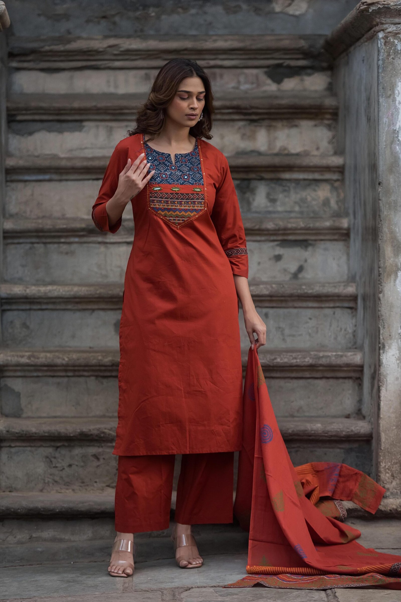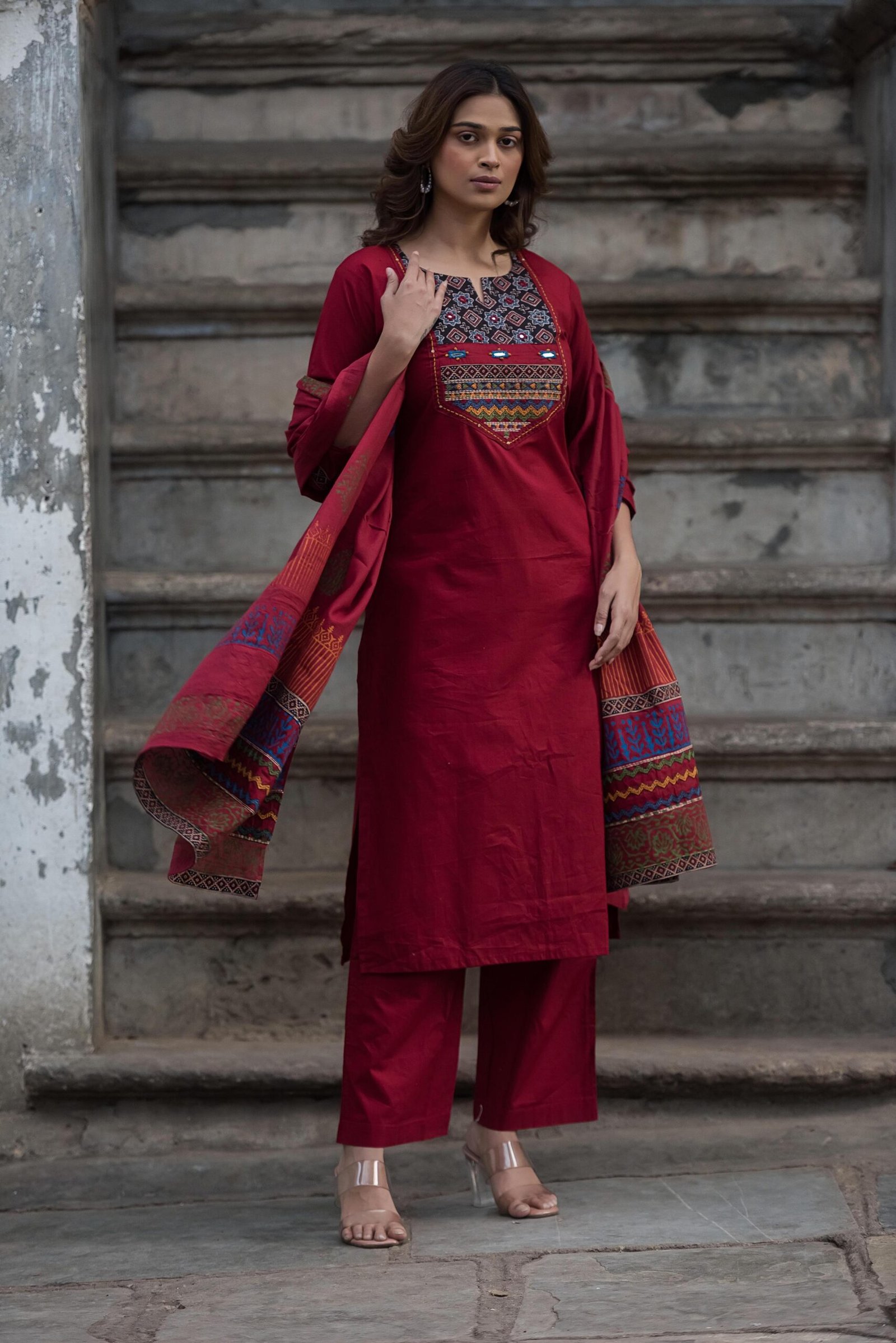 Featuring original Ajrakh patching and a beautifully enhanced dupatta with mirror and handwork embroidery, this outfit stands out for its artisanal charm. Ideal for festive celebrations, cultural functions, and elegant day wear.