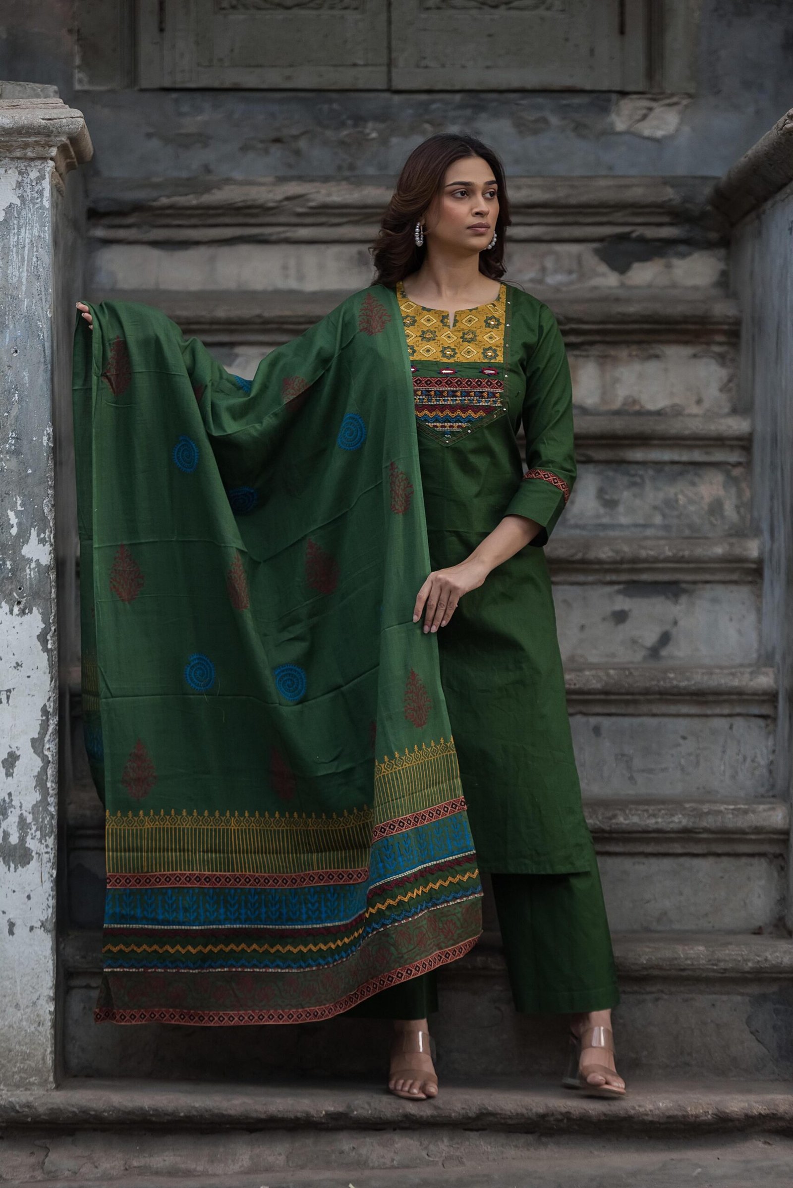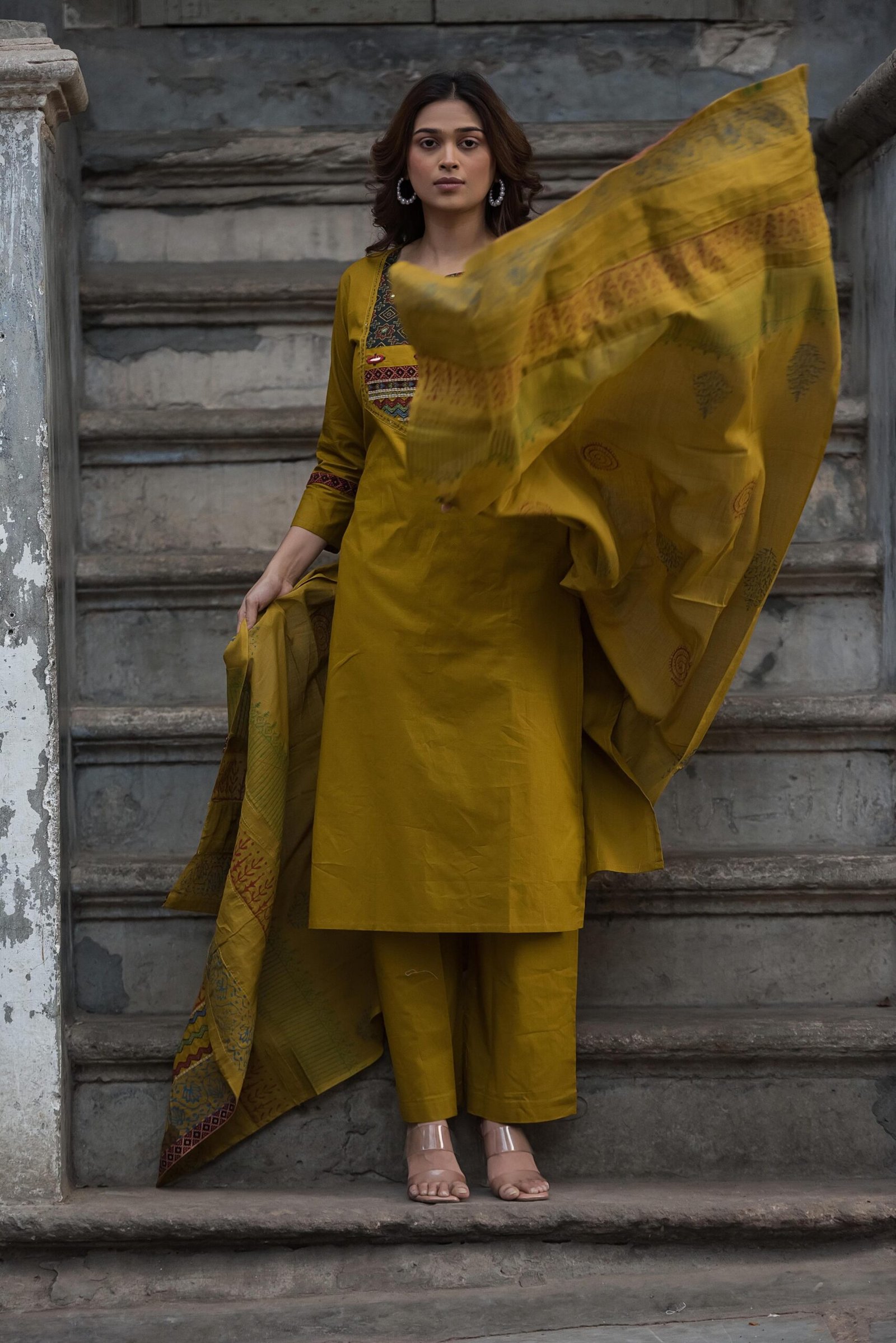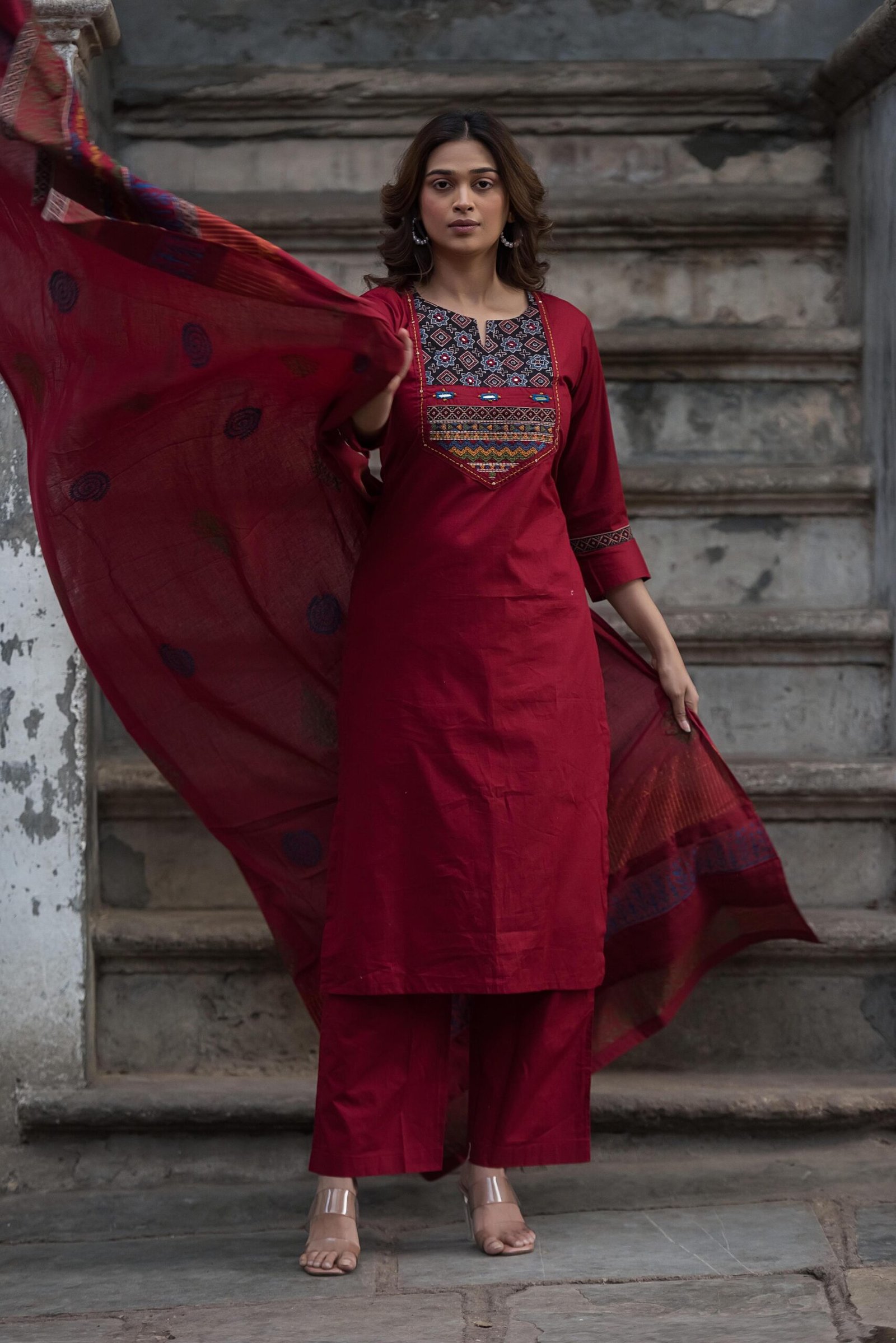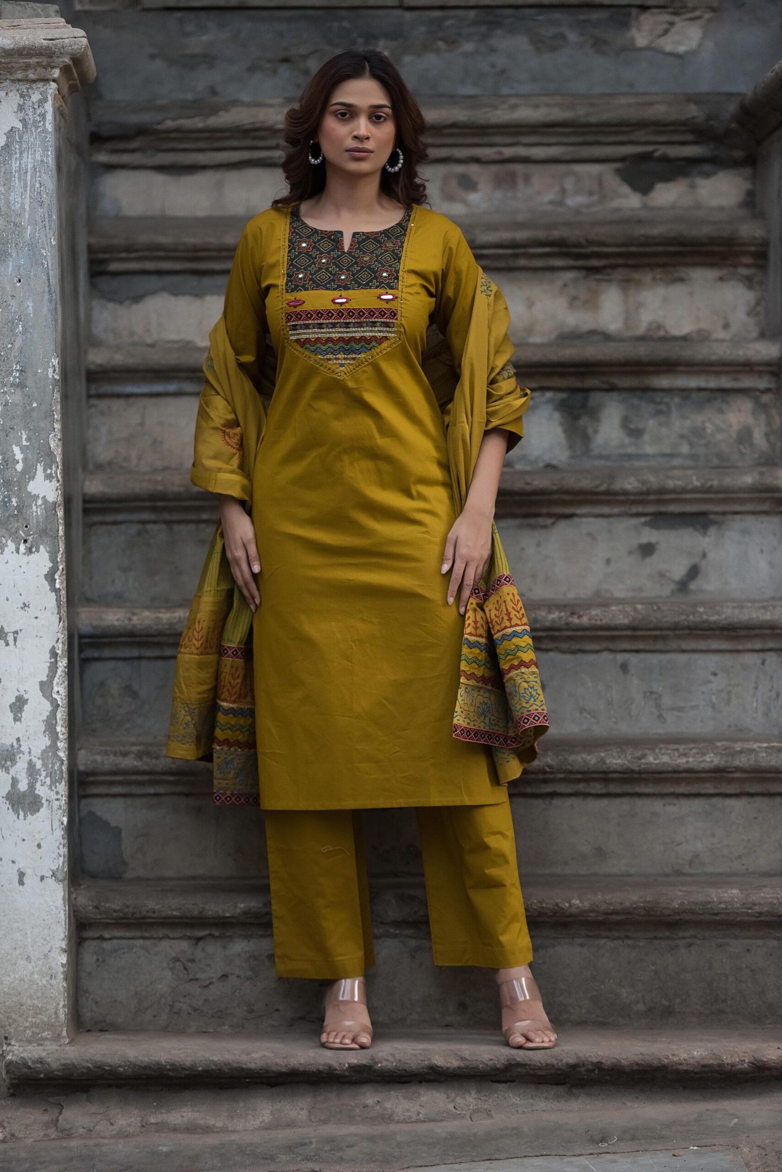 Featuring original Ajrakh patching and a beautifully enhanced dupatta with mirror and handwork embroidery, this outfit stands out for its artisanal charm. Ideal for festive celebrations, cultural functions, and elegant day wear.