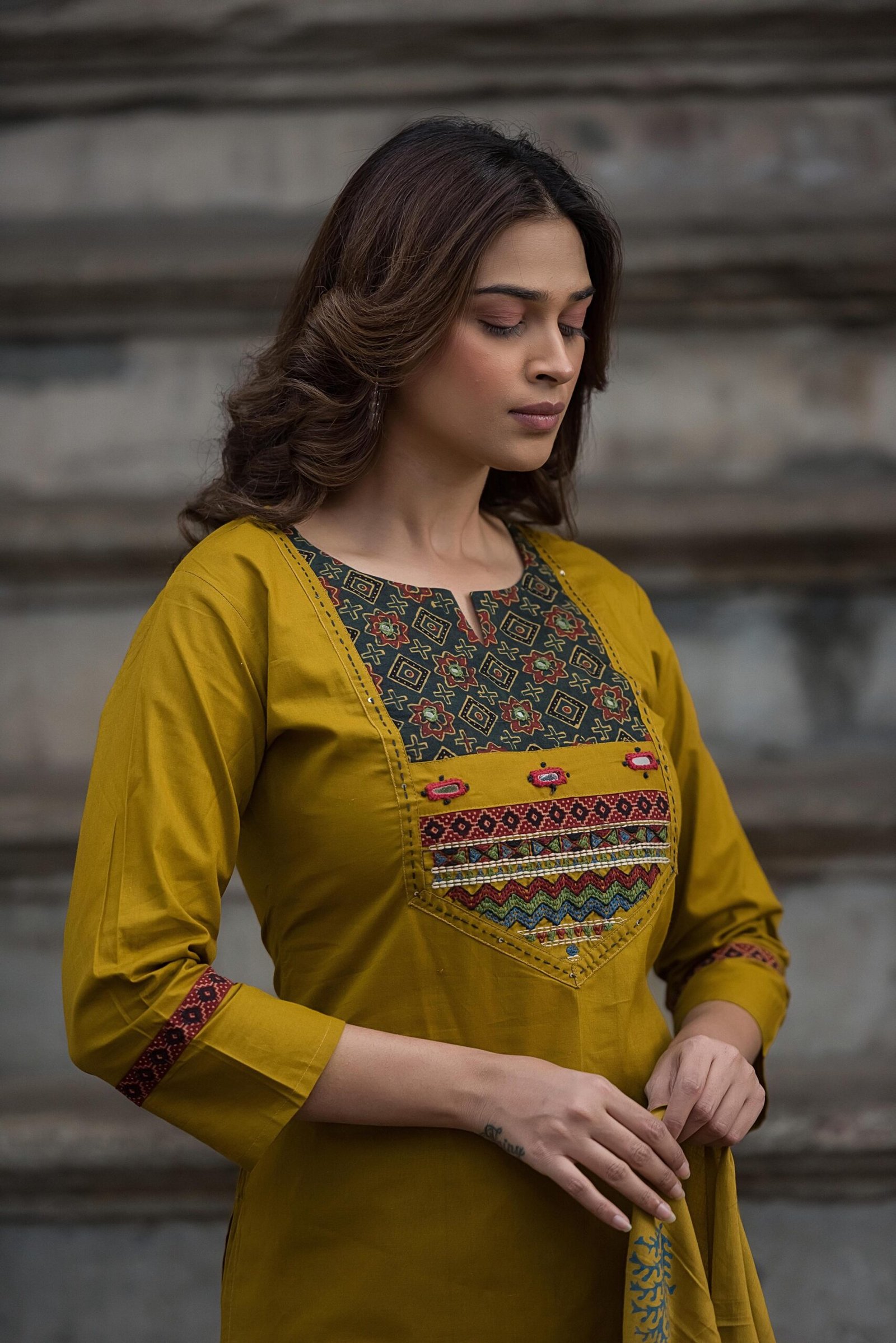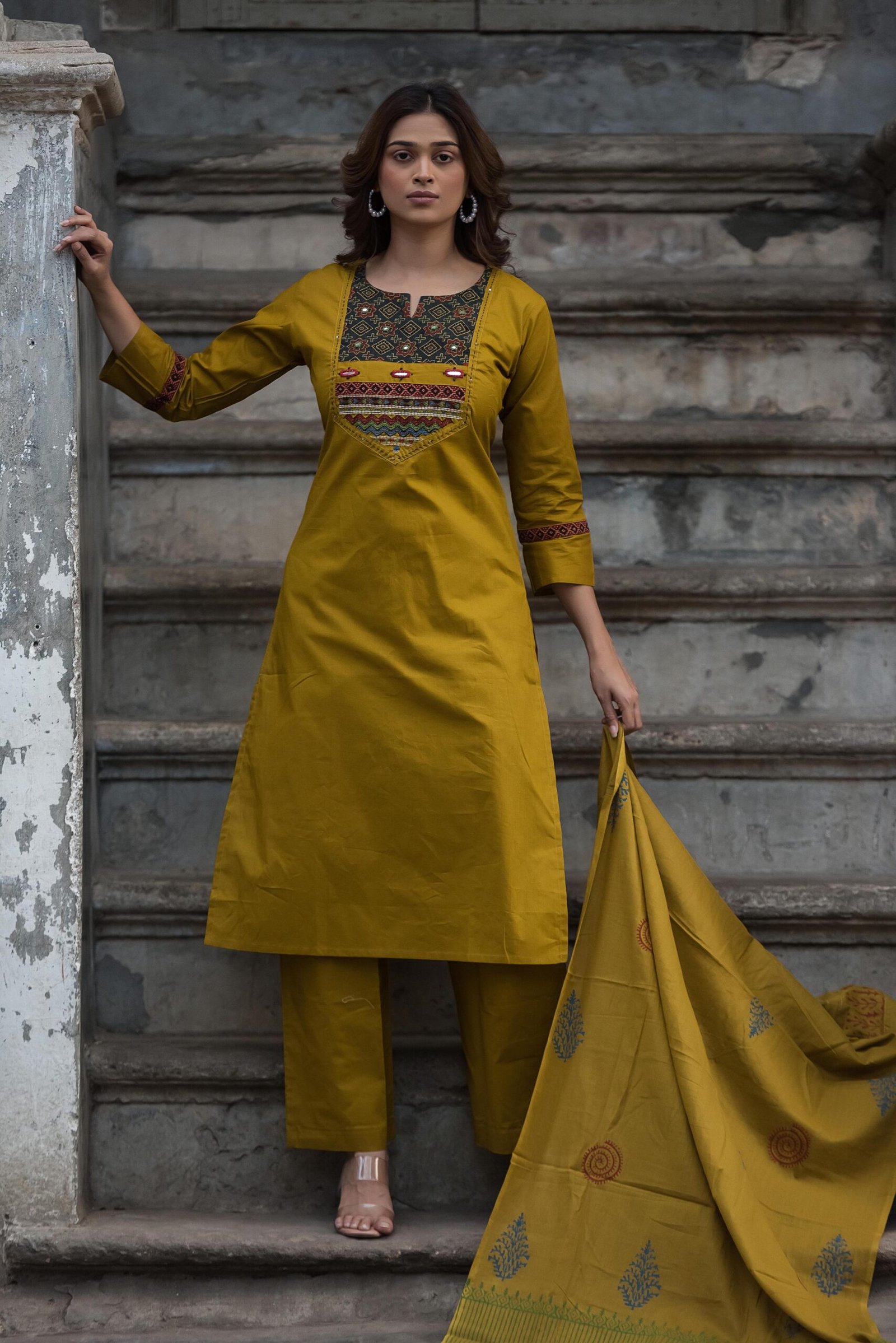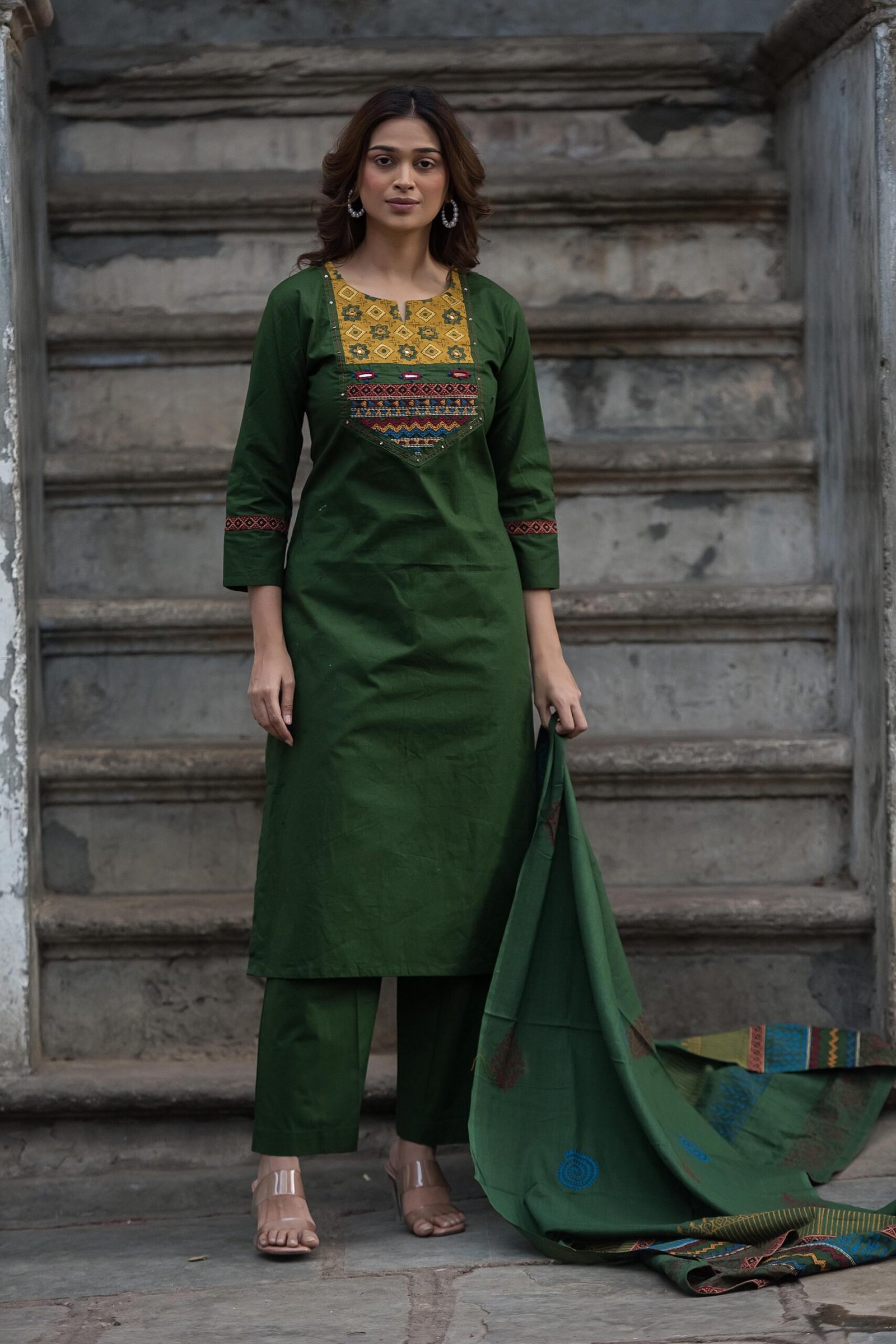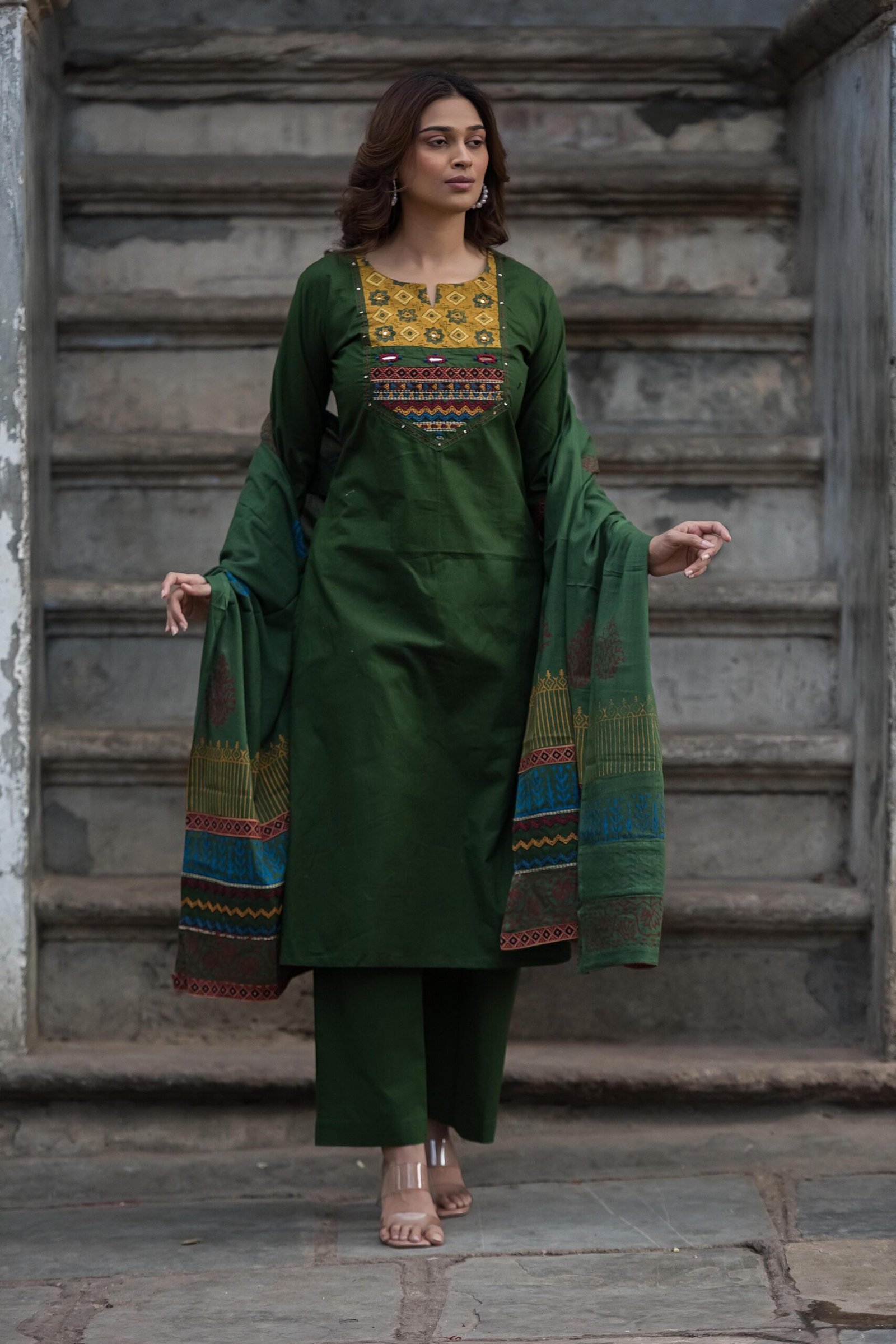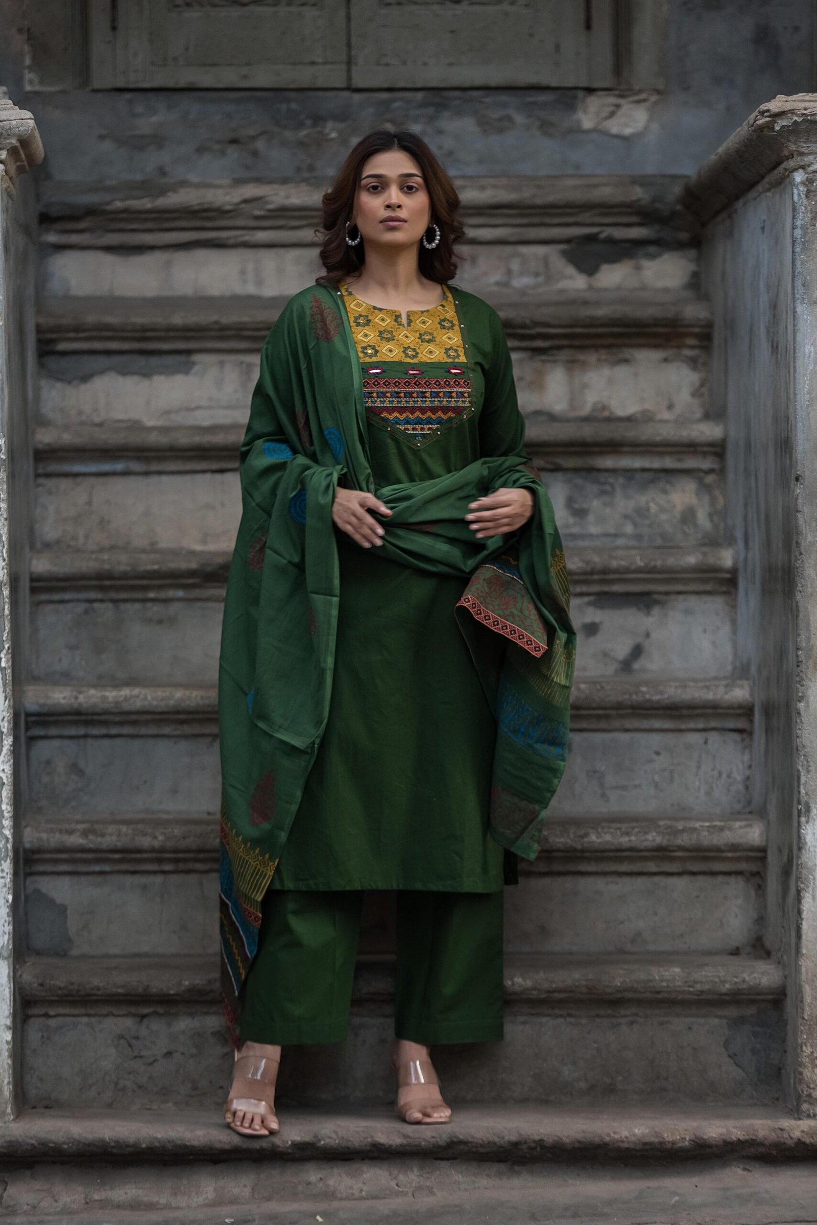 Featuring original Ajrakh patching and a beautifully enhanced dupatta with mirror and handwork embroidery, this outfit stands out for its artisanal charm. Ideal for festive celebrations, cultural functions, and elegant day wear.