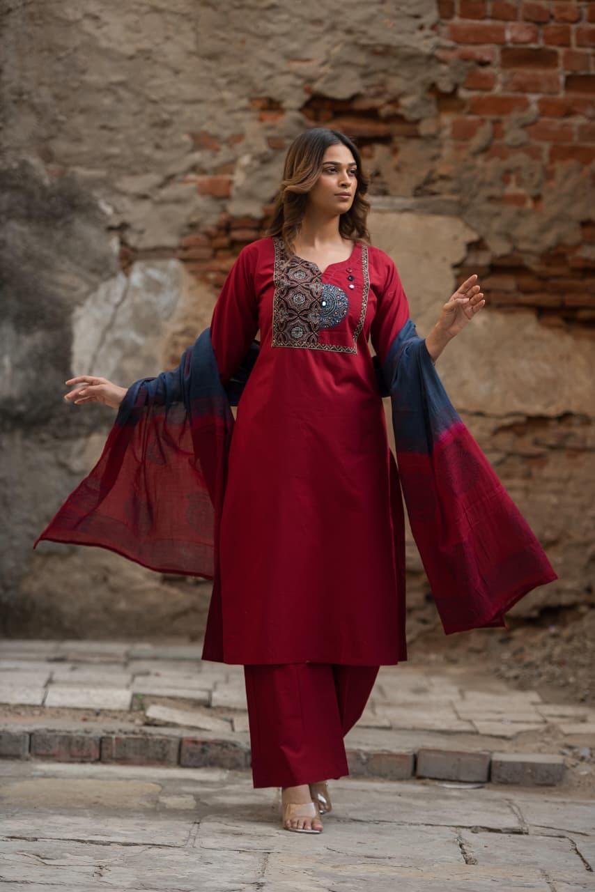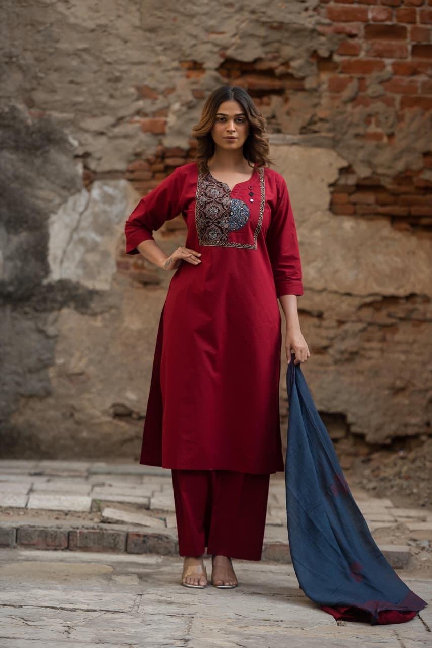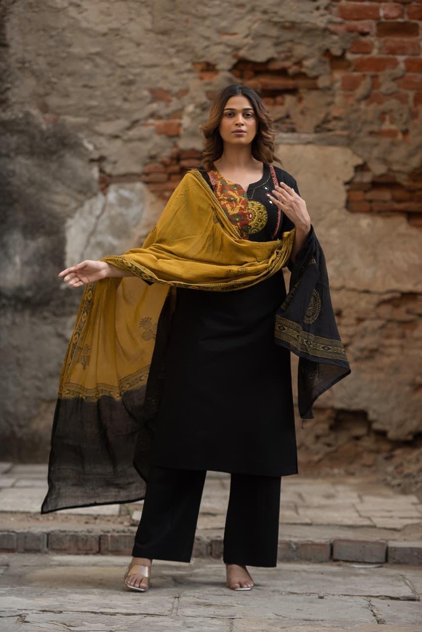 The kurta is enhanced with original Ajrakh patching and elegant mirror work, adding a rich handcrafted charm to the design. Paired with a lightweight Doriya dupatta, this set creates a complete and stylish ethnic ensemble.