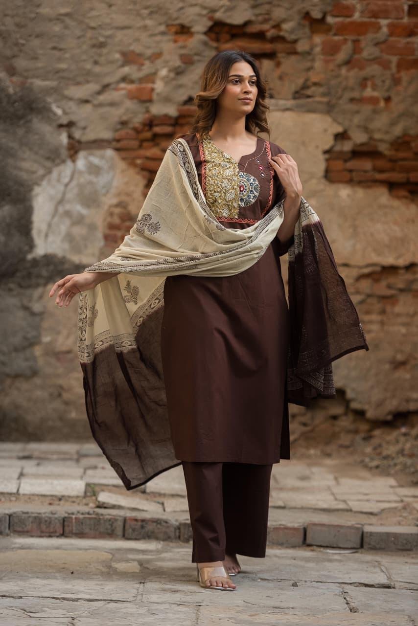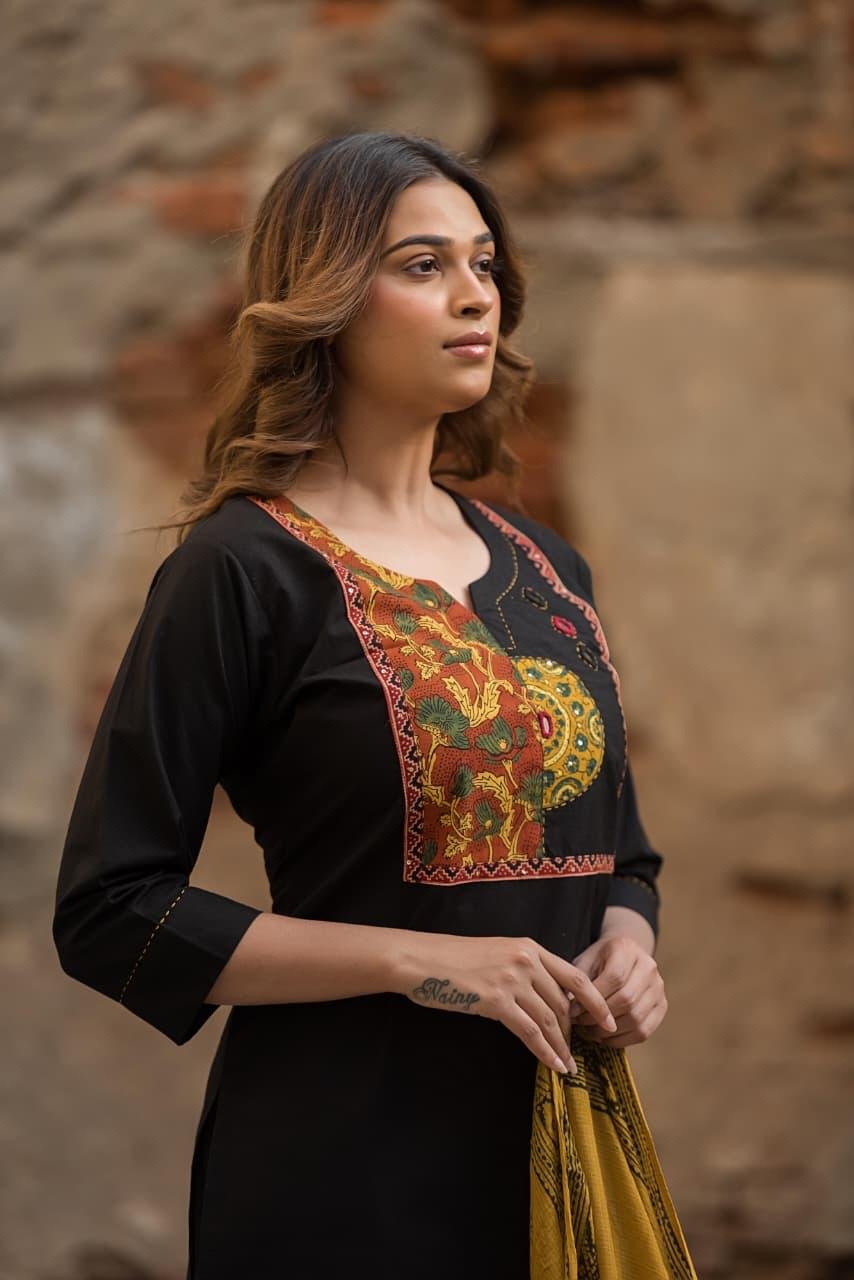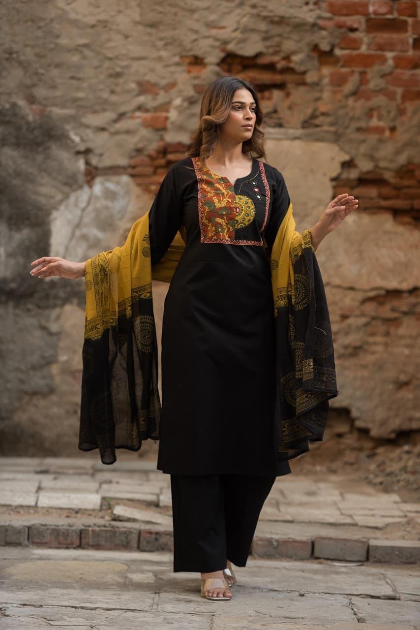 The kurta is enhanced with original Ajrakh patching and elegant mirror work, adding a rich handcrafted charm to the design. Paired with a lightweight Doriya dupatta, this set creates a complete and stylish ethnic ensemble.