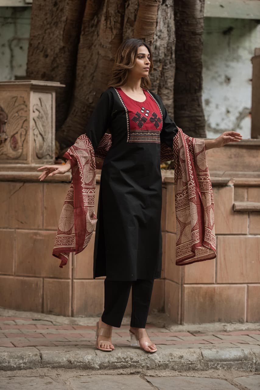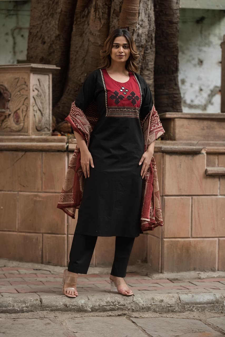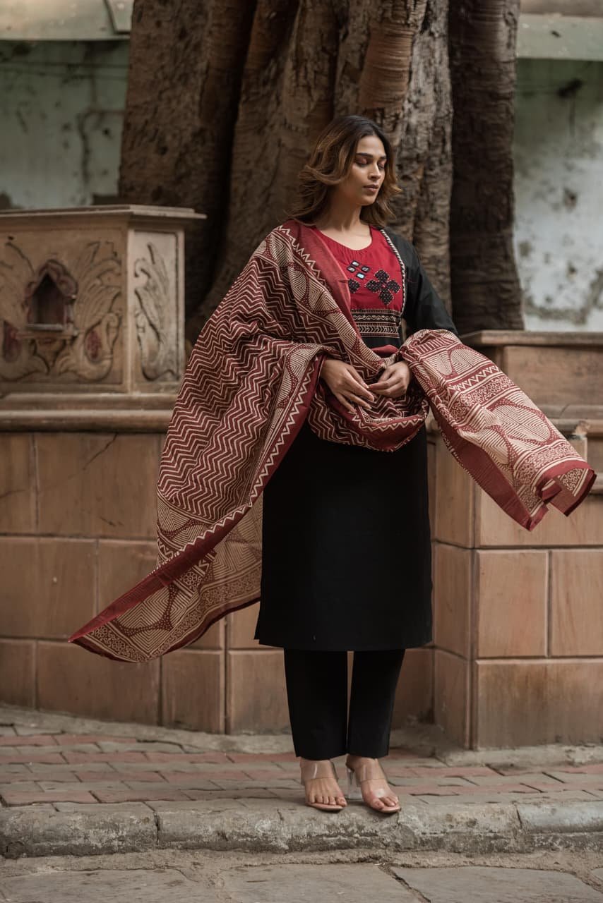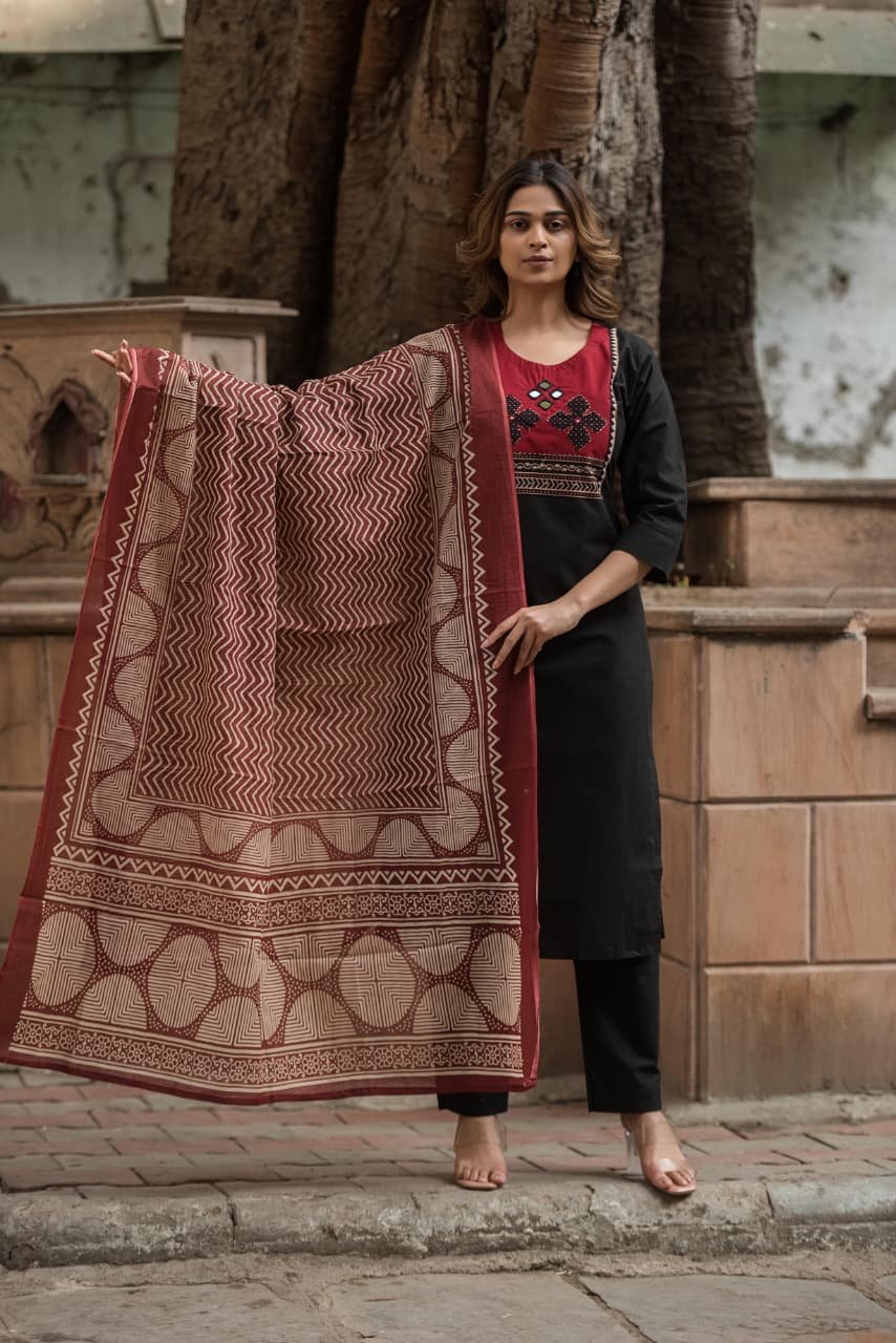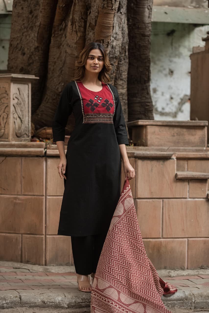 The kurta features intricate appliqué and handwork that adds artisanal charm, while the lightweight Kota Doriya dupatta enhances the look with its sheer, graceful texture. Ideal for everyday wear, office styling, and cultural outings, this set offers effortless sophistication.