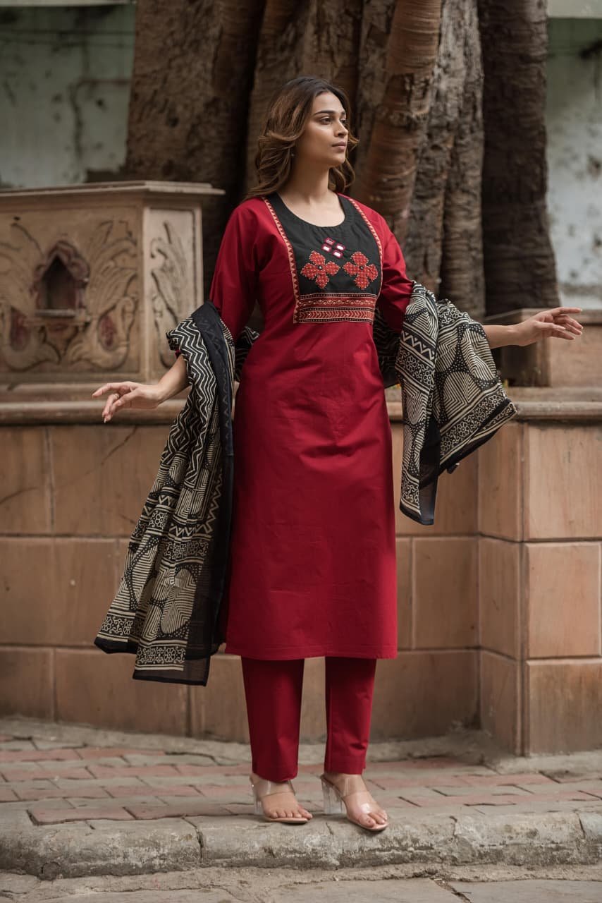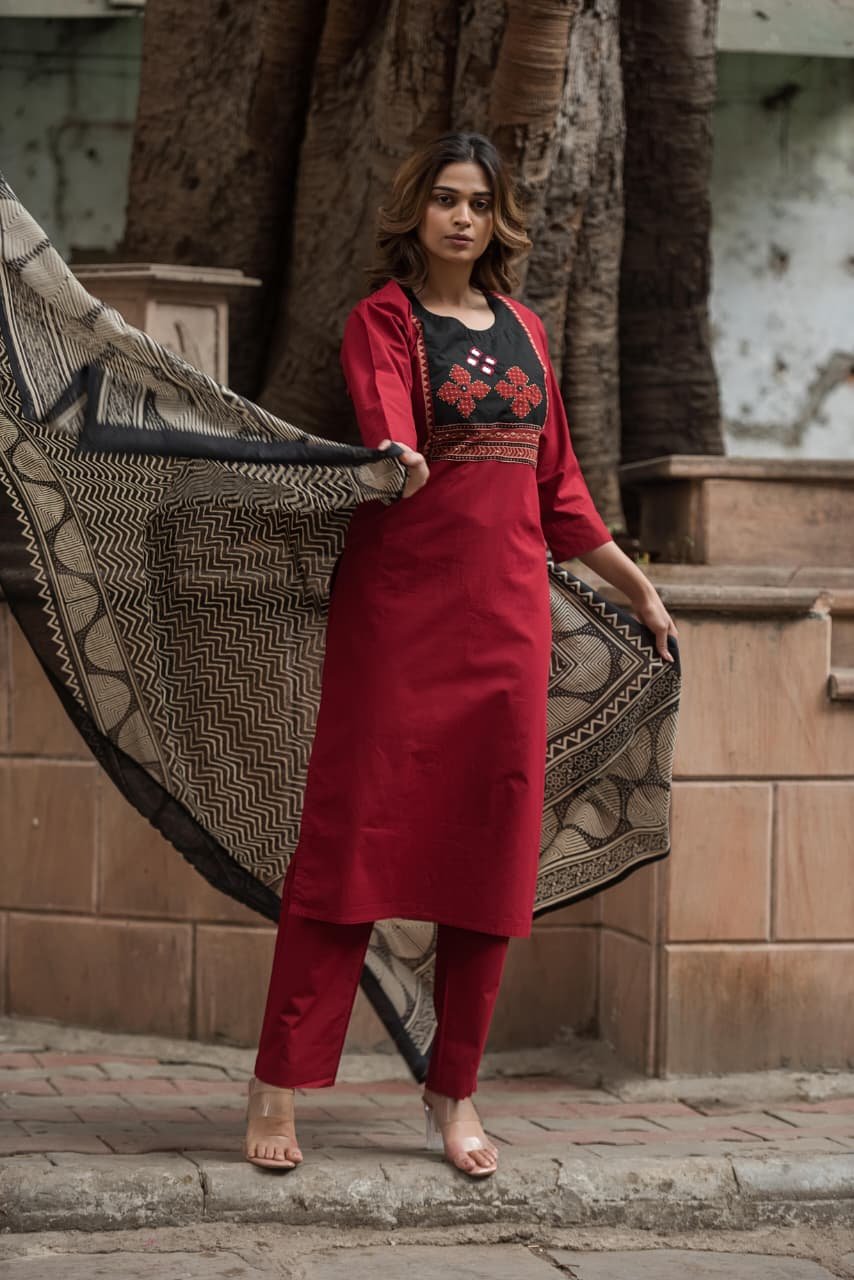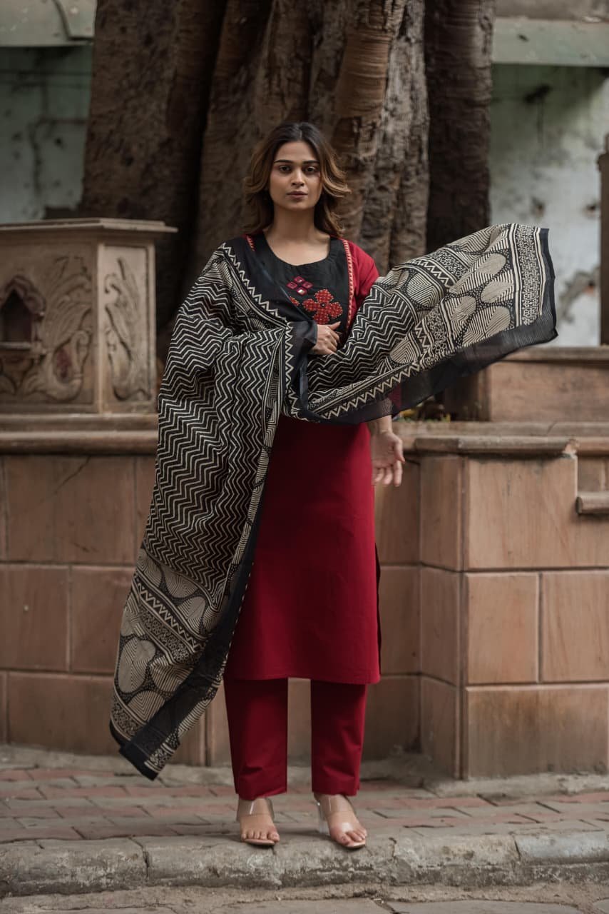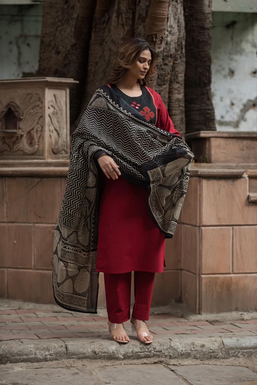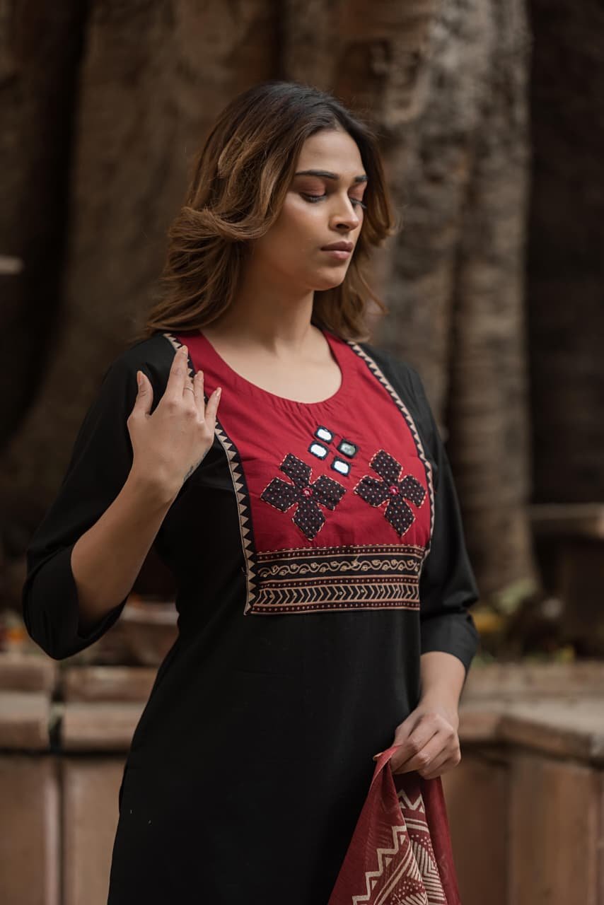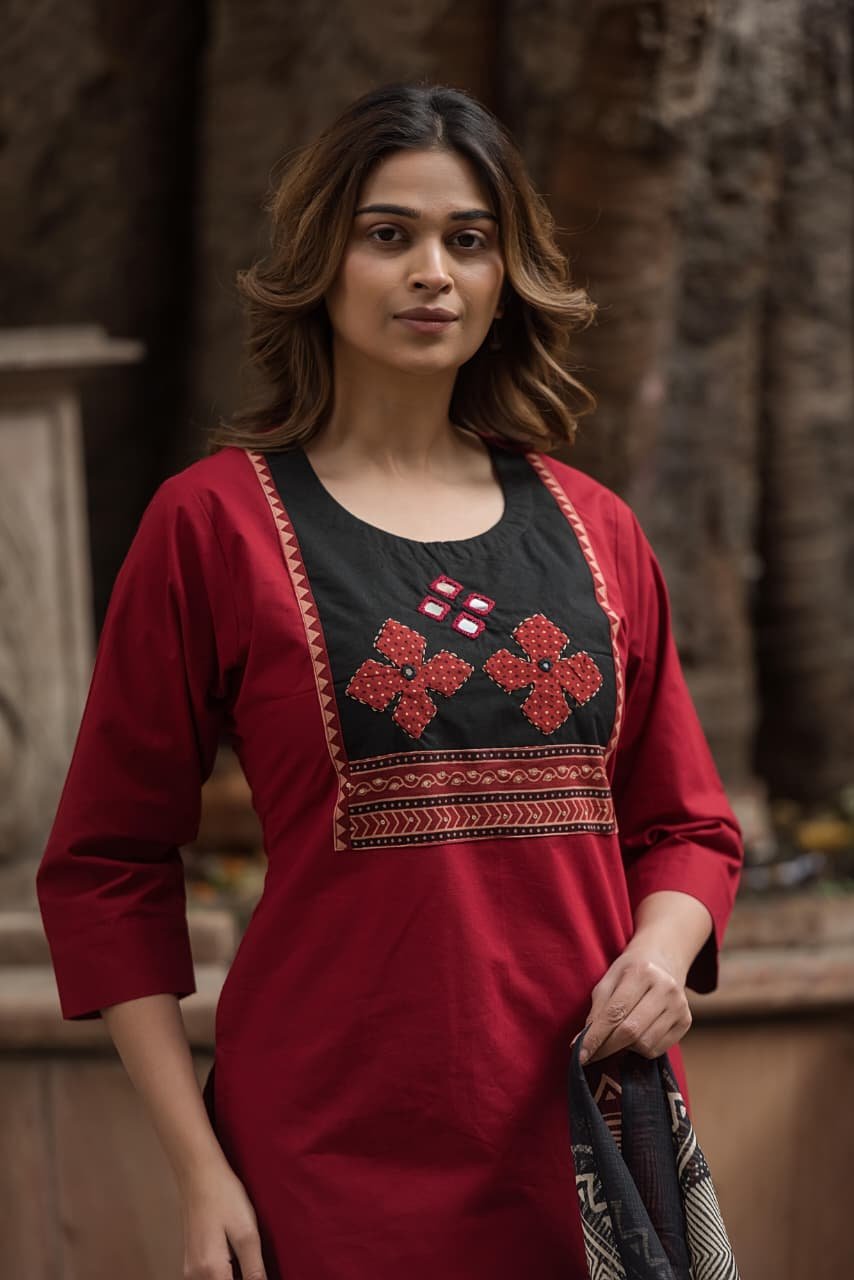 The kurta features intricate appliqué and handwork that adds artisanal charm, while the lightweight Kota Doriya dupatta enhances the look with its sheer, graceful texture. Ideal for everyday wear, office styling, and cultural outings, this set offers effortless sophistication.
