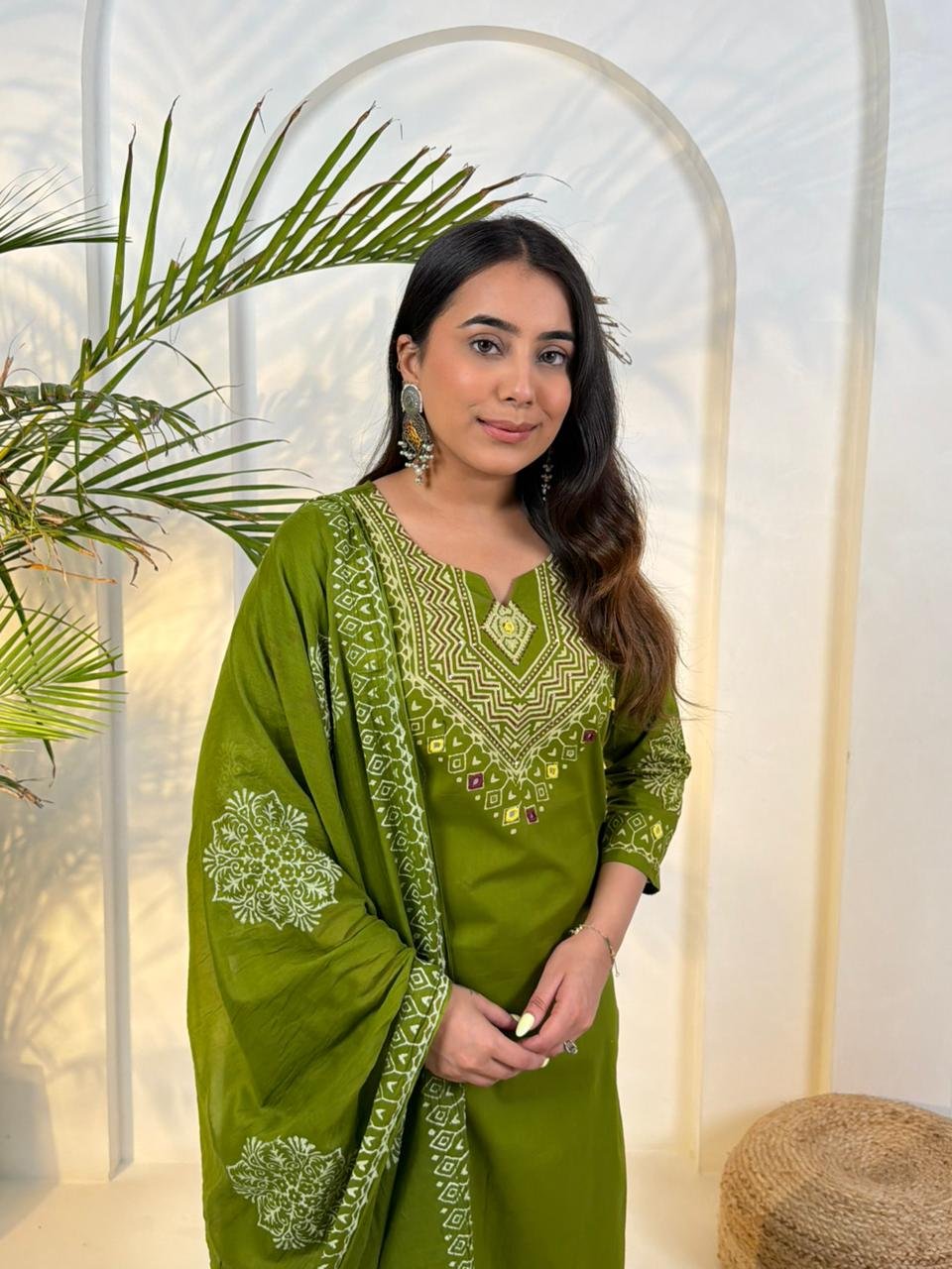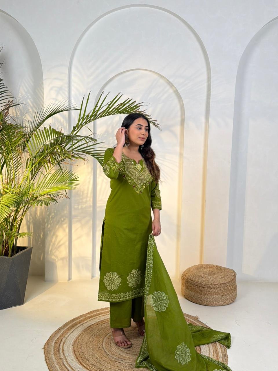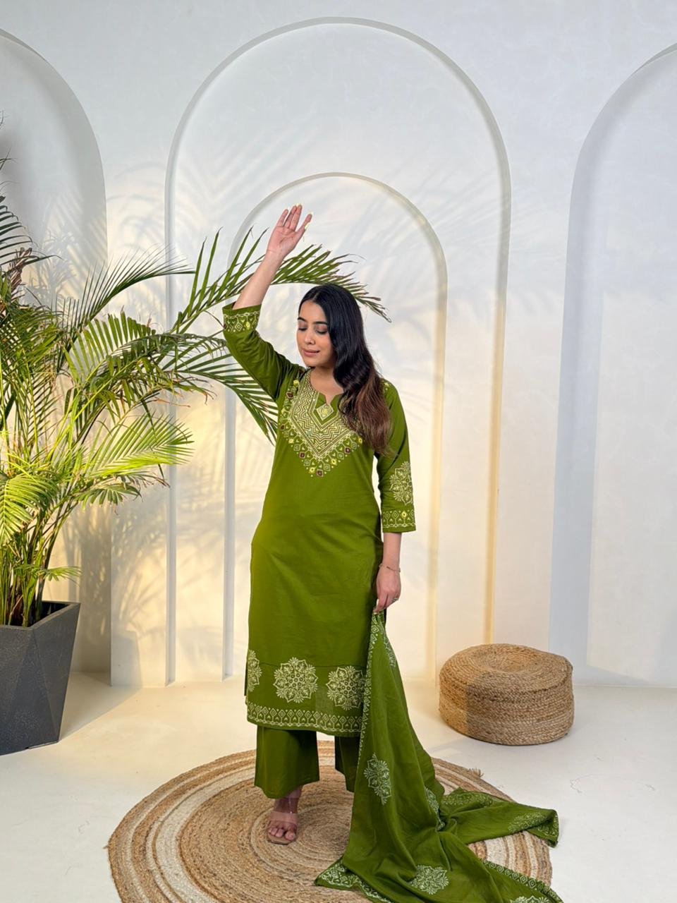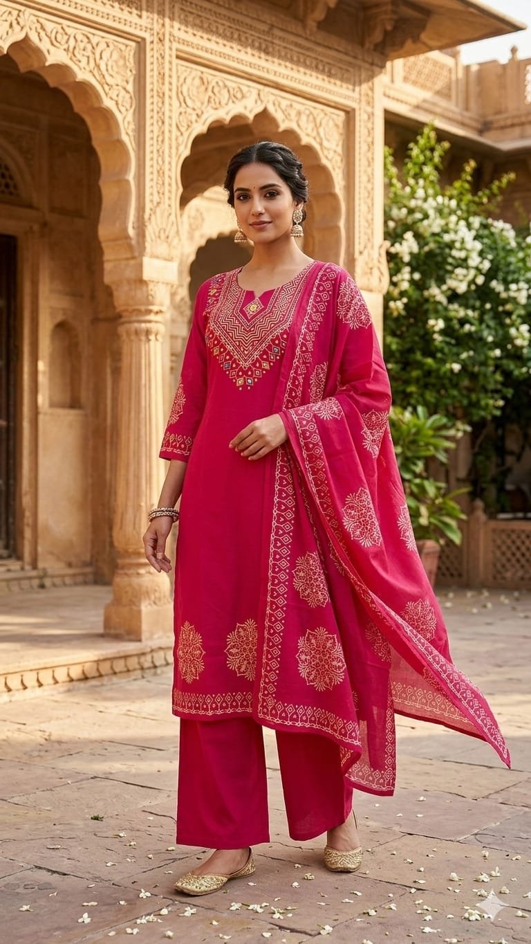 The DU-048 Dabu 3PC Set reflects traditional craftsmanship with a stylish ethnic look. Crafted from authentic Dabu cotton, the outfit features handblock prints combined with handwork detailing.