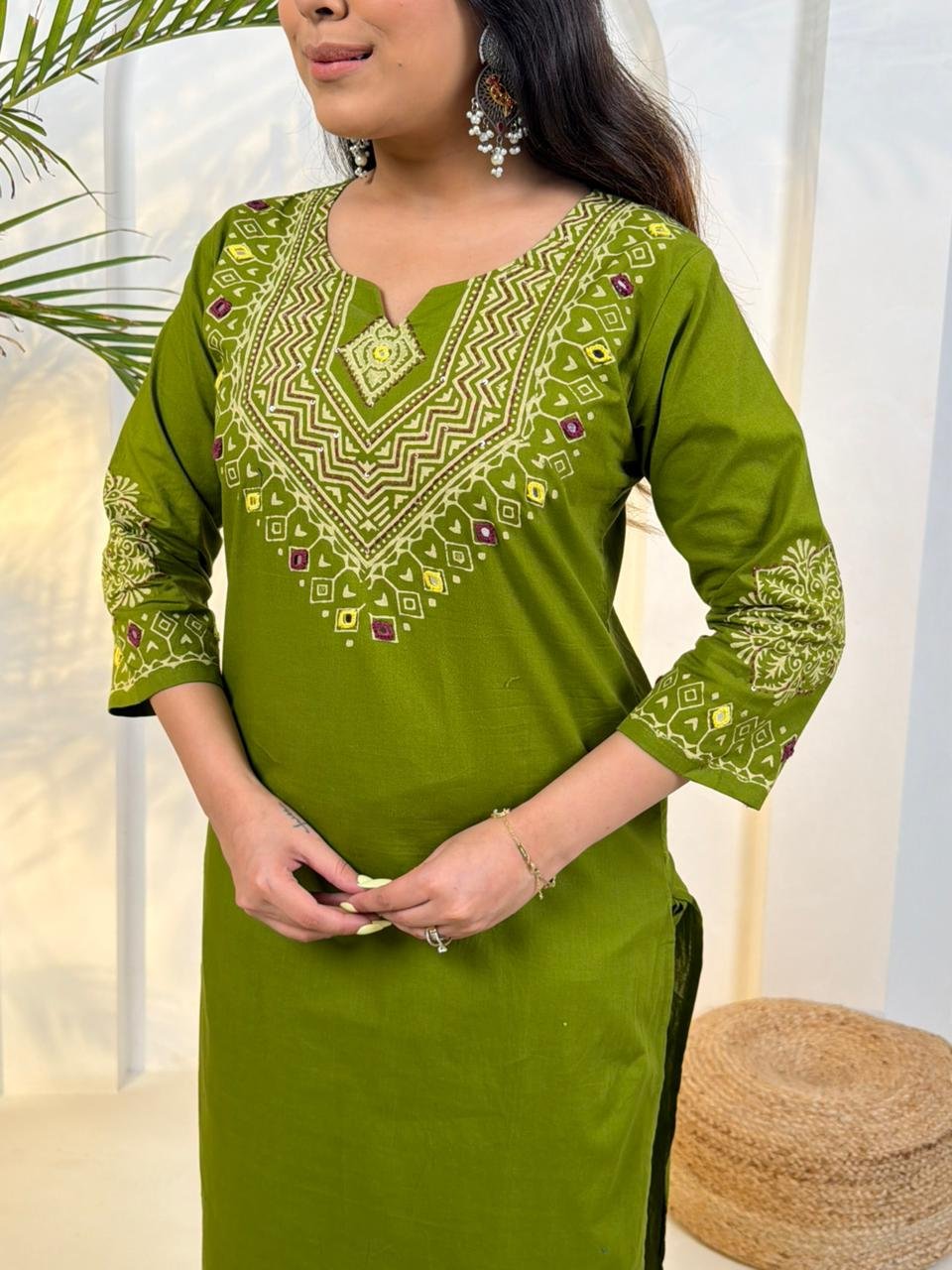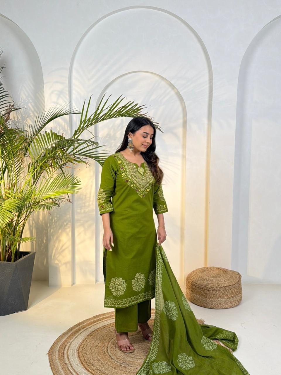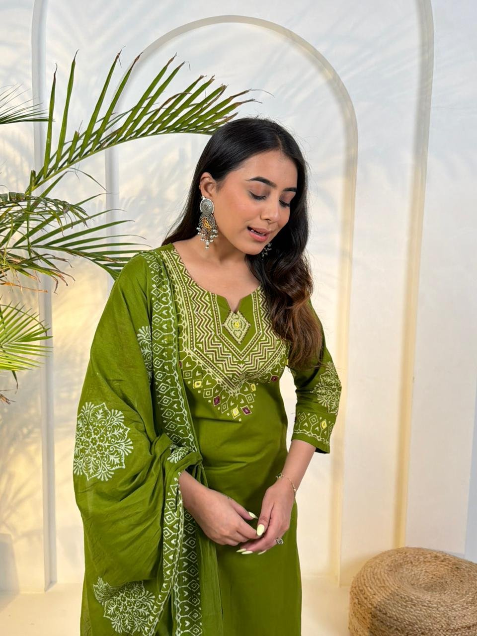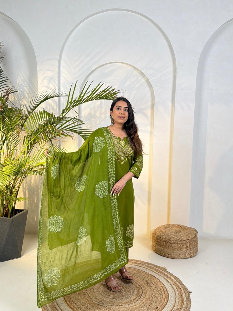 The DU-048 Dabu 3PC Set reflects traditional craftsmanship with a stylish ethnic look. Crafted from authentic Dabu cotton, the outfit features handblock prints combined with handwork detailing.