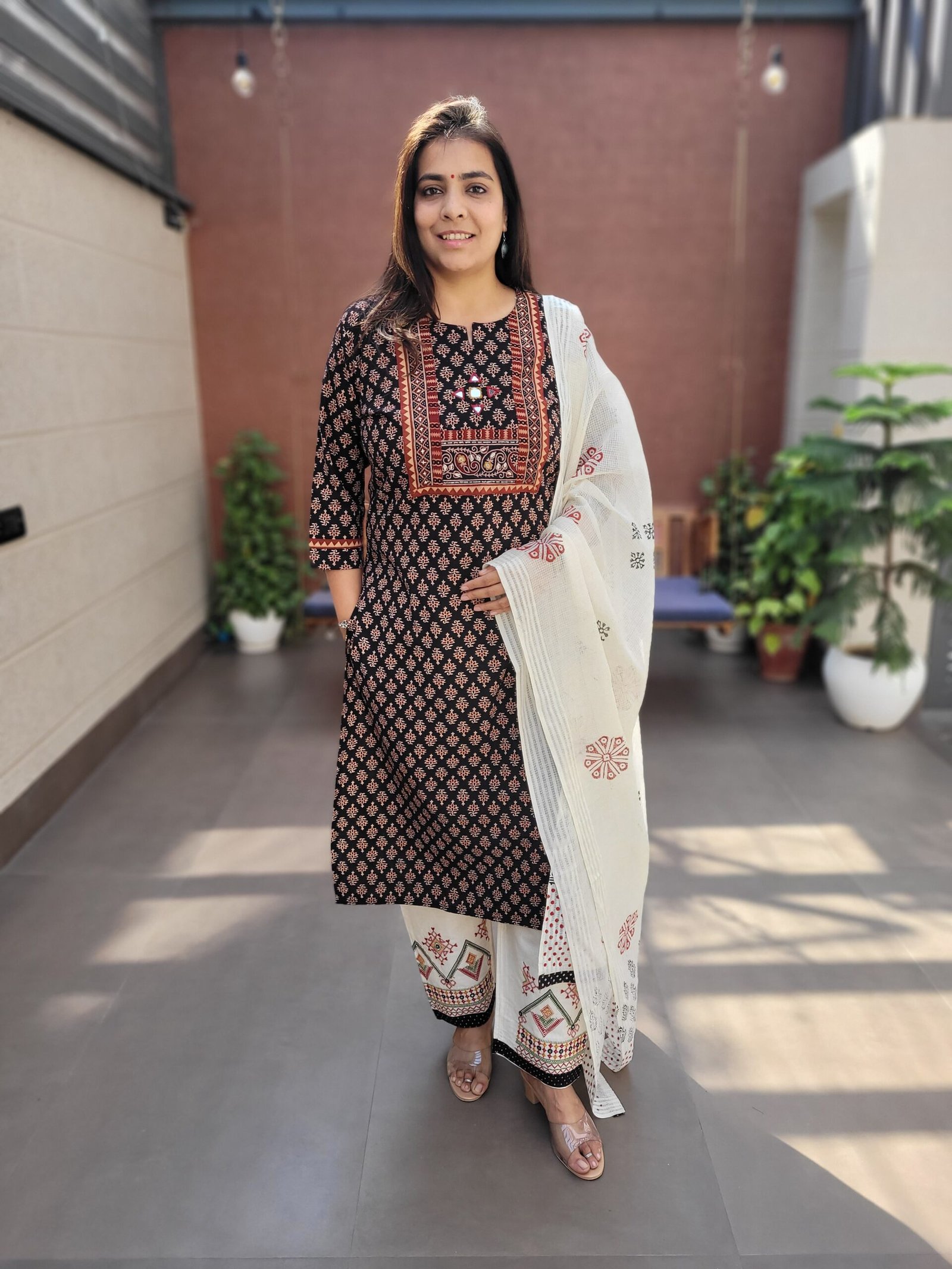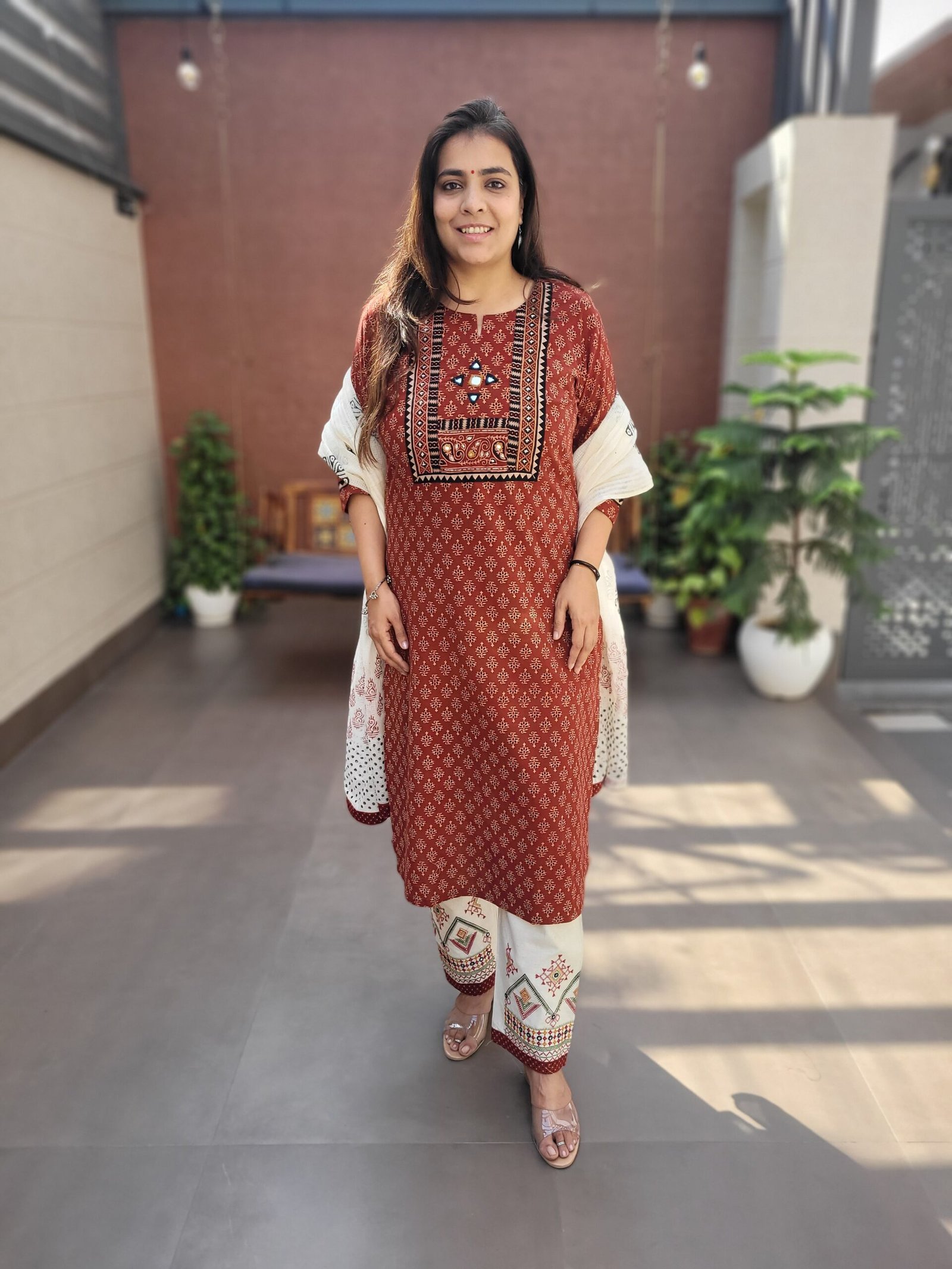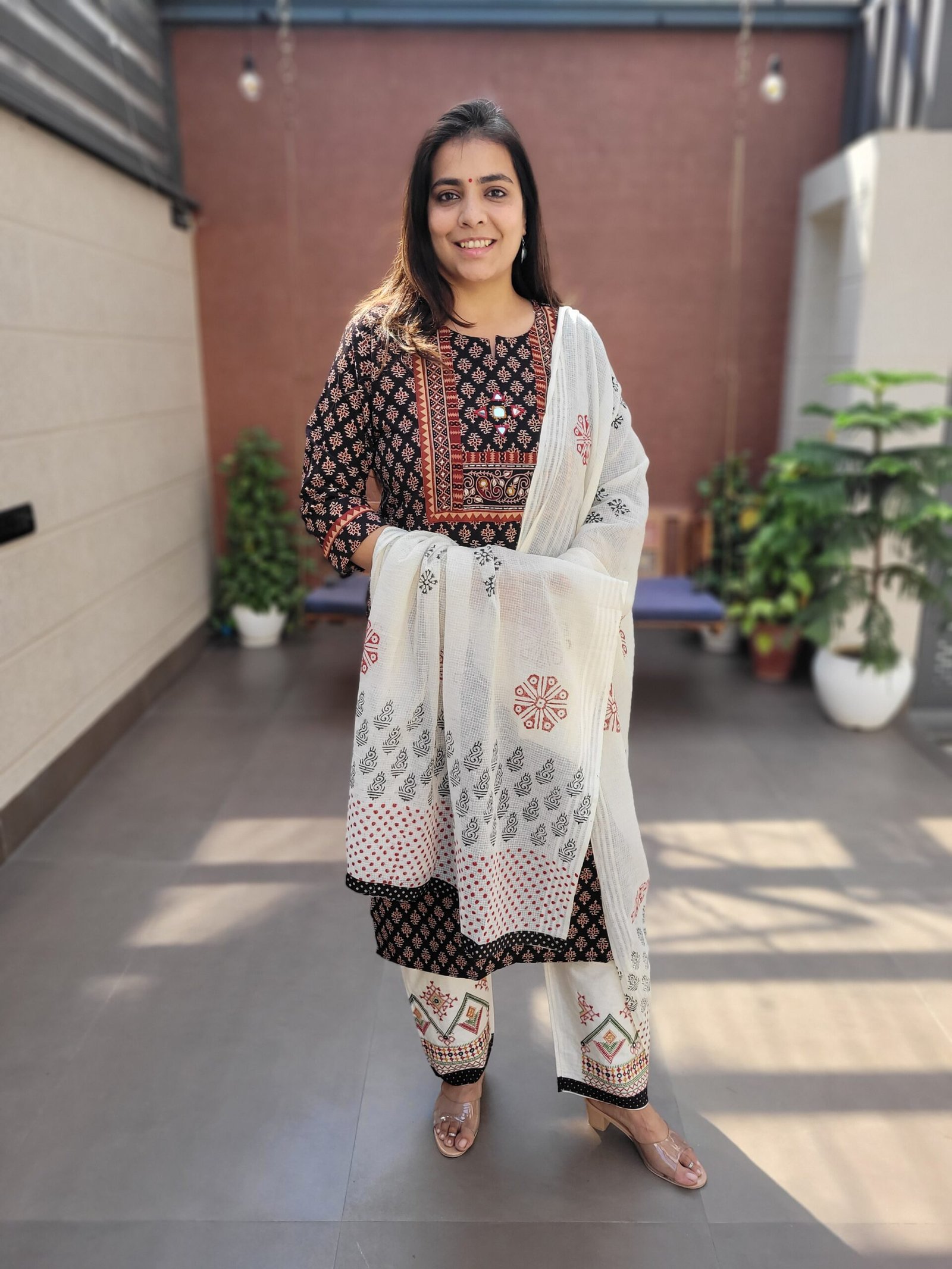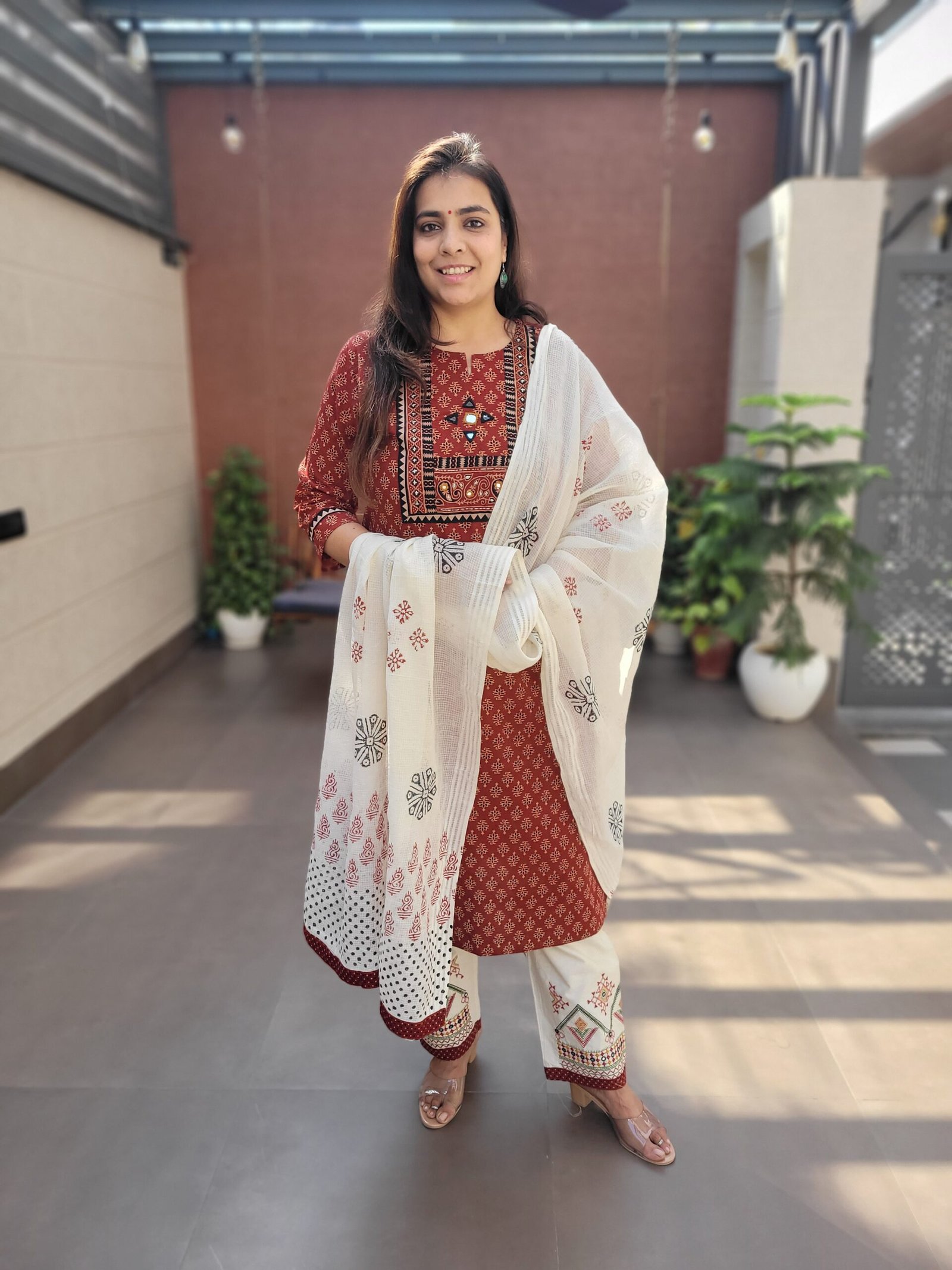 The kurta features embroidery with mirror work, adding a subtle festive shine. The embroidered palazzo and Kota handblock dupatta complete the outfit with traditional charm.