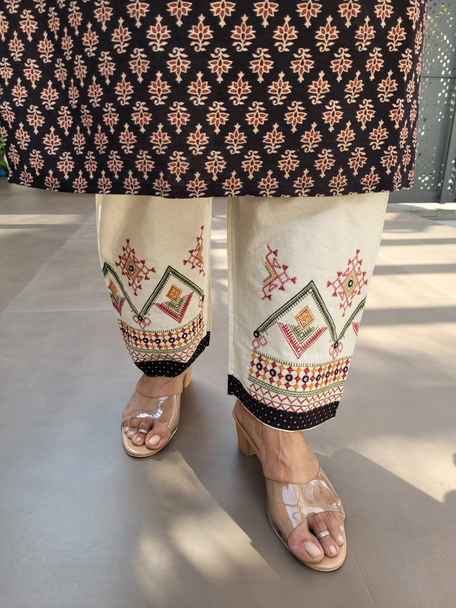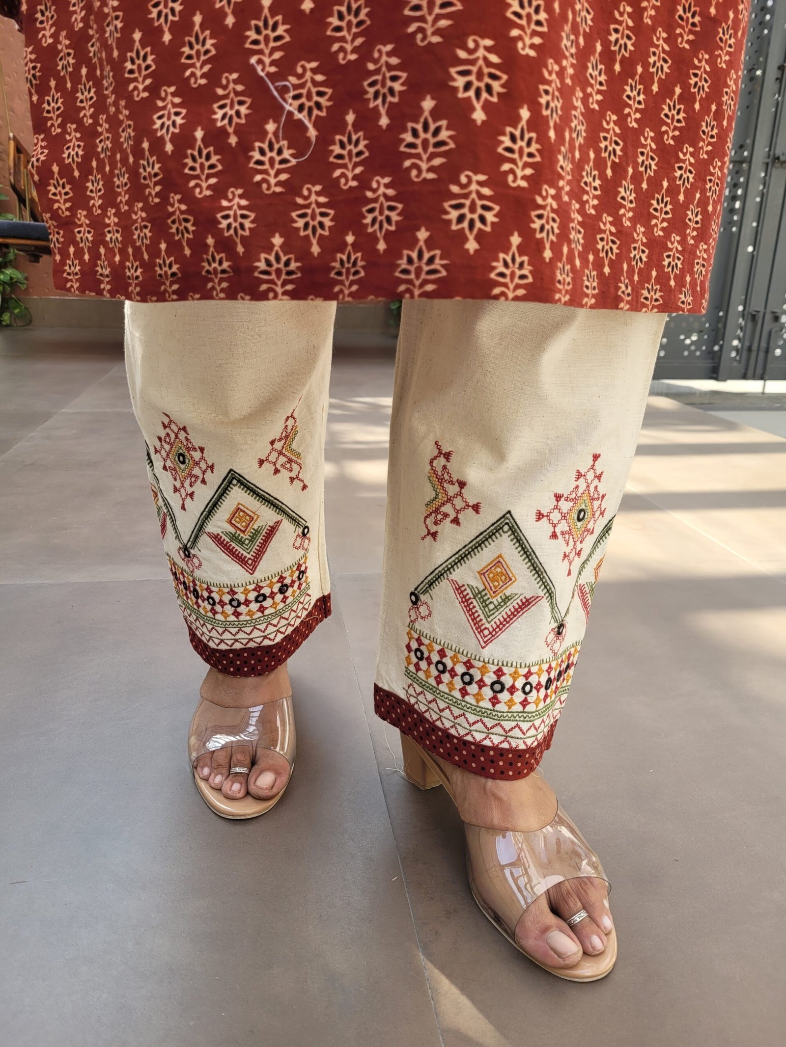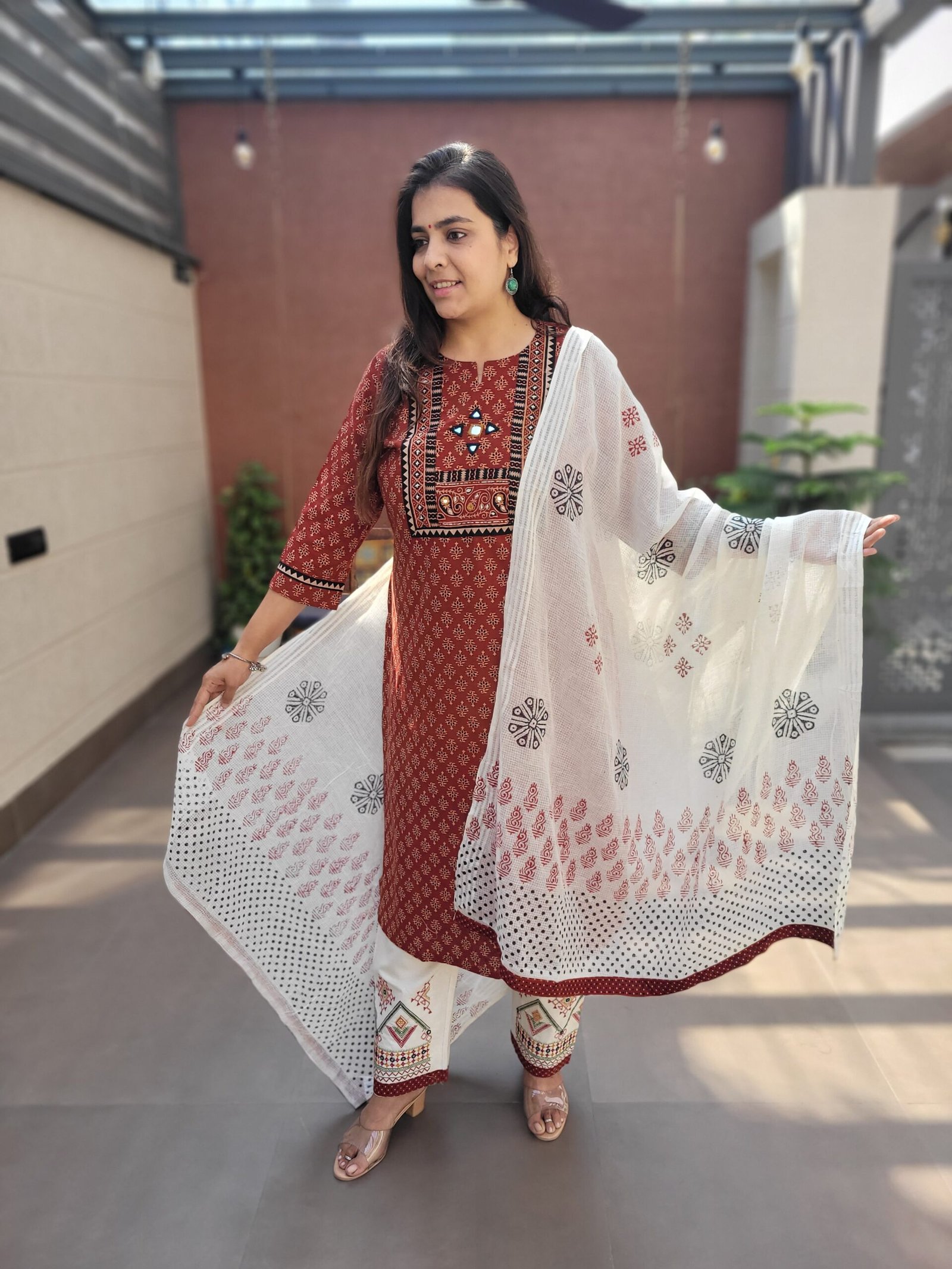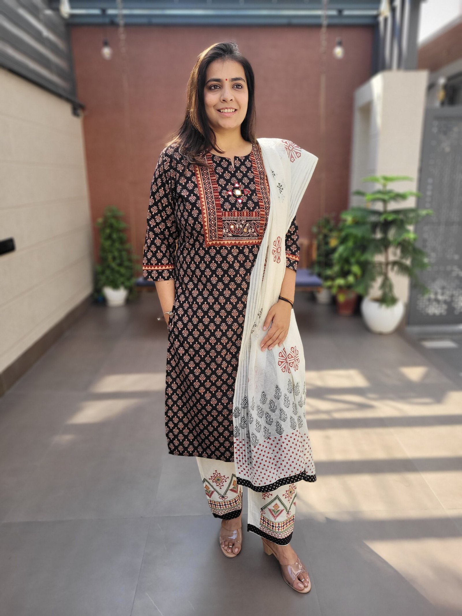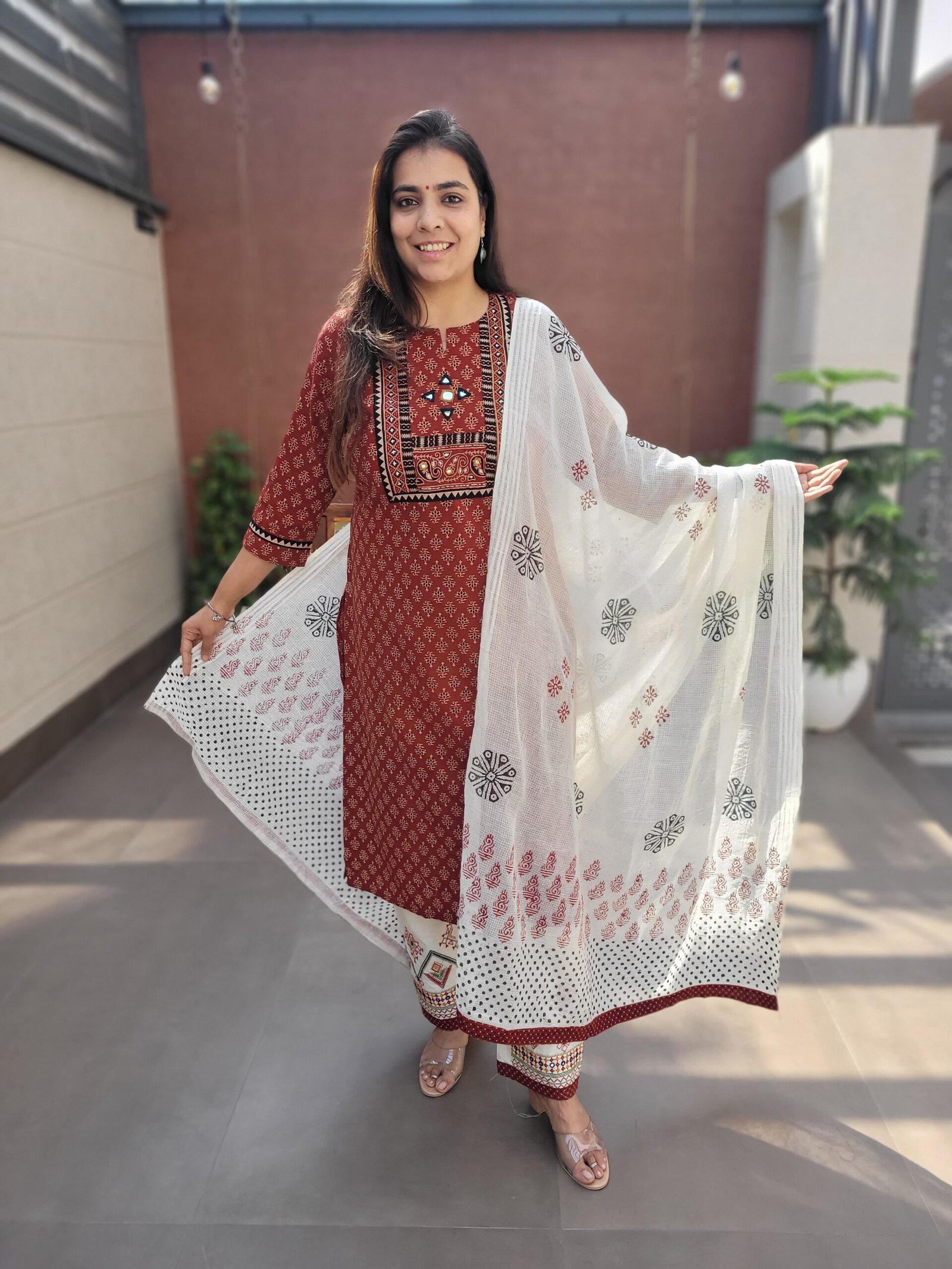 The kurta features embroidery with mirror work, adding a subtle festive shine. The embroidered palazzo and Kota handblock dupatta complete the outfit with traditional charm.