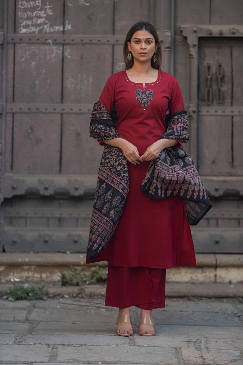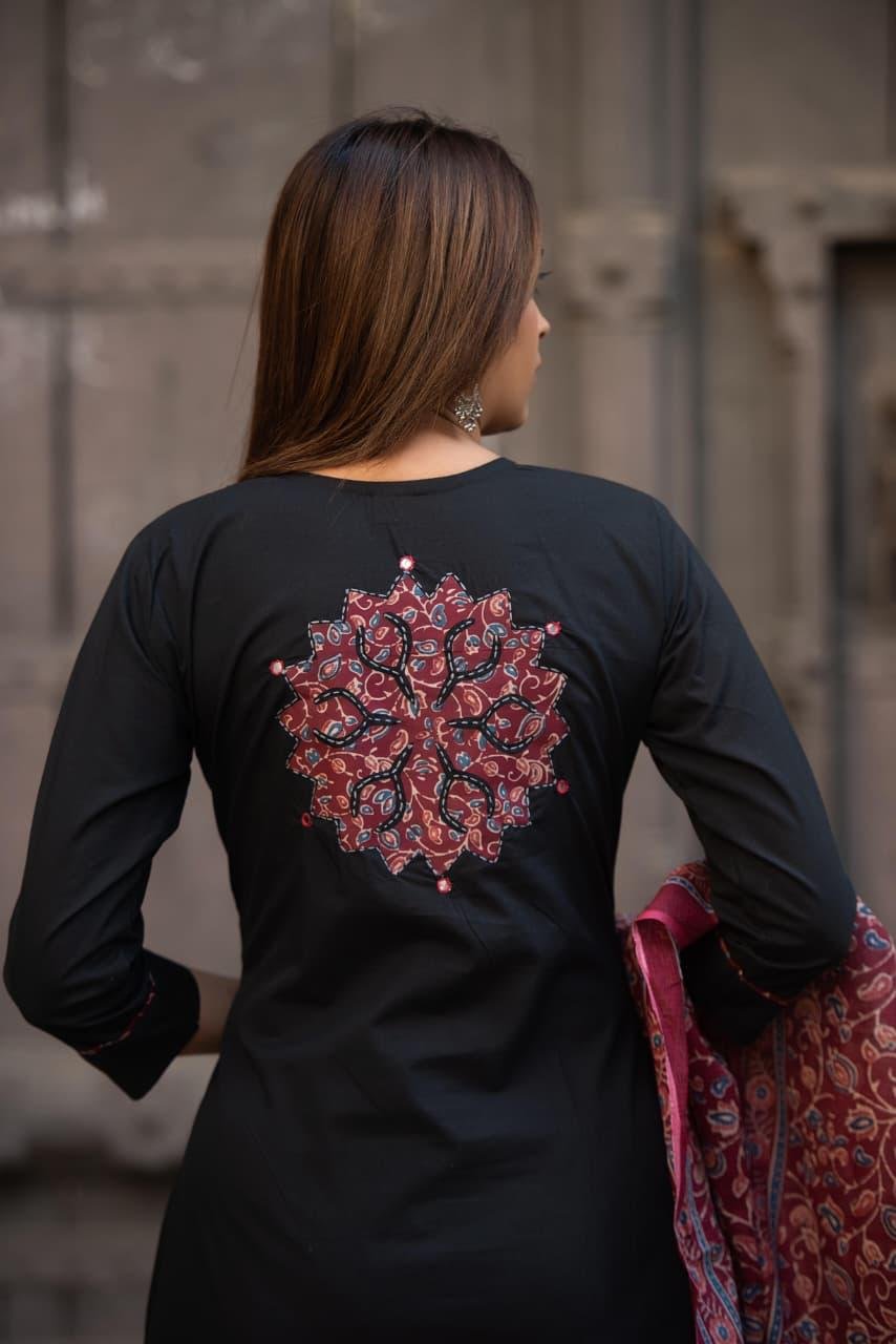 The DU-098 Dabu 3PC Set reflects the beauty of traditional Indian textile art. Crafted from Dabu cotton, this ensemble features authentic Ajrakh patching on both front and back, enhanced with fine handwork.