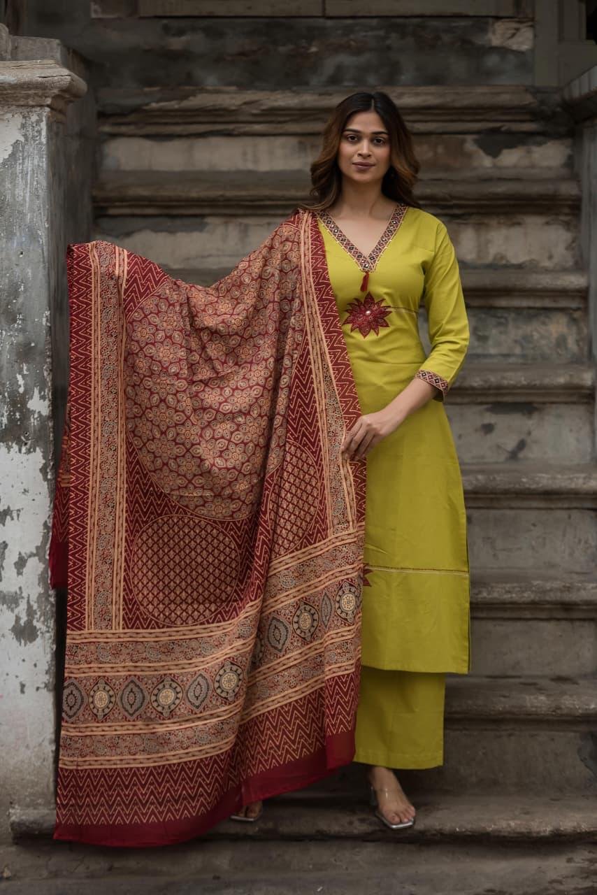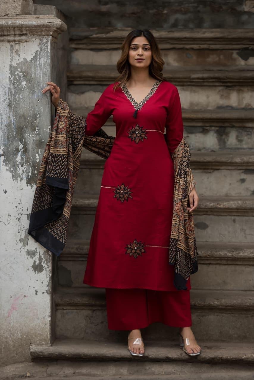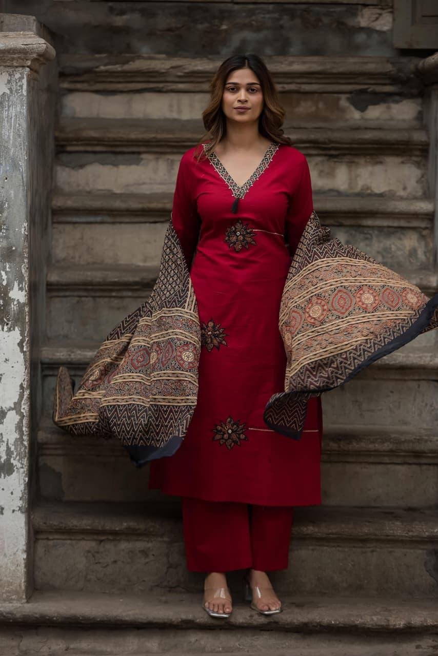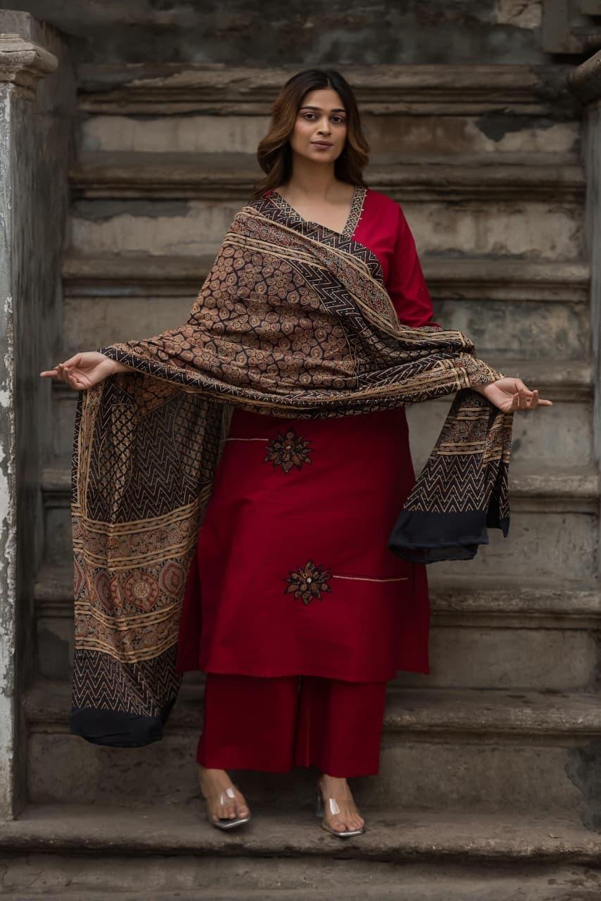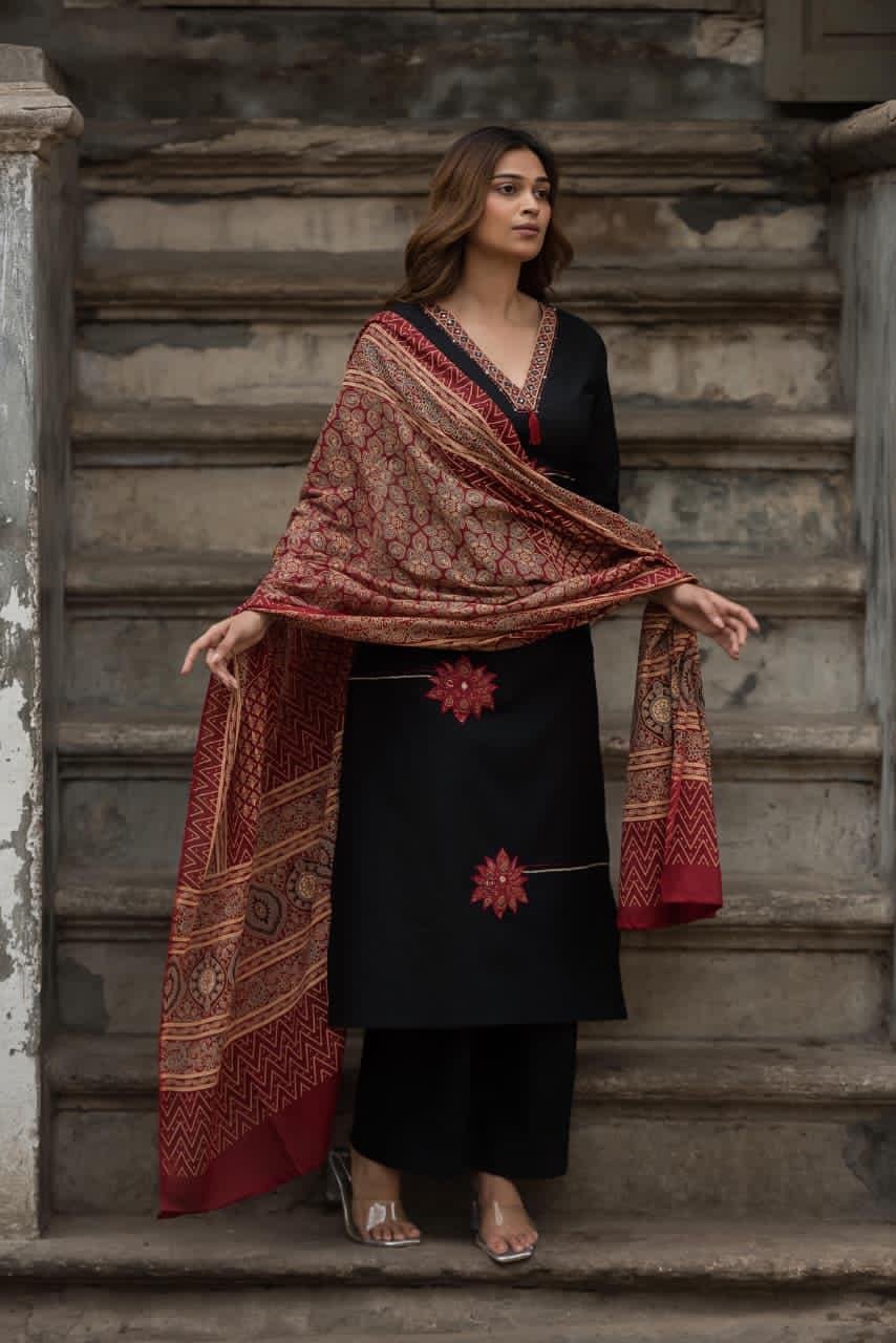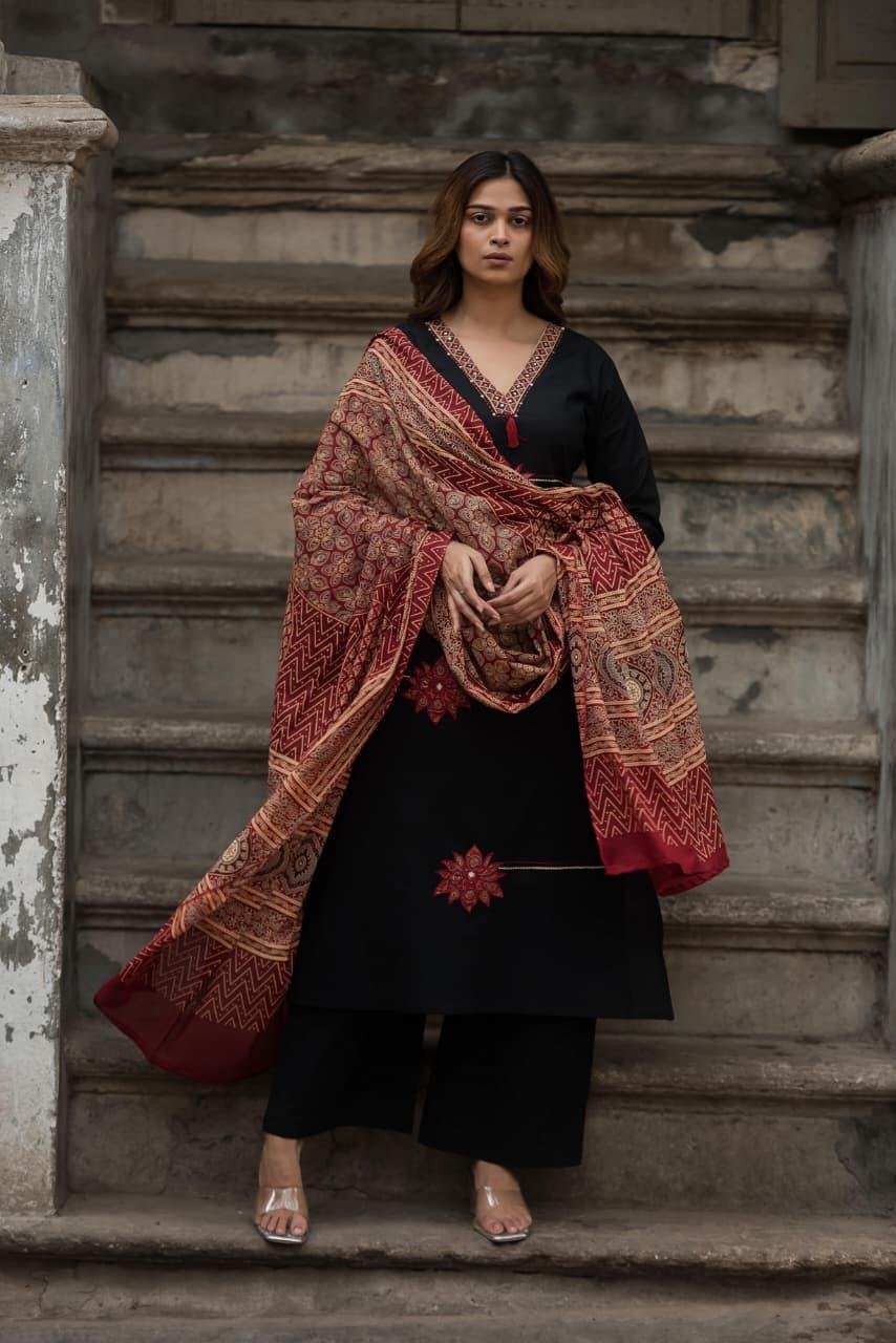 The kurta features elegant appliqué work and hand detailing, along with double side pockets enhanced with work for both style and functionality. Paired with a classic Ajrakh print dupatta, this ensemble is perfect for festive gatherings, cultural events, or refined daily wear.