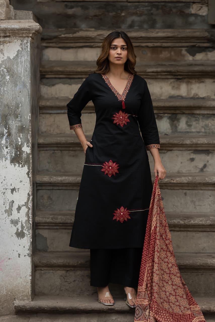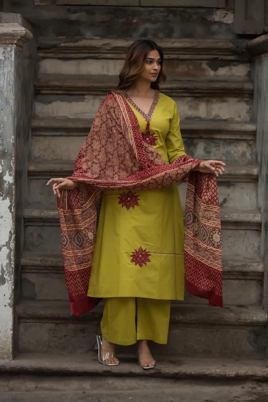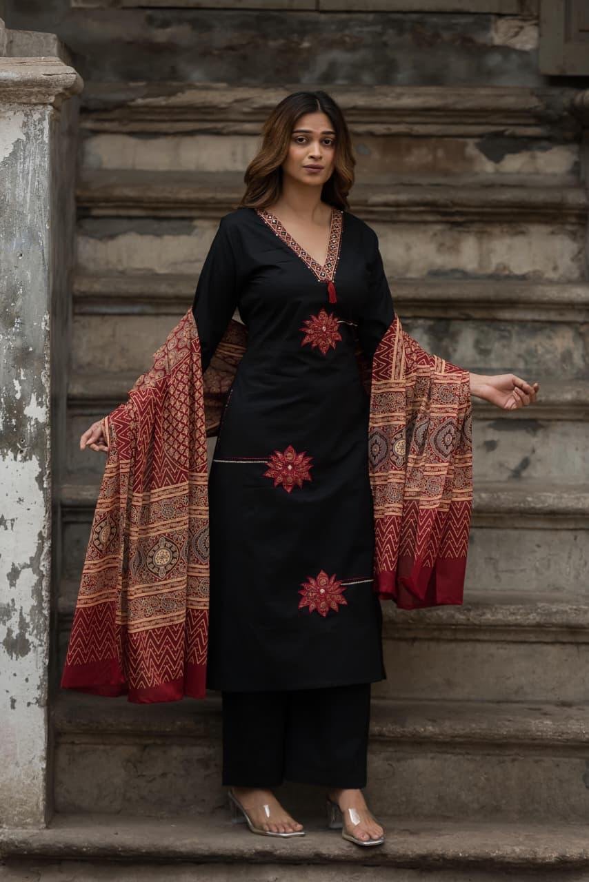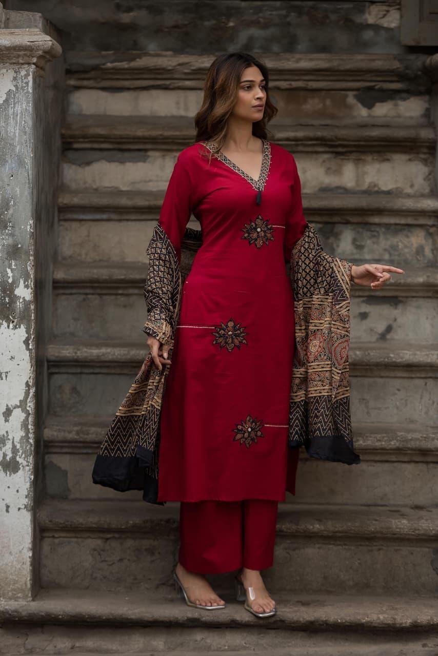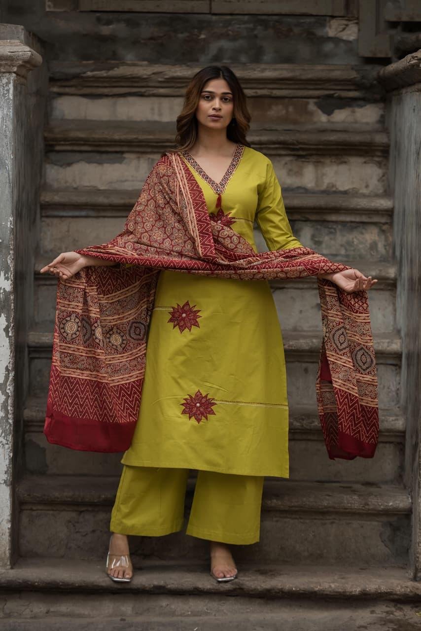 The kurta features elegant appliqué work and hand detailing, along with double side pockets enhanced with work for both style and functionality. Paired with a classic Ajrakh print dupatta, this ensemble is perfect for festive gatherings, cultural events, or refined daily wear.