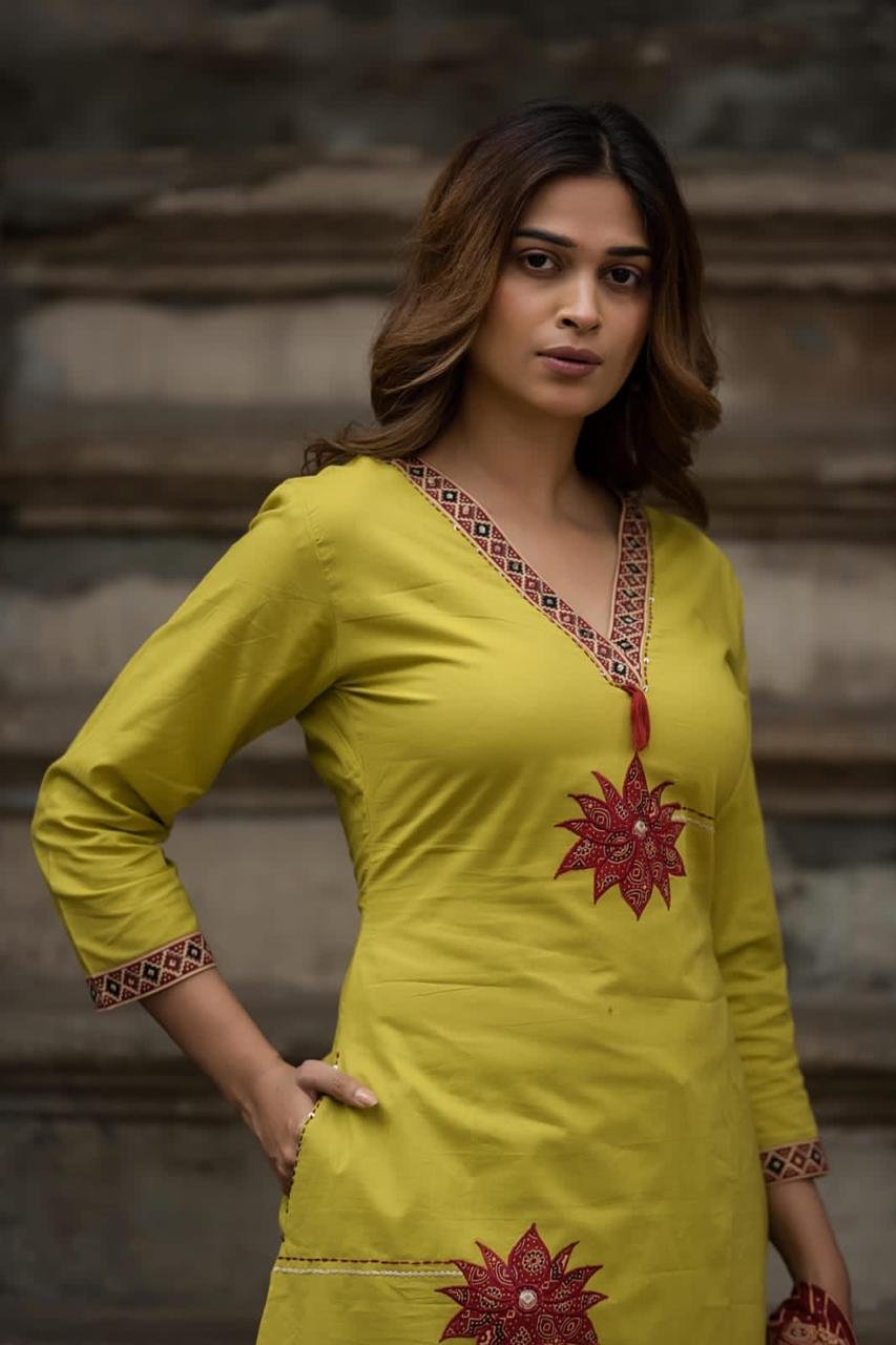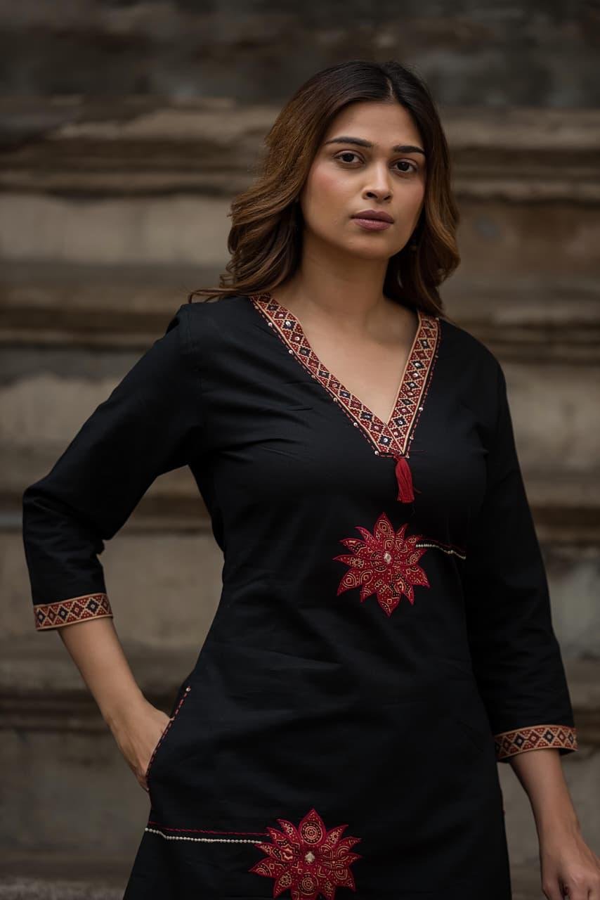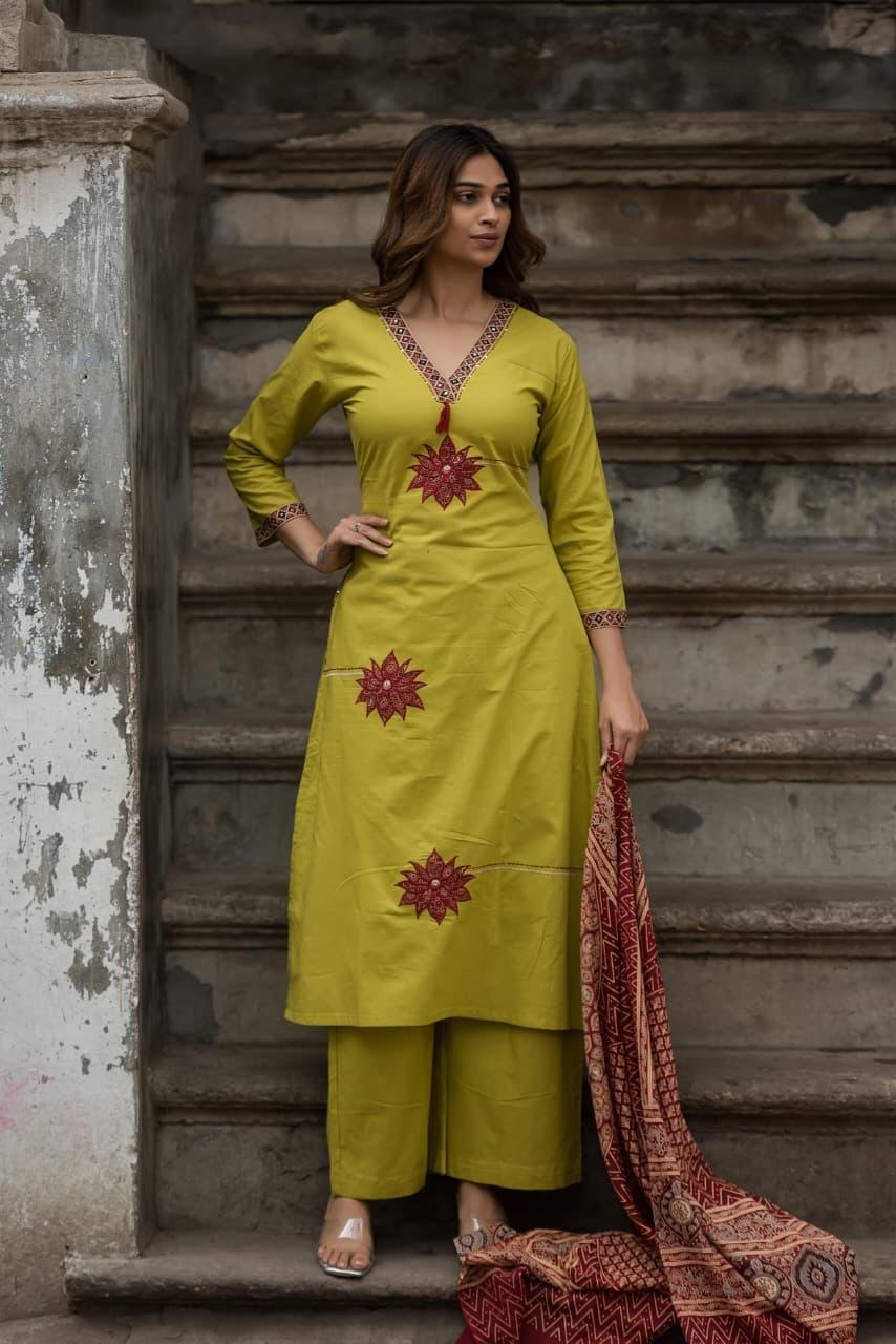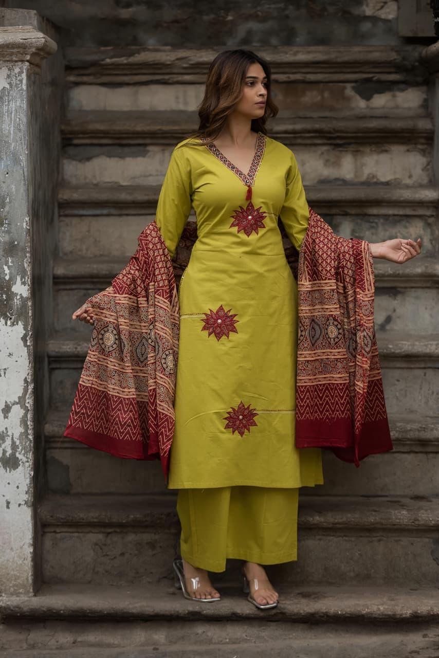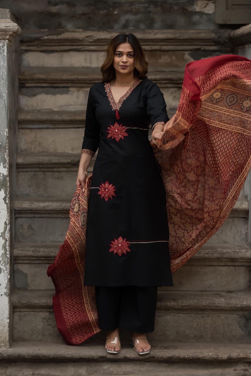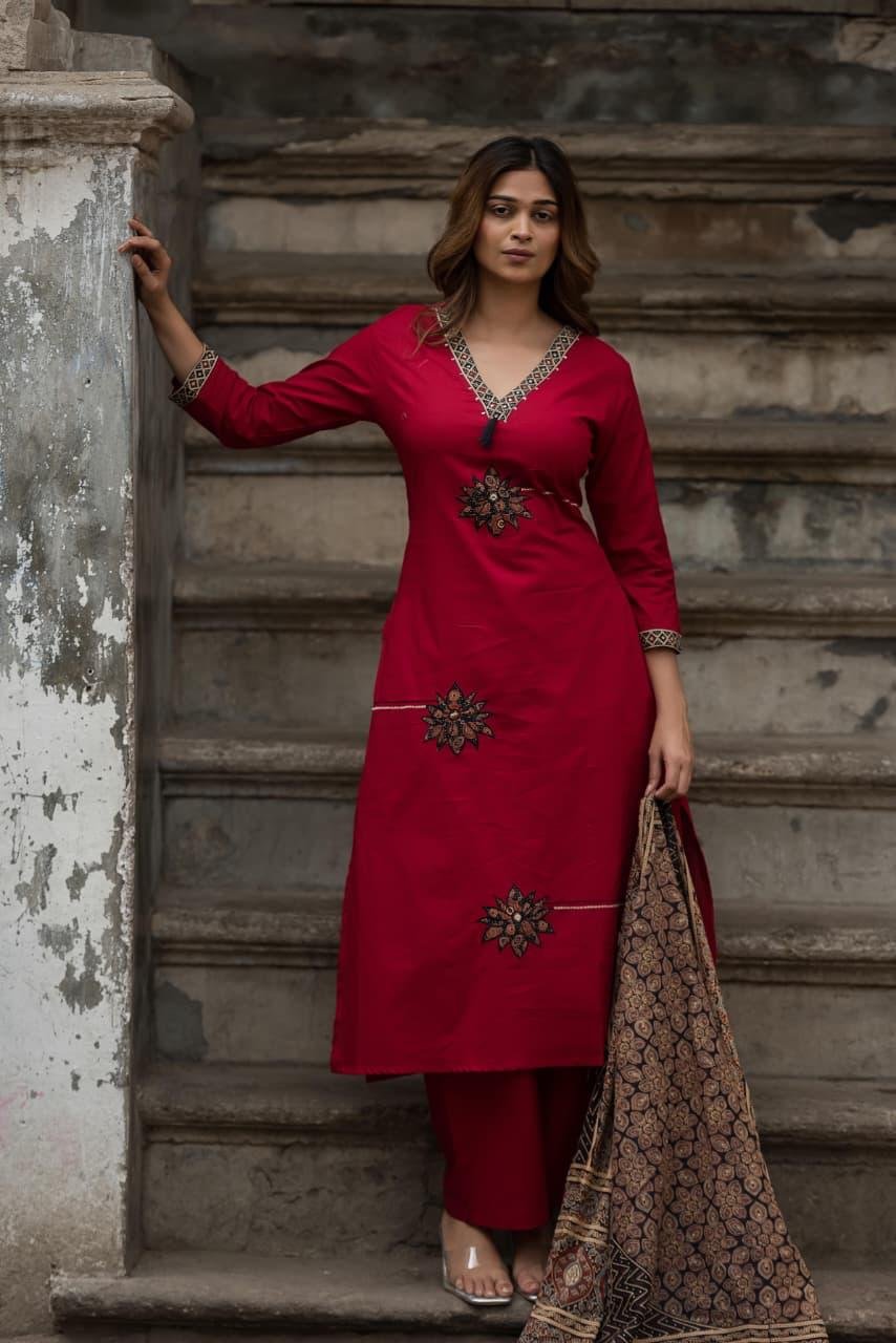 The kurta features elegant appliqué work and hand detailing, along with double side pockets enhanced with work for both style and functionality. Paired with a classic Ajrakh print dupatta, this ensemble is perfect for festive gatherings, cultural events, or refined daily wear.