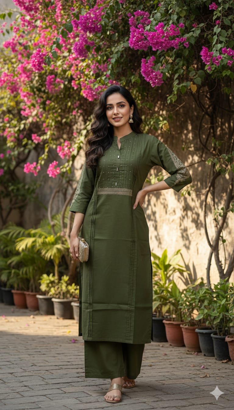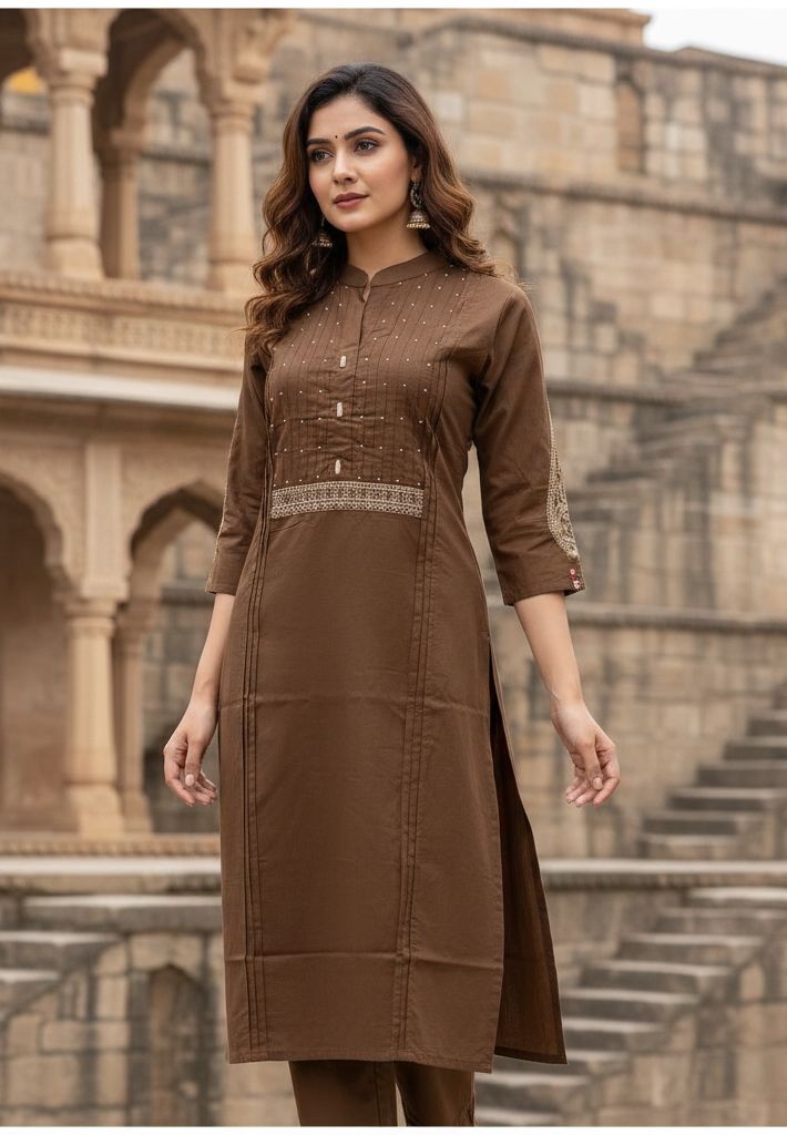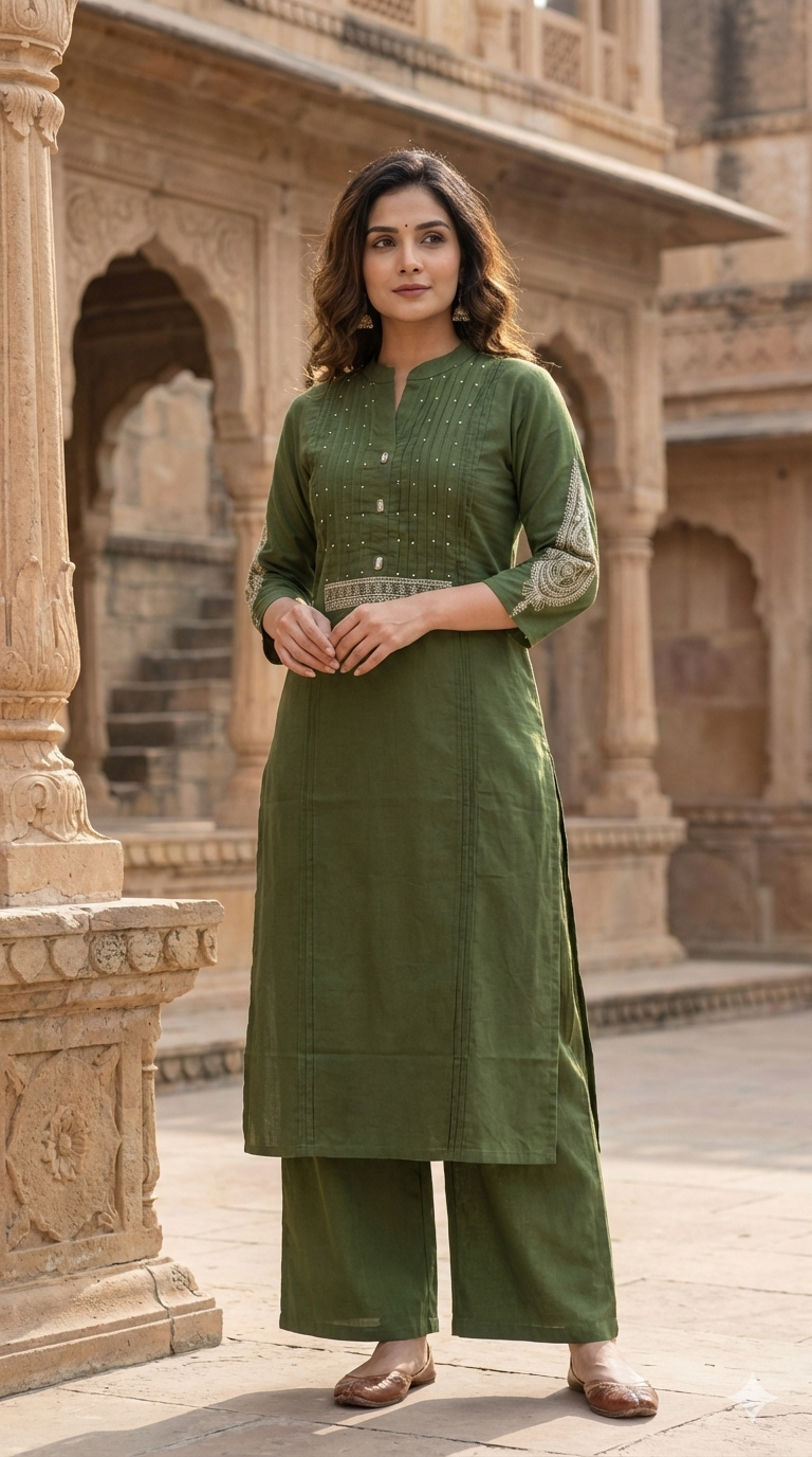 The kurta features embroidery with mirror work and pintucks detailing, creating a rich textured look. Paired with a wide palazzo bottom, this set is perfect for festive gatherings, cultural events, and elegant day wear.
