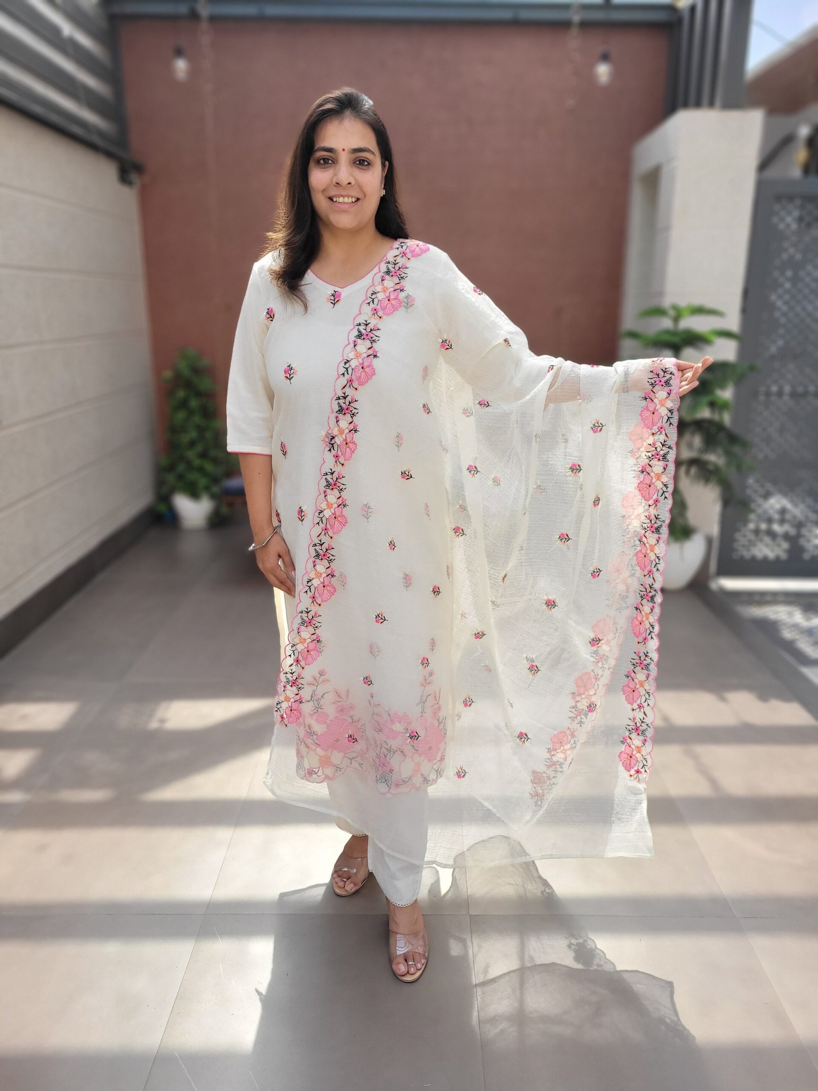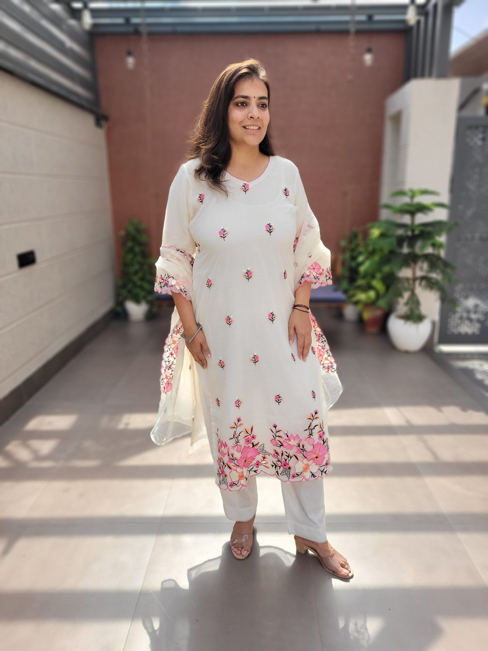 Its refined off-white tone and delicate embroidery make it perfect for festive events, formal gatherings, and elegant daytime occasions.