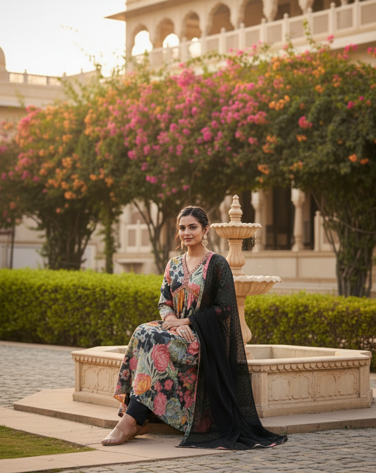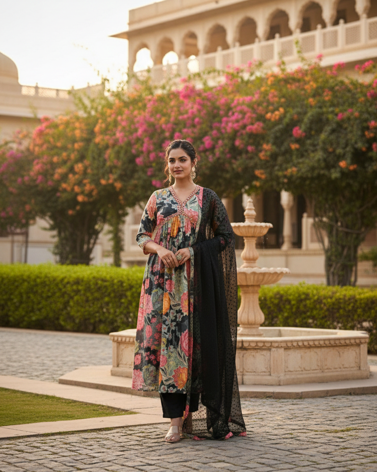 Paired with a soft muslin silk pant and a lightweight dobby chiffon dupatta, this set delivers elegance with comfort. Perfect for festive occasions, celebrations, and designer ethnic outings, it reflects modern luxury with traditional accents.
