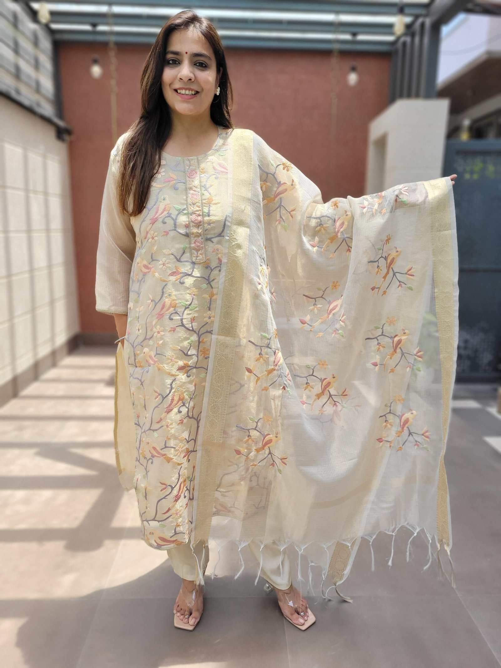 The DU-406 Designer 3PC Set is crafted from luxurious Kota Doriya shimmer fabric, giving it a graceful and festive appeal. Intricate embroidery paired with delicate crochet lace work enhances the sophistication of the outfit, making it a standout choice for special occasions.