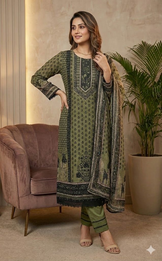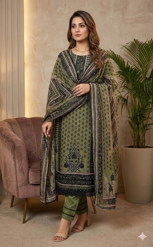 The DU-245 Designer 3PC Set is crafted in pure organza, offering a rich festive shine. Its stone detailing and placement concept design give the outfit a premium look meant for special occasions. The crochet lace work adds a refined traditional touch.