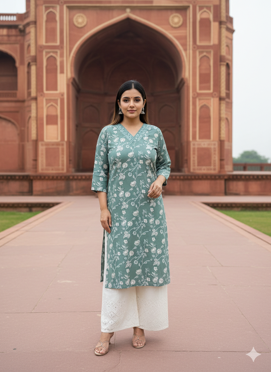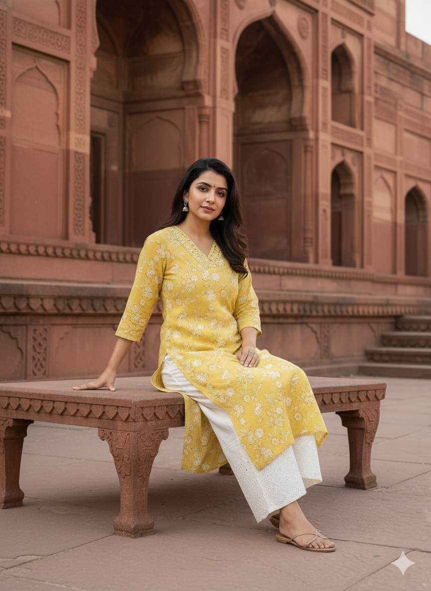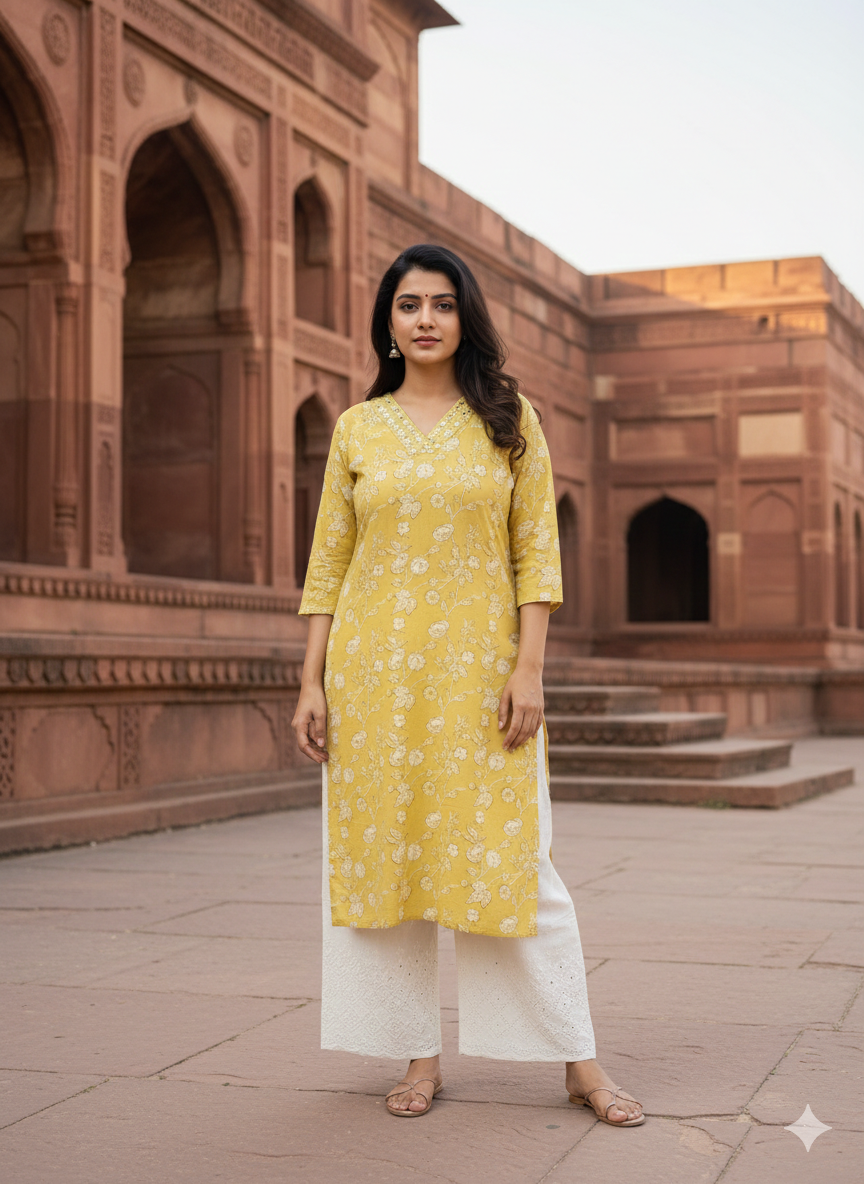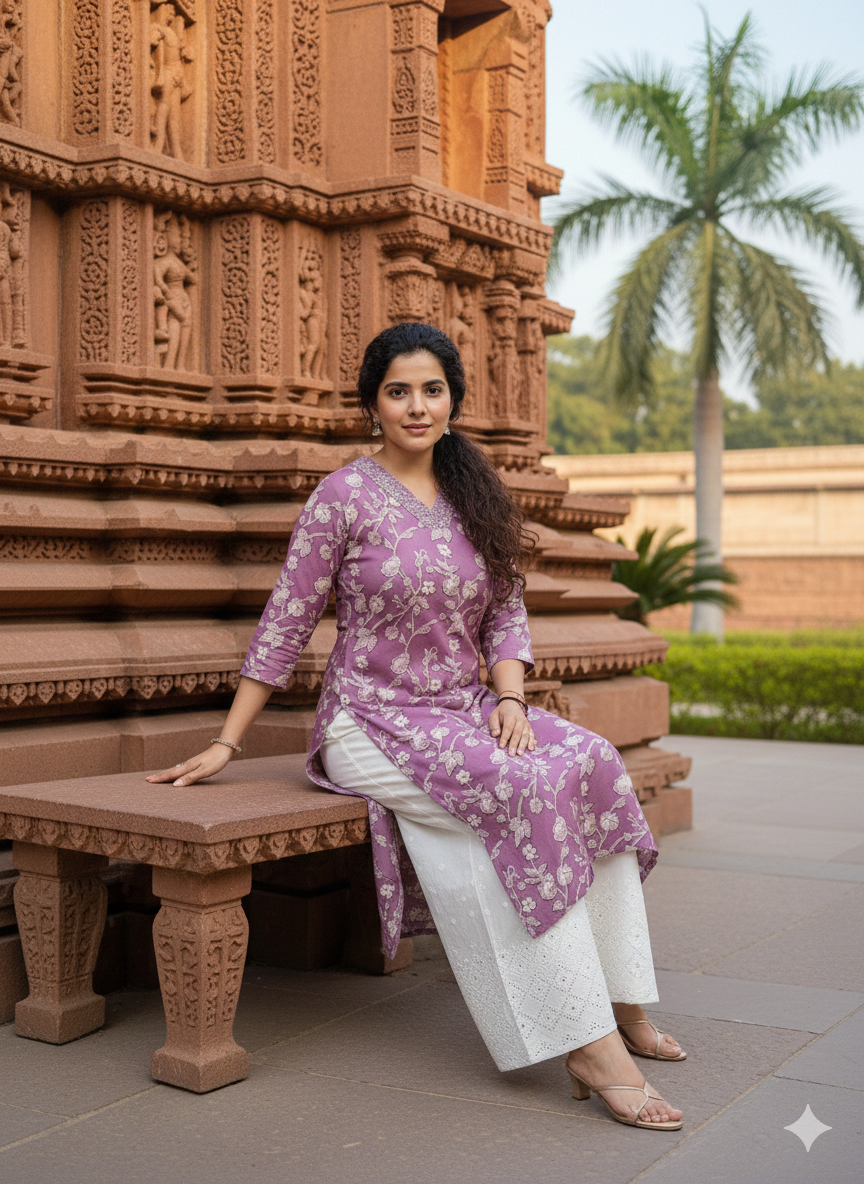 The highlight of this outfit is the 350 mirror embellishments on the neckline, adding a sparkling festive touch. Paired with a beautifully designed Chikankari Palazzo, this 2-piece set exudes elegance, making it ideal for festive gatherings, family functions, or semi-formal occasions.