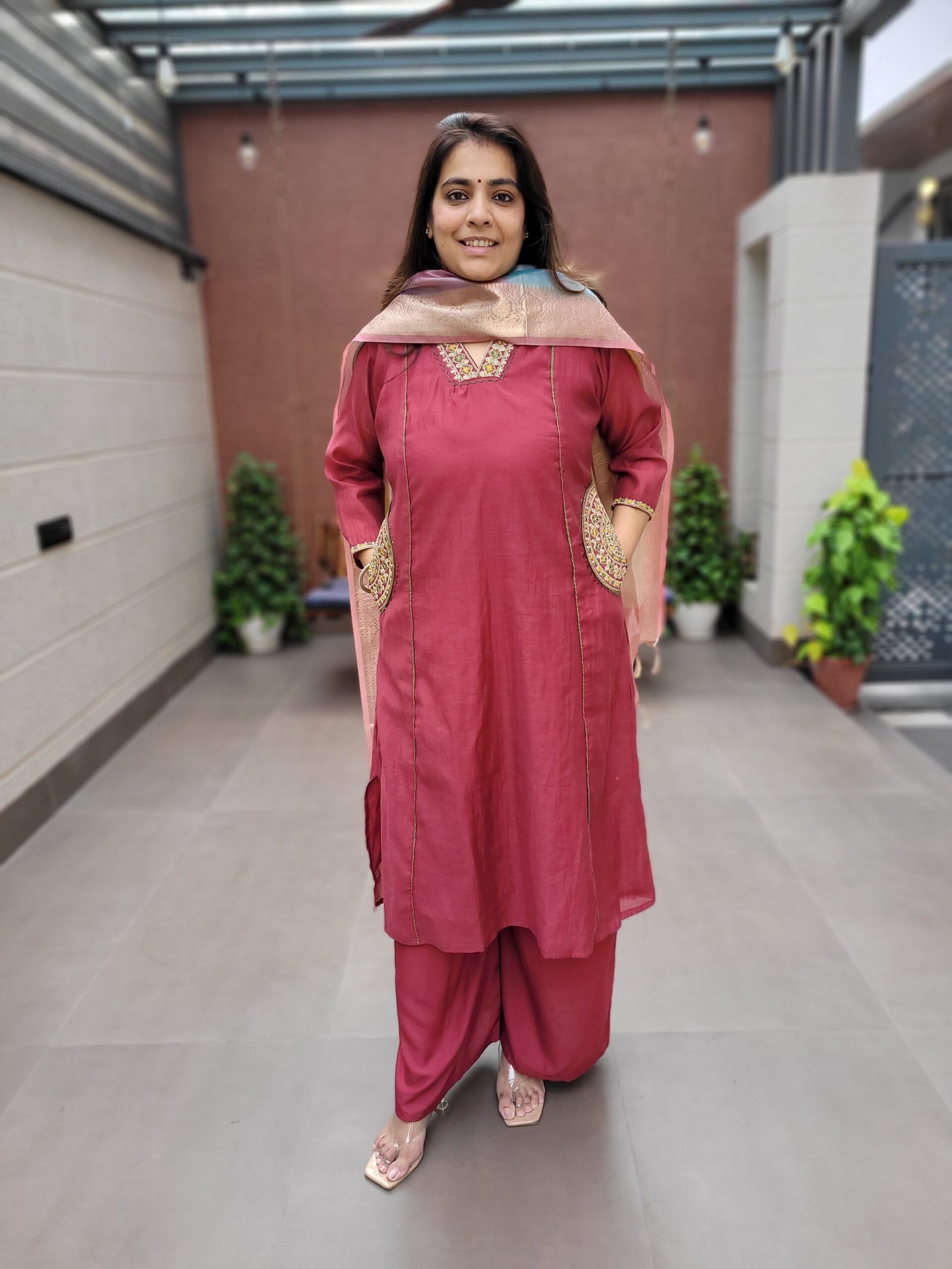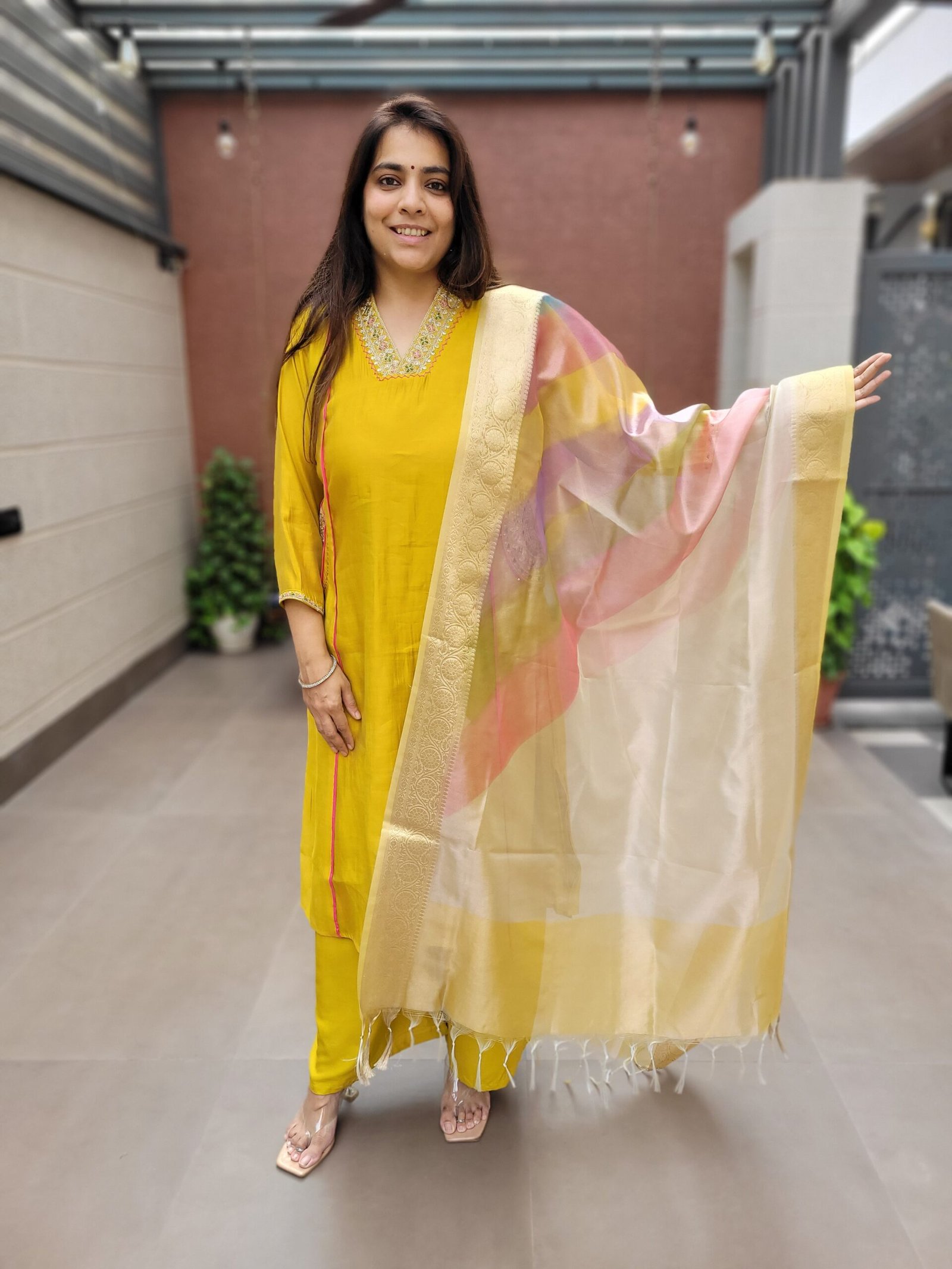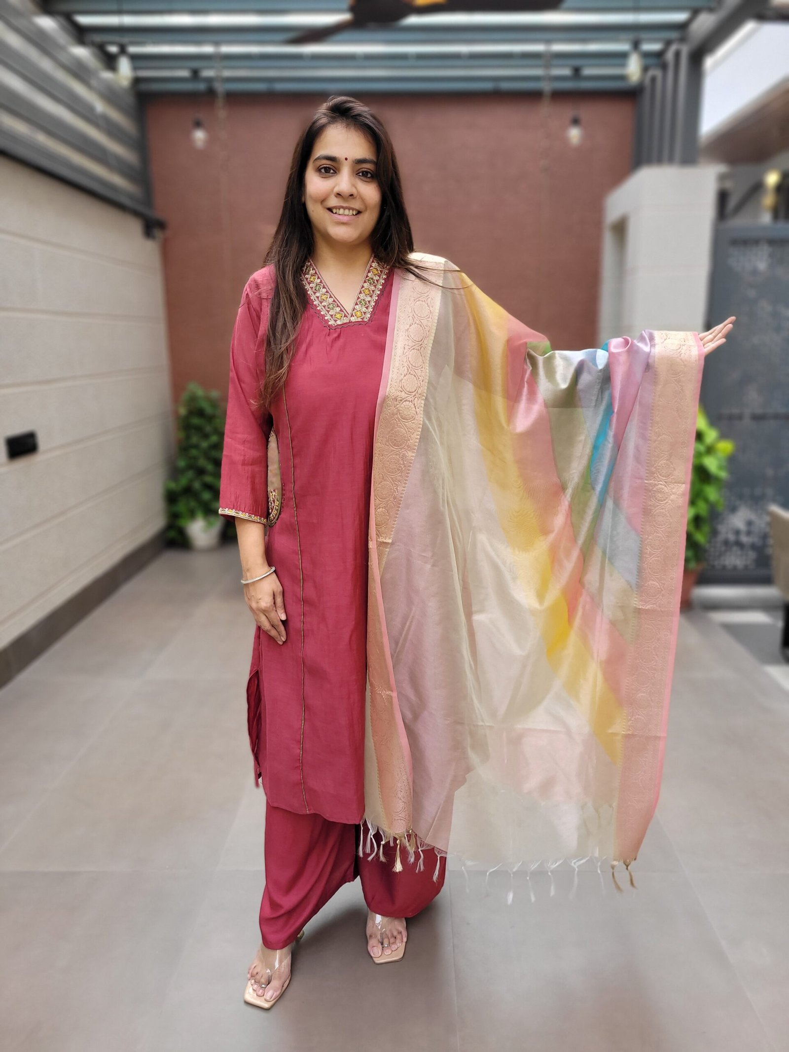 The DU-291 Mul Chanderi 3PC Suit Set is a timeless blend of elegance and sophistication. Crafted from premium Mul Chanderi fabric, it offers a soft, lustrous texture and a refined drape, perfect for both festive occasions and graceful everyday wear.