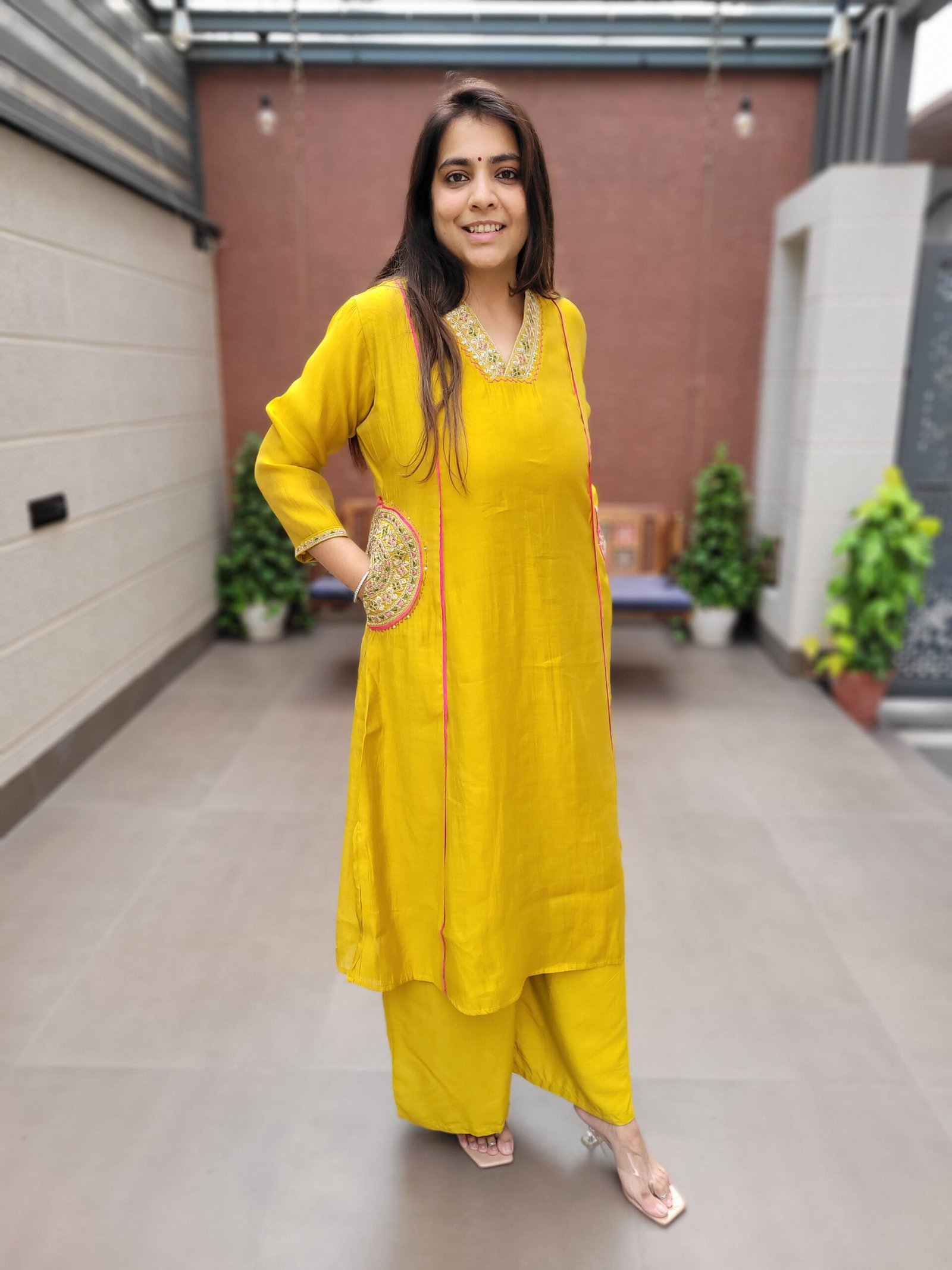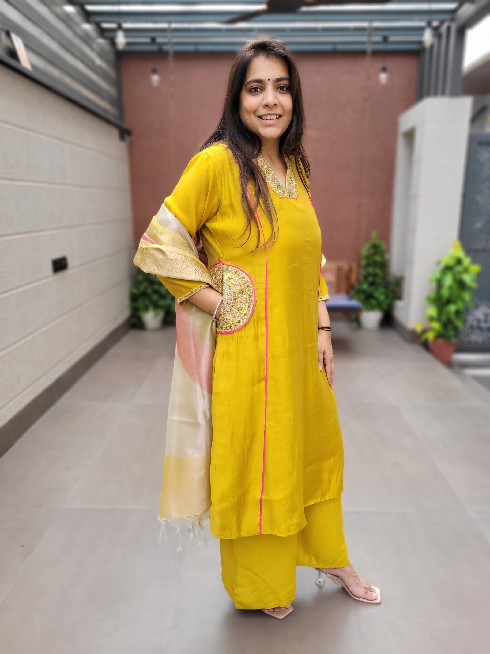 Delicate zari embroidery and stylish embroidered pockets elevate its charm, while the digital print dupatta adds a vibrant and contemporary twist. The cotton lining ensures breathability and comfort, making it suitable for all-day wear.
