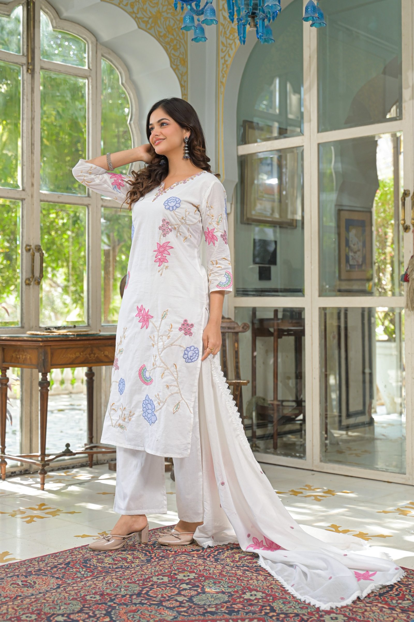 The kurta features beautiful embroidery combined with applique work, creating a rich and detailed design. The cotton lining adds comfort, making it suitable for festive occasions and day events.