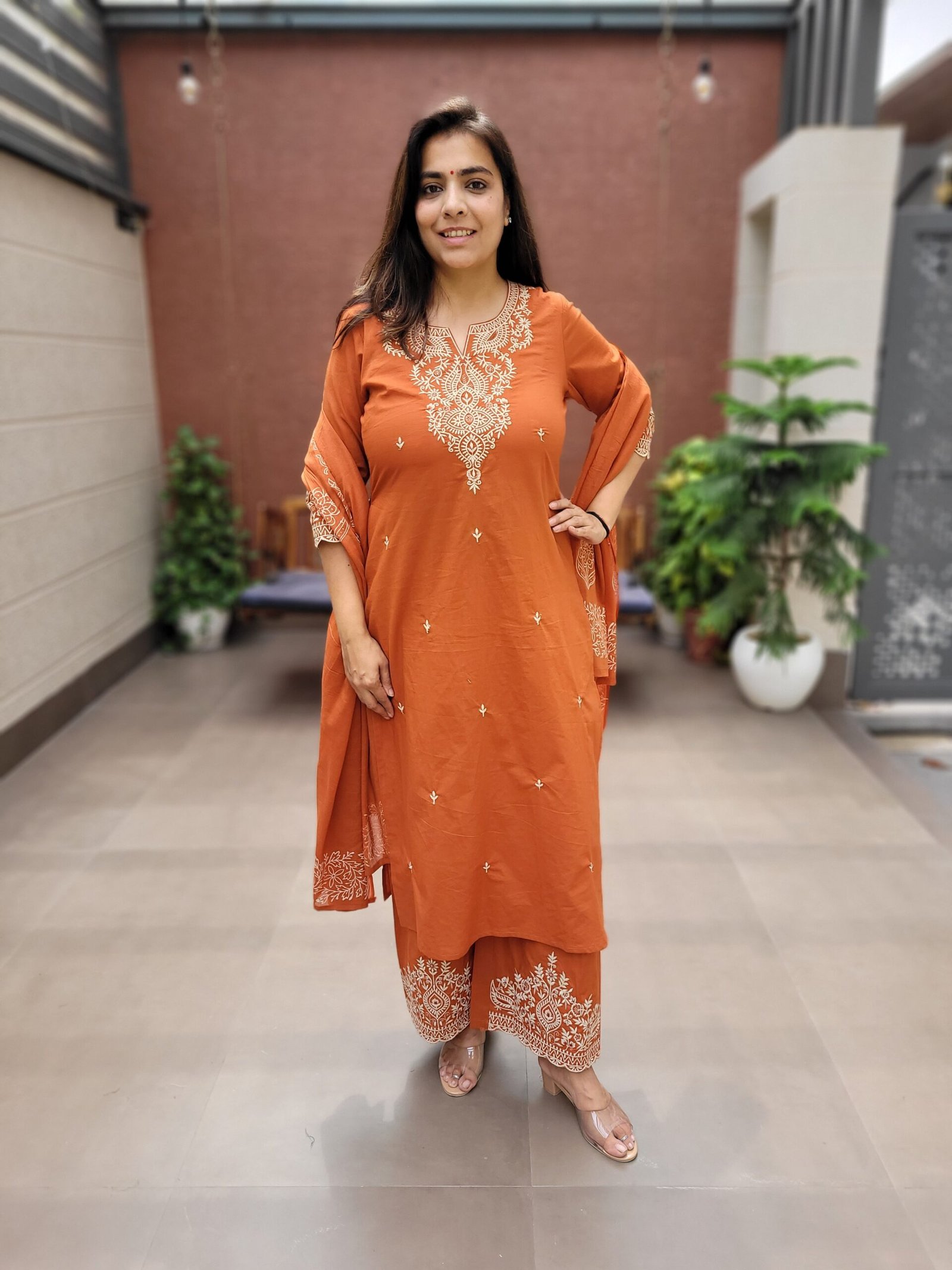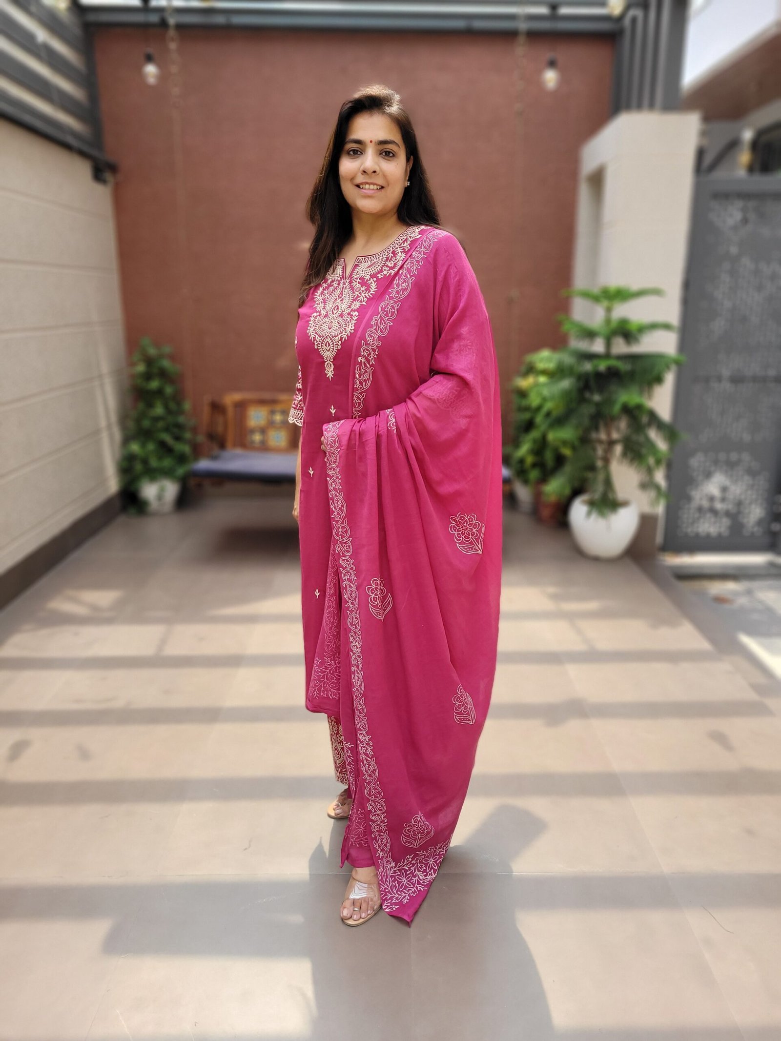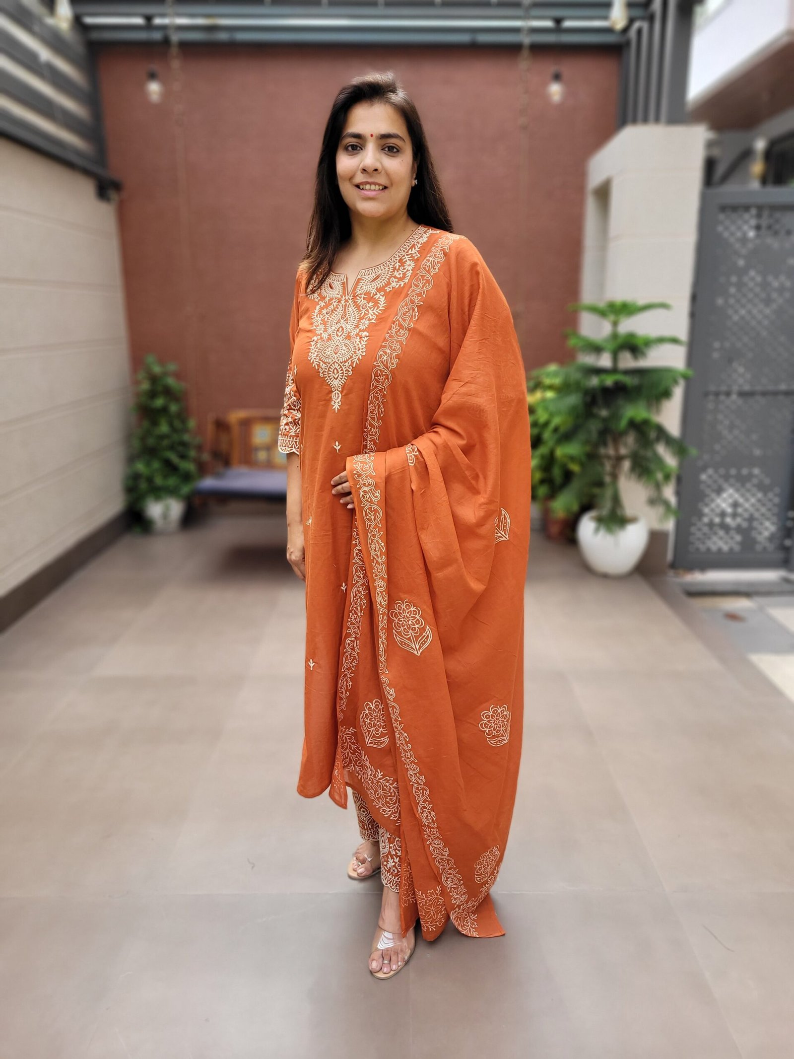 The kurta and palazzo feature beautiful embroidery, while the handblock dupatta adds a traditional touch. Ideal for festive occasions, family functions, and celebrations.
