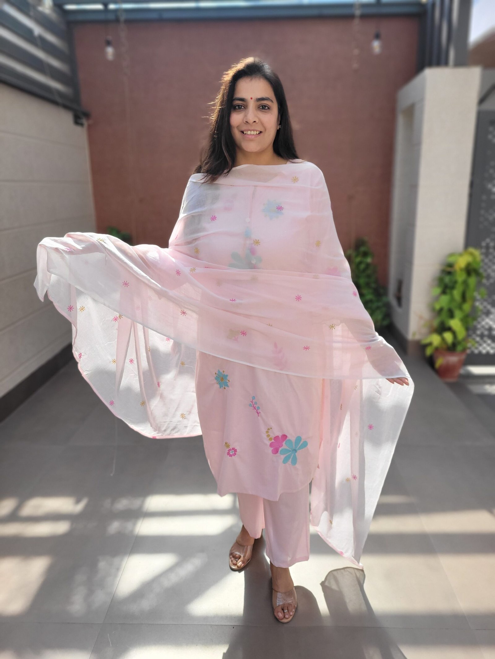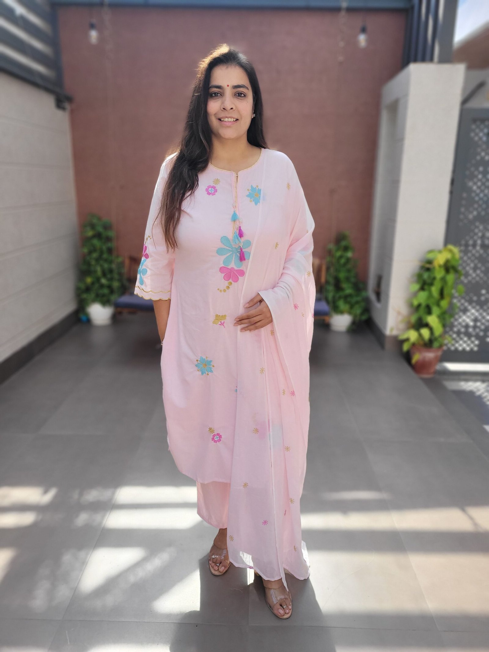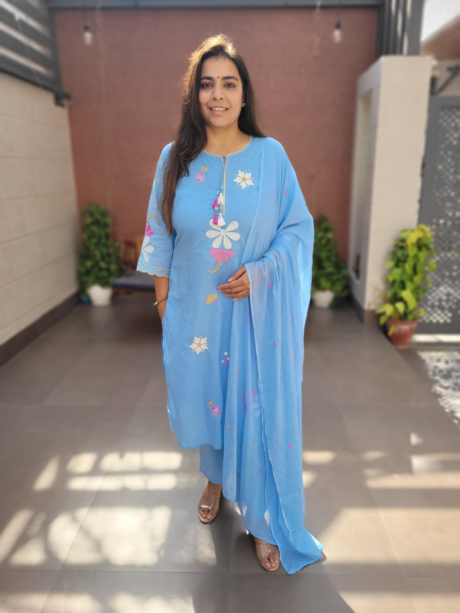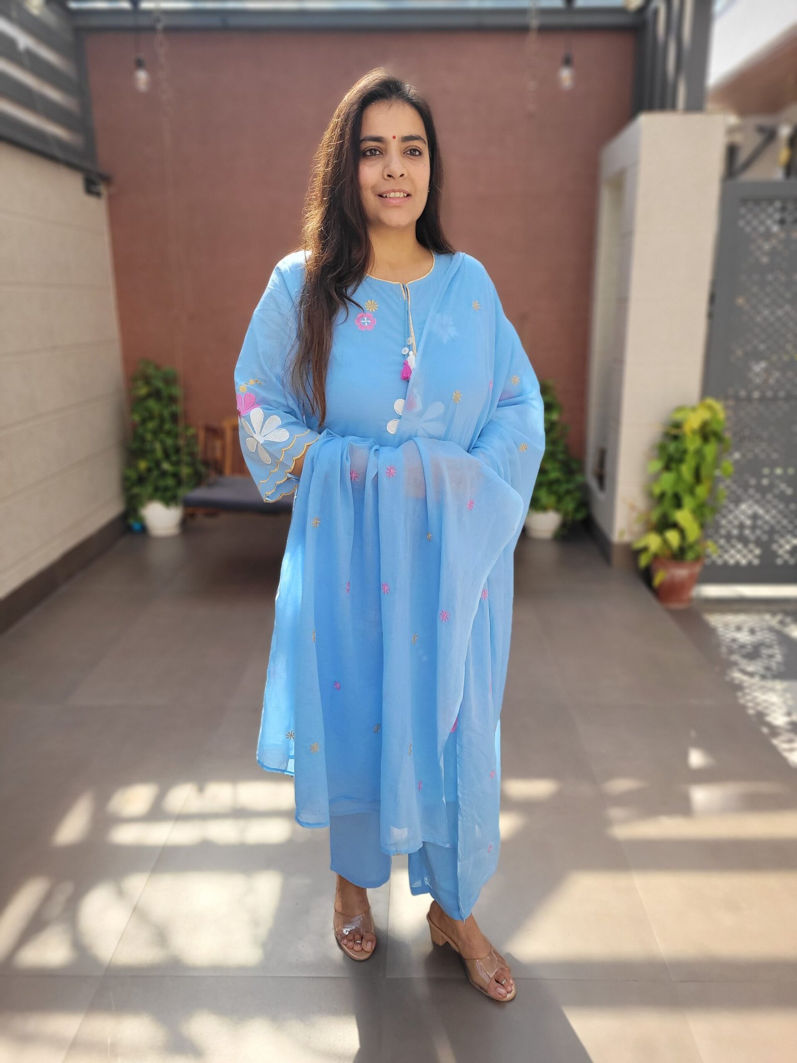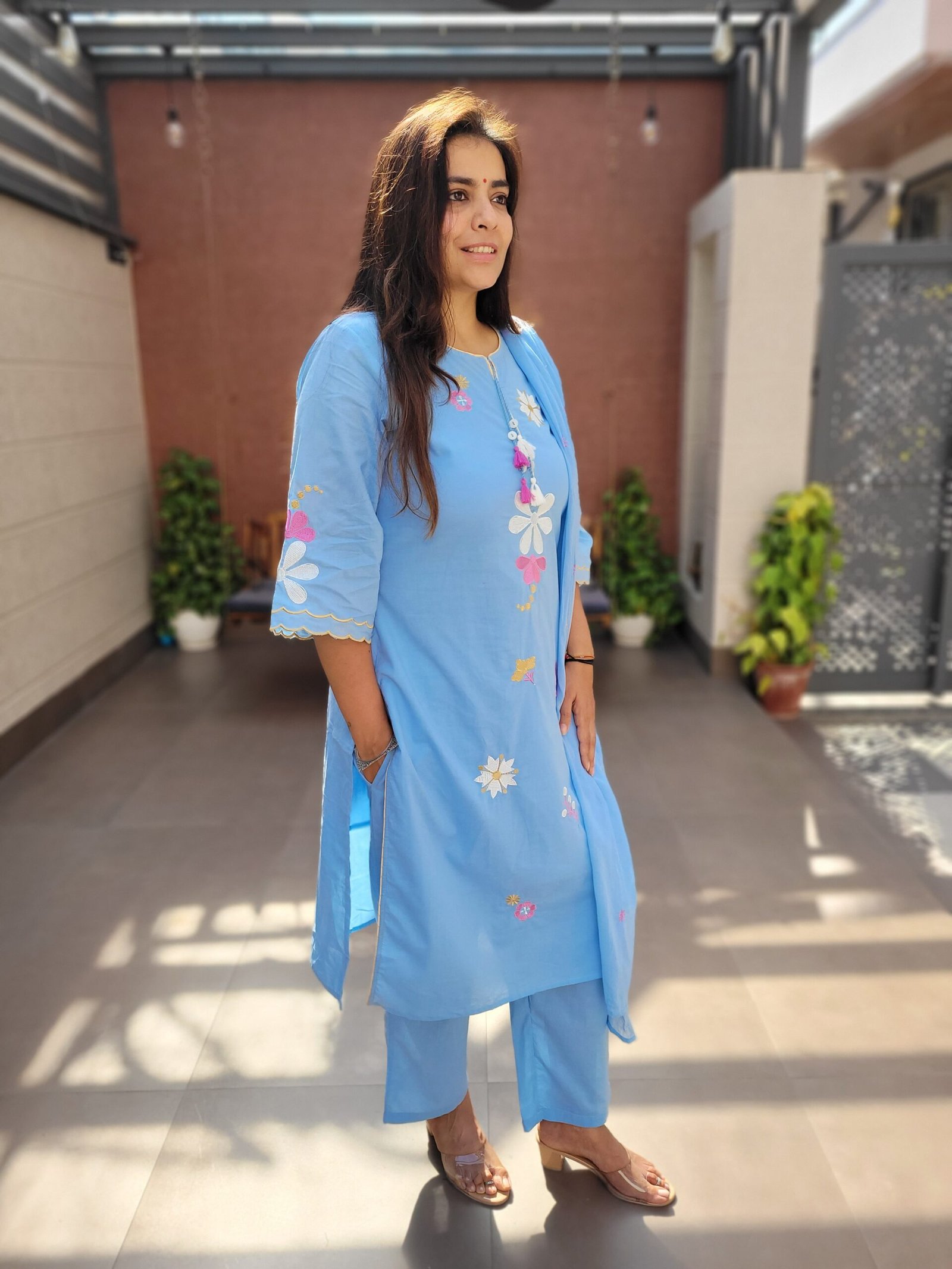 The kurta features delicate embroidery enhanced with beautiful scalloping and tassels detailing, adding a touch of charm and movement to the ensemble. A soft cotton lining ensures comfort throughout the day, while the embroidered dupatta completes the look with coordinated elegance.