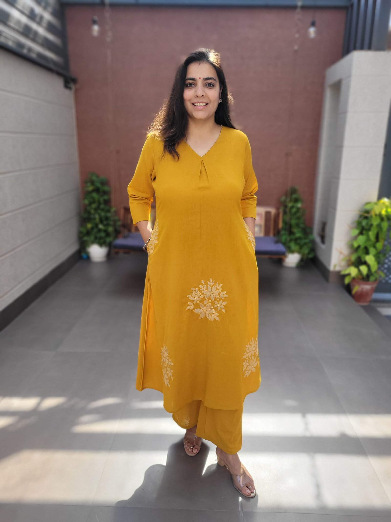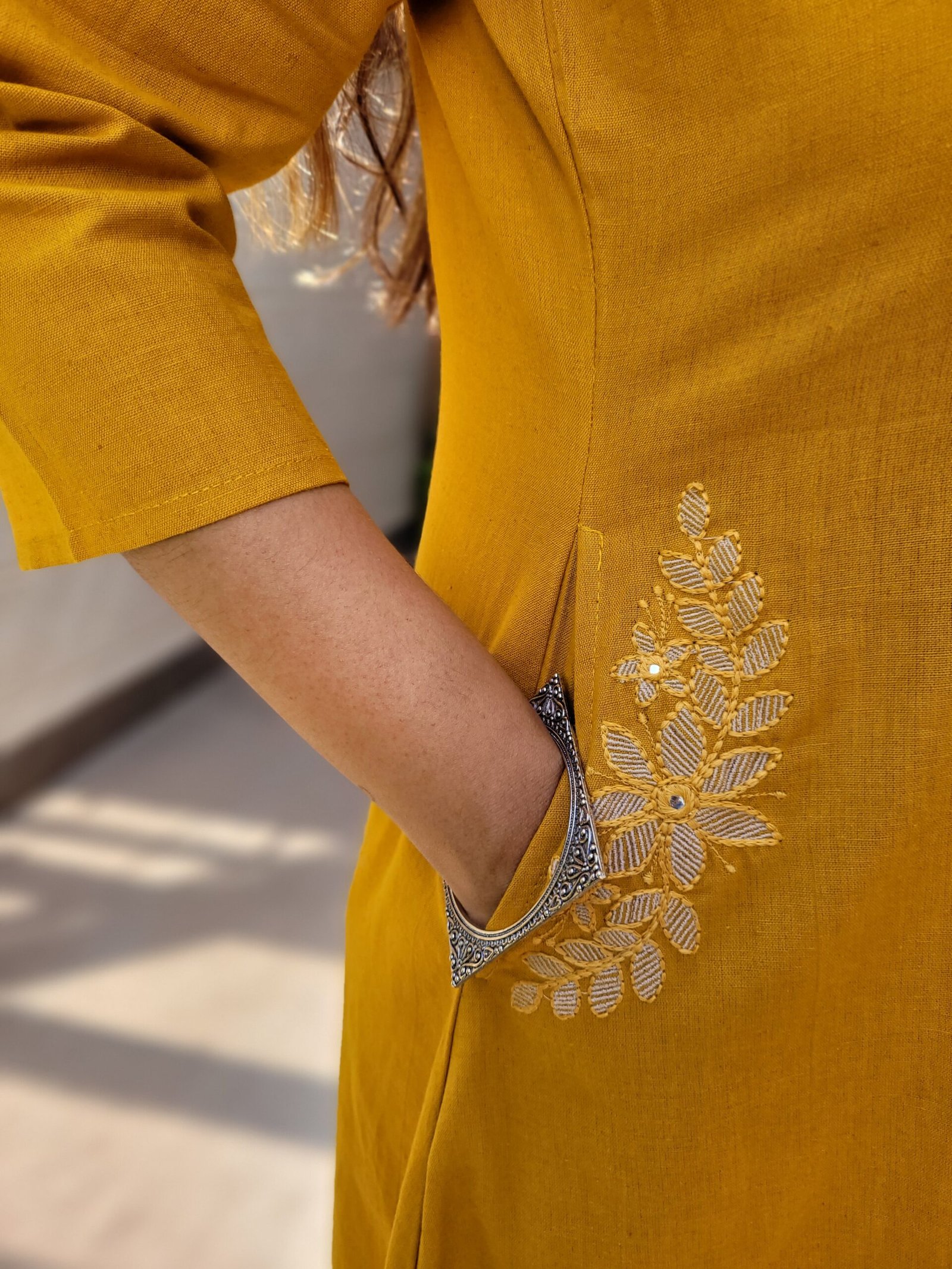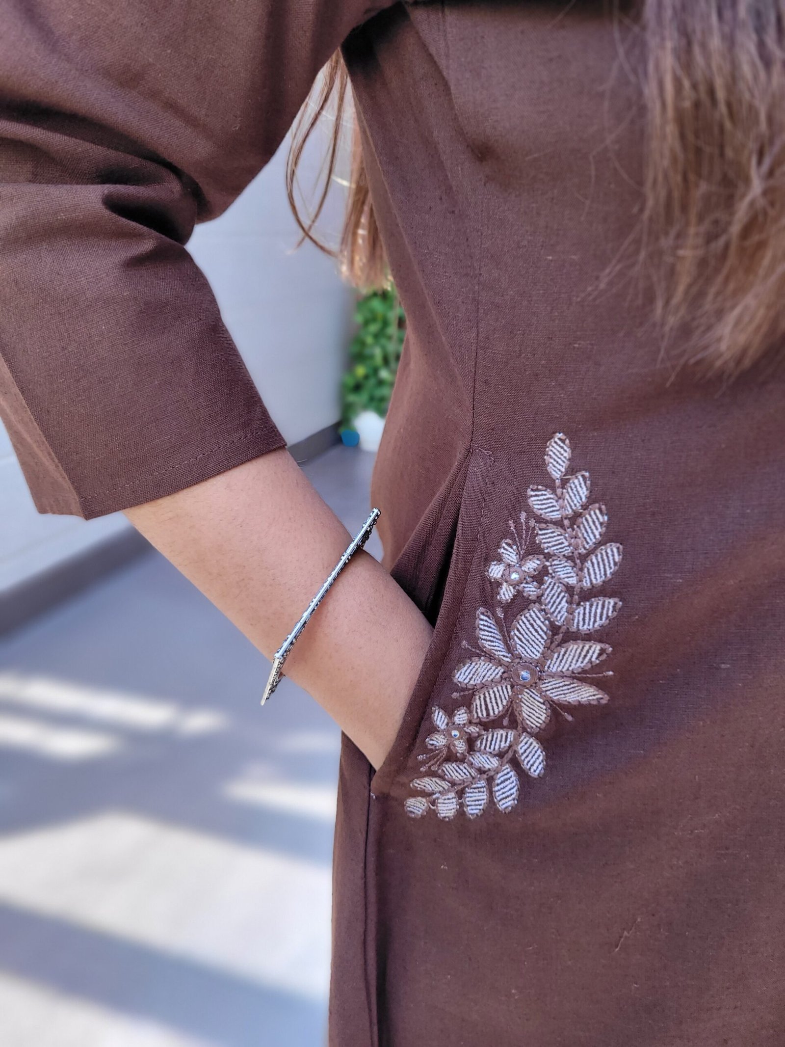 The A-line kurta features an embroidered panel and beautifully embroidered pockets, adding both charm and practicality. Perfect for office wear, casual outings, and day events, this set offers a polished yet relaxed ethnic look.