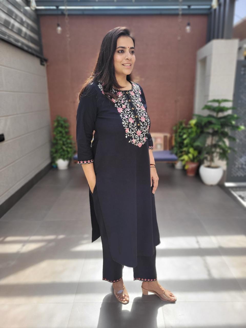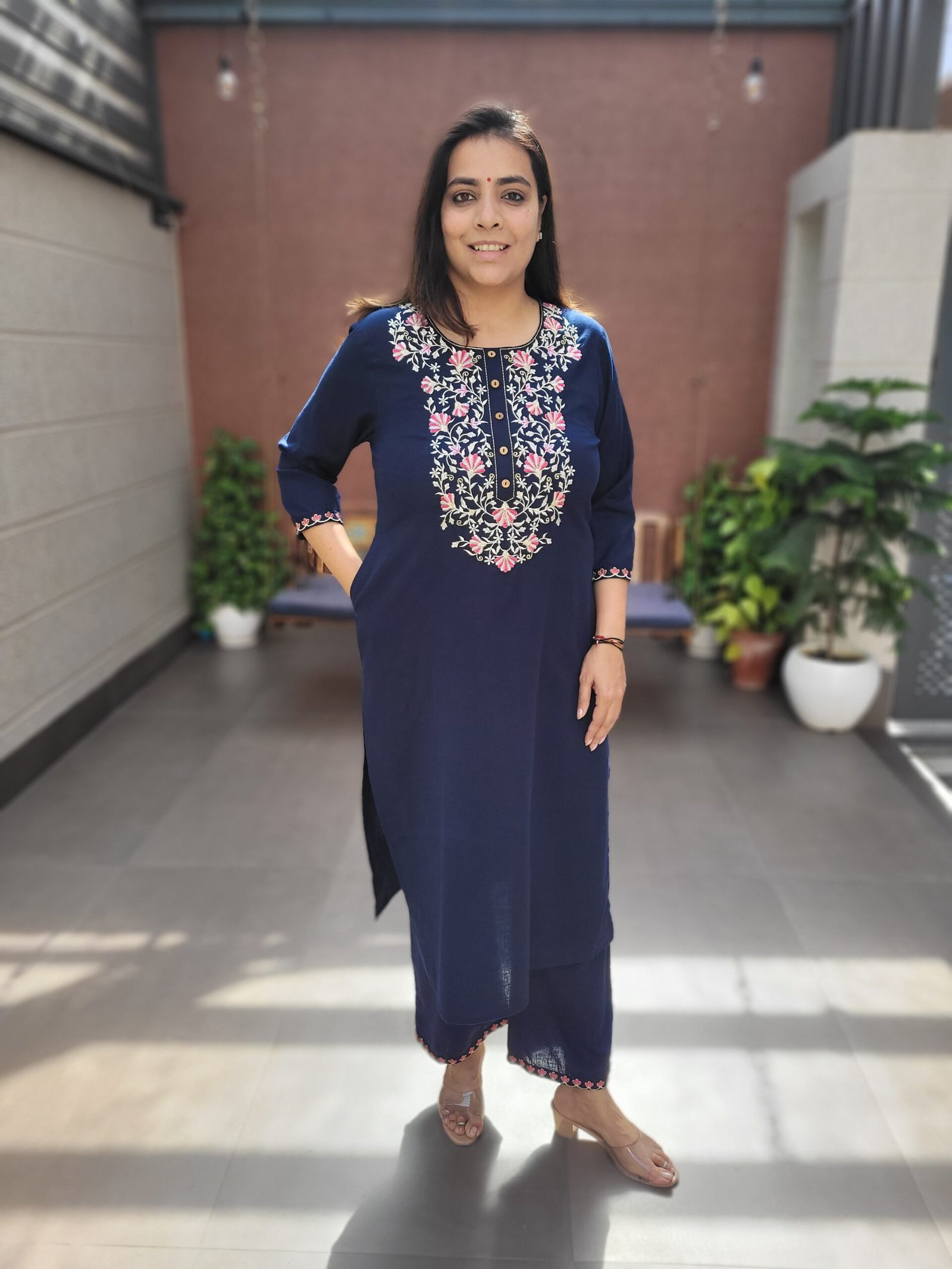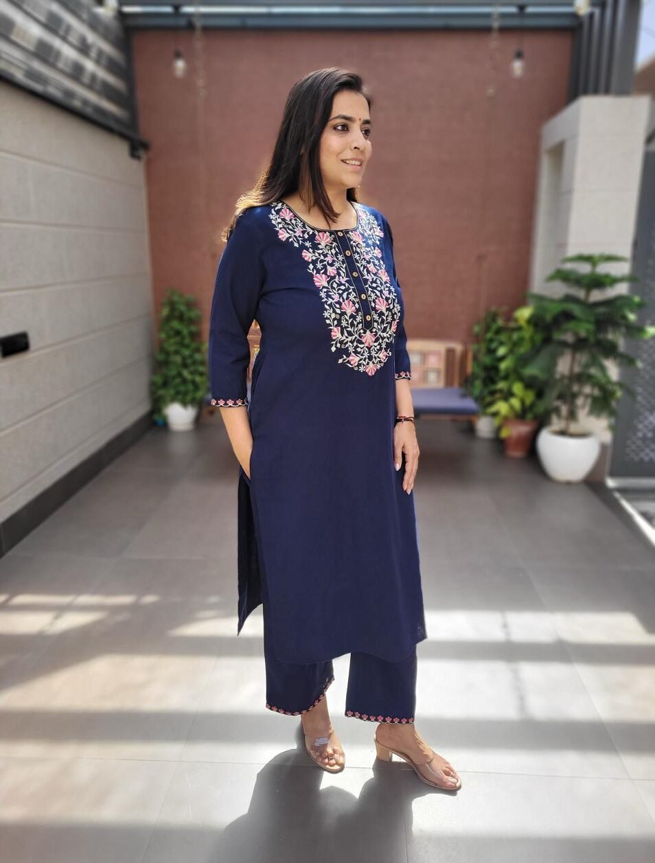 The kurta features an elegant embroidered yoke that adds refined detail, paired with embroidered palazzo pants for a coordinated and stylish finish. Designed for comfort and versatility, this set is perfect for office wear, casual outings, travel, and relaxed festive occasions.