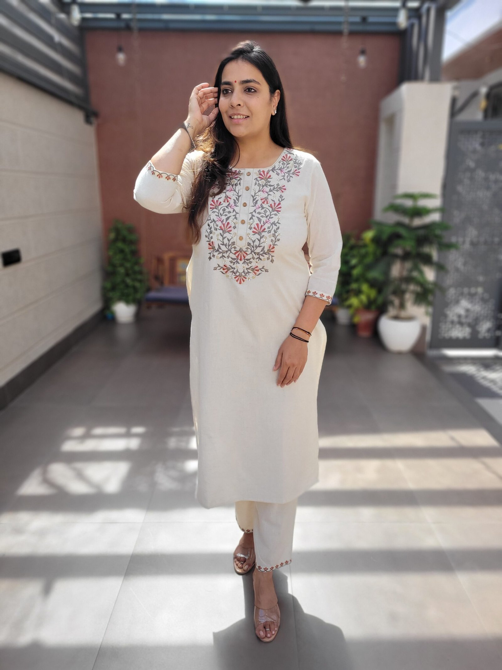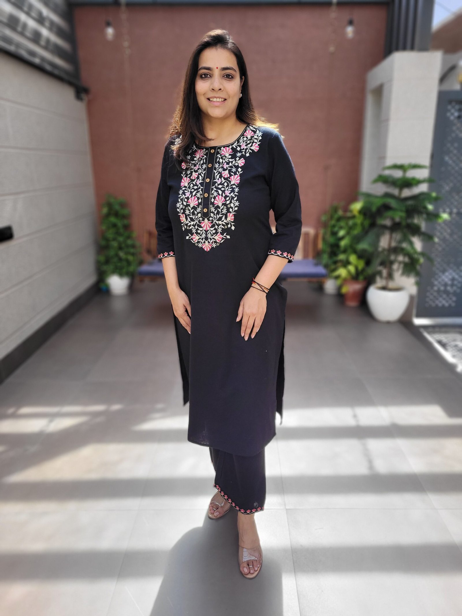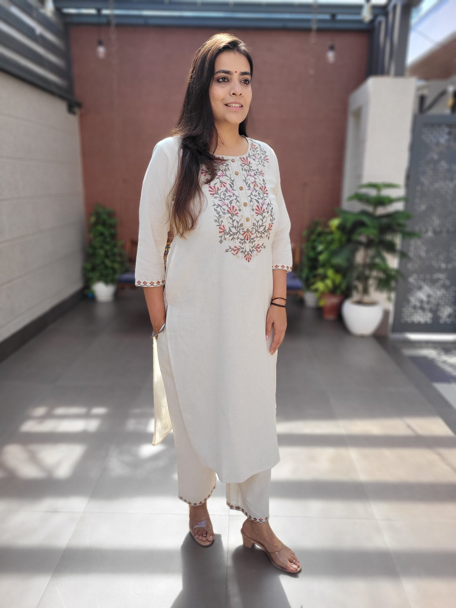 The kurta features an elegant embroidered yoke that adds refined detail, paired with embroidered palazzo pants for a coordinated and stylish finish. Designed for comfort and versatility, this set is perfect for office wear, casual outings, travel, and relaxed festive occasions.